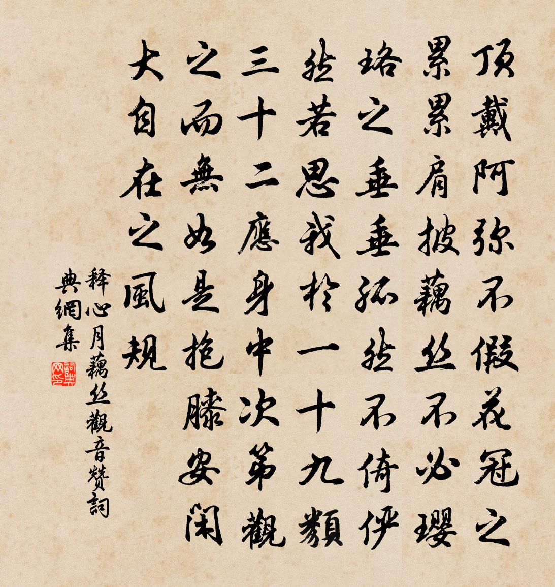 詩詞名句歷史字典書法欣賞書法字典國語詞典說文解字康熙字典古漢語字典標 題 作 者 詩 句 藕絲觀音贊作者:釋心月 朝代:宋代藕絲觀音贊原文頂戴阿彌,不假花冠之累累。肩披藕絲,不必瓔珞之垂垂。孤然不倚,儼然若思。我於一十九類三十二應身中次第觀之,而無如是抱膝安閒大自在之風規。詩詞問答問:藕絲觀音贊的作者是誰?答:釋心月問:藕絲觀音贊寫於哪個朝代?答:宋代釋心月藕絲觀音贊書法欣賞藕絲觀音贊書法作品詩詞推薦五言二首王淹〔宋代〕鐘鼎山林事,都廬一夢中。觀音門裡去,葉葉響悲風。奉使契丹二十八首其二十二學士院端午帖子二蘇轍〔宋代〕南訛初應歷,五日未生陰。靈藥收農錄,薰風拂舜琴。吳興舟中有作王之道〔宋代〕一水濡須百裡間,舉頭遙見水西山。微波不動又終日,安得扁舟送我還。夜行至平羌憩大悲院陸游〔宋代〕憶昨游天台,夜投石橋宿。水聲亂人語,炬火散山谷。穿林有驚鶻,截道多奔鹿。今夕復何夕,此境忽在目。蒼茫絕句趙孟頫〔元代〕春寒惻惻掩重門,金鴨香殘火尚溫。燕子不來花又落,一庭風雨自黃昏。中書連直寒食不歸因懷元九白居易〔唐代〕去歲清明日,南巴古郡樓。今年寒食夜,西省鳳池頭。並上新人直,難隨舊伴遊。誠知視草貴,未免對花愁。鬢髮安陶舟中晁補之〔宋代〕繚繞春堤去欲窮,參差煙塢到還通。依依潤柳侵晨雨,細細吹花傍午風。挽唐吉林詠道戴復古〔宋代〕博雅林夫子,隱居城市中。家貧書甚富,學苦字尤工。四海交名勝,諸文辨異同。阿戎談更好,端不負家風。郡圃上已二首楊萬里〔宋代〕旋收雨夕放晴晨,禊月風光正可人。間白參紅方是錦,疏桃散李不成春。夜寒陸游〔宋代〕斗帳重茵香霧重,膏粱那可共功名。三更騎報河冰合,鐵馬何人從我行。次史髯韻二首陳造〔宋代〕已誤西湖鷗鷺約,客舟西上更徘徊。故人益嘆天涯遠,懷抱何從得好開。南山廣莫軒樓鑰〔宋代〕廣莫乘風隘九州,亂山無數點平疇。一千里外在吾目,三十年來無此游。地下天高俱歷歷,鳶飛魚躍兩悠悠。昌黎和周仲嘉再示三篇王洋〔宋代〕舊日衣冠說開林,風流曾不減山陰。百年人物千山秀,萬里功名天下心。族姓人人夸盛事,溪山處處稱高吟。後生和陶詠三良蘇軾〔宋代〕此生太山重,忽作鴻毛遺。三子死一言,所死良已微。賢哉晏平仲,事君不以私。我豈犬馬哉,從君求蓋帷。殺身謝范老問病范成大〔宋代〕三椽一席度秋冬,造化兒嬉困此翁。帖有王書難治眩,文如陳檄不驅風。骨枯似櫱膚如臘,發織成氈鬢作蓬。點檢題玉泉溪湘驛女子〔唐代〕紅葉醉秋色,碧溪彈夜弦。佳期不可再,風雨杳如年。陳經略生朝四首汪應辰〔宋代〕媯姓從來莫與京,傳家初不為金籯。只今八桂蒼蒼處,倍覺中台兩兩明。南徼不聞刁斗擊,北轅行見袞衣迎。定知奉和虢州劉給事使君三堂新題二十一詠竹徑韓愈〔唐代〕無塵從不掃,有鳥莫令彈。若要添風月,應除數百竿。即席王安石〔宋代〕曲沼融融泮盡澌,暖煙籠瓦碧參差。人情共恨春猶淺,不問寒梅有幾枝。戲雲龍山人二絕秦觀〔宋代〕芳草未應羞鵯鵊,潛鱗終是表提壼。蔡經背上痕猶在,更念 * 指爪無。名句推薦死別已吞聲,生別常惻惻。杜甫《夢李白二首·其一》 鳥向平蕪遠近,人隨流水東西。劉長卿《謫仙怨·晴川落日初低》 執道循理,必從本始,順為經紀,禁伐當罪,必中天理。佚名《黃帝四經·經法·四度》 月落沙平江似練。望盡蘆花無雁。張炎《清平樂·候蛩淒斷》 萬種思量,多方開解,只恁寂寞厭厭地。柳永《憶帝京·薄衾小枕涼天氣》 燕子來時新社,梨花落後清明。晏殊《破陣子·春景》 渭城朝雨浥輕塵,客舍青青柳色新。王維《渭城曲 / 送元二使安西》 香餌之下,必有懸魚;重賞之下,必有死夫。黃石公《三略·上略》 嚴妝欲罷囀黃鸝,飛上萬年枝。和凝《喜遷鶯·曉月墜》 御柳如絲映九重,鳳凰窗映繡芙蓉。溫庭筠《楊柳枝》