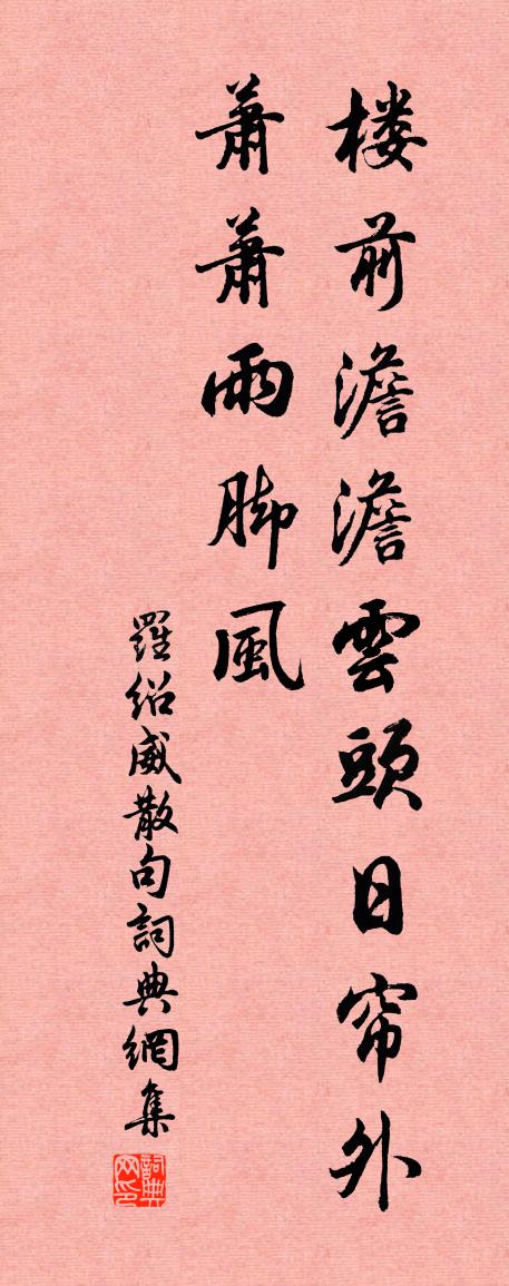 詩詞名句歷史字典書法欣賞書法字典國語詞典說文解字康熙字典古漢語字典標 題 作 者 詩 句 句作者:羅紹威 朝代:唐代句原文樓前澹澹雲頭日,簾外蕭蕭雨腳風。詩詞問答問:句的作者是誰?答:羅紹威問:句寫於哪個朝代?答:唐代問:句是什麼體裁?答:句羅紹威句書法欣賞句書法作品注釋全唐詩:卷734-3詩詞推薦偈頌一百零九首釋可湘〔宋代〕摩竭陀國,親行此令。從上以來,孰敢違命。次韻李袁州絕句七首趙蕃〔宋代〕先生句法從江夏,今代詞人孰比肩。戲出小詩還會否,要收萬斛作泓泉。龜堂雜興陸游〔宋代〕 * 安坐地爐溫,無位真人出面門。世上不知何歲月,斷鍾殘角送黃昏。御街行辛棄疾〔宋代〕闌乾花四花山無花數。供望眼、朝與暮。好風催雨過山來,吹盡一花煩暑。紗廚如霧,簟紋如水,別有生涼處。冰秘省避暑抵暮乃出曾幾〔宋代〕蝸廬何以度袢延,竟日蓬山一洗湔。陰翳樹林無六月,風涼殿閣是諸天。政須深隱似玄豹,不用懷歸如杜鵑。咄咄調宜州冷官不赴朱繼芳〔宋代〕瘴海南邊路淺深,客愁不待嶺猿吟。無人喚得涪翁起,分我桄榔橄欖陰。栩菴同步偶成白玉蟾〔宋代〕枯木冷灰甘寂寞,片雲孤月自優遊。君王平生皆如夢,我兩眉間不著愁。牧豎崔道融〔唐代〕牧豎持蓑笠,逢人氣傲然。臥牛吹短笛,耕卻傍溪田。石魚湖上醉歌元結〔唐代〕序:漫叟以公田米釀酒,因休暇,則載酒於湖上,時取一醉。歡醉中,據湖岸,引臂向魚取酒,使舫載之,偏飲坐和景仁卜居許下司馬光〔宋代〕壯齒相知約歲寒,索居今日鬢俱斑。拂衣已解虞卿印,築室何須謝傅山。許下田園雖有素,洛中花卉足供閒。它年發廣州蘇軾〔宋代〕朝市日已遠,此身良自如。三杯軟飽後,(浙人謂飲酒為軟飽。)一枕黑甜余。(俗謂睡為黑甜。)蒲澗疏鍾外,偈頌六十五首釋普濟〔宋代〕鷲嶺拈花,少林得髓。病痛一般,脈息有異。脈得著目前見鬼。脈不著死而不吊。李公擇求黃鶴樓詩因記舊所聞於馮當世者蘇軾〔宋代〕黃鶴樓前月滿川,抱關老卒飢不眠。夜聞三人笑語言,羽衣著屐響空山。非鬼非人意其仙,石扉三叩聲清圓。洞中蘇文饒往昌國意頗憚之送以詩因勉之陳瓘〔宋代〕已聞舟楫具,那得苦留君。雨過霜風急,帆飛雪浪分。長途方策足,暇日正論文。功業他年事,風波豈足雲。送謝中舍二首歐陽修〔宋代〕嘉聞嘉譽藹淮壖,又看吳帆解畫船。隴畝遺民談舊政,江山餘思入新篇。人生白首吾今爾,仕路青雲子勉旃。舉棹後陵永慶院在大西門外不及一里蓋王建墓也有陸游〔宋代〕陵闕淒涼俯舊邦,恨流袞袞似長江。穿殘已嘆金鳧盡,缺落空餘石馬雙。攫飯飢烏占寺鼓,避人飛鼠上經幢。阿和楊柳枝侯善淵〔元代〕偃息團*玩寶窺。目無疵。滌除玄覽似嬰兒。正容儀。欲問今宵何處也。赴仙期。滿船空載月明歸。上瑤池。正月五日謁放翁留飲歡甚蘇泂〔宋代〕若人大愧中,不作螻蟻夢。春風鬢須綠,文字凌屈宋。昨朝我訪之,杯酒頗自奉。魚蝦雜淮海,狼藉蔬果眾。妍譚挽張雅州李流謙〔宋代〕酣飽風煙德有芽,從來三戟是張家。翩翩群從同時貴,落落高門一世華。人自不欺華用忍,身如可贖但空嗟。路人讀章嘉甫詩唐仲友〔宋代〕句法亡來久,詩壇忽有人。看君喔字苦,勝我食芝新。國史空遺恨,竿門未識真。尚須樽酒細,非效捧心顰。名句推薦楊花落盡子規啼,聞道龍標過五溪。李白《聞王昌齡左遷龍標遙有此寄》 十年磨一劍,霜刃未曾試。賈島《劍客 / 述劍》 一日官軍收海服,驅牛駕車食牛肉,歸來攸得牛兩角。元稹《田家詞 / 田家行》 常思某人德業勝於我,某人學問勝於我,則可以自慚矣。王永彬《圍爐夜話·第六一則》 名花傾國兩相歡,常得君王帶笑看。李白《清平調·名花傾國兩相歡》 務本節用財無極。荀子《荀子·成相》 將軍發白馬,旌節度黃河。李白《發白馬》 清漏漸移相望久,微雲未接過來遲。李商隱《辛未七夕》 空山松子落,幽人應未眠。韋應物《秋夜寄邱員外 / 秋夜寄丘二十二員外》 無情不似多情苦。一寸還成千萬縷。晏殊《玉樓春·春恨》