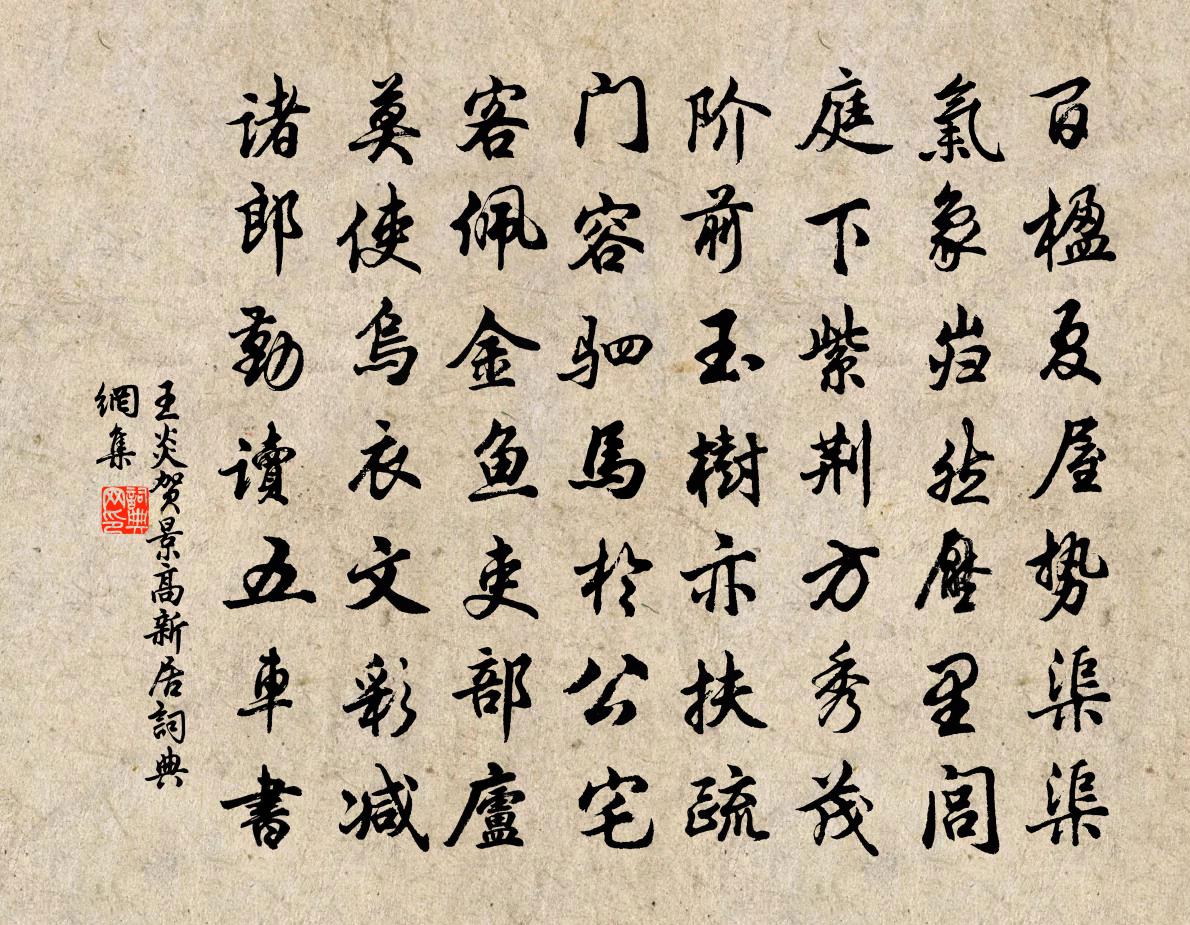 詩詞名句歷史字典書法欣賞書法字典國語詞典說文解字康熙字典古漢語字典標 題 作 者 詩 句 賀景高新居作者:王炎 朝代:宋代賀景高新居原文百楹夏屋勢渠渠,氣象巋然壓里閭。庭下紫荊方秀茂,階前玉樹亦扶疏。門容駟馬於公宅,客佩金魚吏部廬。莫使烏衣文彩減,諸郎勤讀五車書。詩詞問答問:賀景高新居的作者是誰?答:王炎問:賀景高新居寫於哪個朝代?答:宋代王炎賀景高新居書法欣賞賀景高新居書法作品詩詞推薦題家雷鋒海棠小亭壁曹勛〔宋代〕萬點勻紅上海棠,小亭無處著春光。放教曉日滋新彩,要問東君學醉妝。南鄉子汪莘〔宋代〕茅舍起疏煙。家在寒溪阿那邊。修竹當籬梅當戶,蕭然。問是堯天是葛天。風雨入新年。惟恐春陰咽管弦。綠酒一將赴京留獻令公盧綸〔唐代〕沙鶴驚鳴野雨收,大河風物颯然秋。力微恩重諒難報,不是行人不解愁。減字木蘭花歐陽修〔宋代〕留春不住。燕老鶯慵無覓處。說似殘春。一老應無卻少人。風和月好。辦得黃金須買笑。愛惜芳時。莫待無花空折周孚與高伯庸同游王氏庵歸而閭丘仲詩至因次董嗣杲〔宋代〕法水堪湔垢,僧廬自辟塵。飯炊雲子熟,茶泛乳花勻。草草情何厚,匆匆跡易陳。他年輞川上,為畫兩綸巾。小師智臨禪客寫真求贊釋正覺〔宋代〕雲石雪松,歲寒之友從;曉月霜鍾,清白之音容。自樂也村歌社舞,平懷也牧笛歸農。暴雨卒風,潛神堂而避陣;姚岩寺路懷友(一作桃岩懷賈島)顧非熊〔唐代〕路向姚岩寺,多行洞壑間。鶴聲連塢靜,溪色帶村閒。疏葉秋前渚,斜陽雨外山。憐君不得見,詩思最相關。重九次七兄韻周必大〔宋代〕追嘆尊有酒,適興樂無荒。風雨如知節,塤箎共陟岡。恁高臨雁翅,履險失羊腸。醉墨淋漓處,珍材費樂浪。虞美人(趙文鼎生日)辛棄疾〔宋代〕翠屏羅幕遮前後。舞袖翻長壽。紫髯冠佩御爐香。看取明年歸奉、萬年觴。今宵池上蟠桃席。咫尺長安日。寶煙飛下程趙汝鐩〔宋代〕下程疑頗早,店主勸予休。今晚莫貪路,明朝便到州。疏籬編馬眼,新筍護貓頭。六七歲童子,一人隨數牛。淳熙已酉二月二日皇帝登寶位鎡獲廁廷紳輒成張鎡〔宋代〕小臣奕世沐深恩,寓直蓬山三十春。空抱一編無所用,也叨拜望屬車塵。靜坐池亭二首楊萬里〔宋代〕胡床倦坐起憑欄,人正忙時我正閒。卻是閒中有忙處,看書才了又看山。昇平公主舊第羅隱〔唐代〕乘鳳仙人降此時,玉篇才罷到文詞。兩輪水磑光明照,百尺鮫綃換好詩。帶礪山河今盡在,風流樽俎見無期。壇場旅懷江為〔唐代〕迢迢江漢路,秋色又堪驚。半夜聞鴻雁,多年別弟兄。高風雲影斷,微雨菊花明。欲寄東歸信,裴回無限情。過驪山薛能〔唐代〕丹雘蒼蒼簇背山,路塵應滿舊簾間。玄宗不是偏行樂,只為當時四海閒。次韻和縉叔游仲容西園二首蘇洵〔宋代〕栽松成徑百餘尺,隔徑開堂似兩家。厭事共邀終日飲,渴春先賞未開花。客來庭樹鳴寒鵲,酒入肌膚憶冷蛇。衰病偶題翁卷〔宋代〕綠樹何稠疊,清風稍羨餘。枕縈雲片片,簾透雨疎疎。修筧通泉壑,殘碑出野鋤。丘陵知幾變,耕稼學陶漁。游王羽士山房殷堯藩〔唐代〕落日半樓明,琳宮事事清。山橫萬古色,鶴帶九皋聲。易作神仙侶,難忘父子情。道人應識我,未肯說長生。孤山於石〔宋代〕老梅半樹倚枯槎,路入湖心第幾家。水月荒涼誰復問,遊人多隻看荷花。采芑佚名〔先秦〕薄言采芑,於彼新田,呈此菑畝。方叔涖止,其車三千。師乾之試,方叔率止。乘其四騏,四騏翼翼。路車有奭,名句推薦窮且益堅,不墜青雲之志。王勃《滕王閣序》 葉落當歸根,雲沉久必起。錢嶫《憫黎詠》 春風疑不到天涯,二月山城未見花。歐陽修《戲答元珍》 滿載一船秋色,平鋪十里湖光。張孝祥《西江月·阻風山峰下》 知不知,尚矣;不知知,病也。聖人不病,以其病病。夫唯病病,是以不病。老子《老子·德經·第七十一章》 審定有無與其實虛,隨其嗜欲以見其志意。王詡《鬼谷子·捭闔》 九日龍山飲,黃花笑逐臣。李白《九日龍山飲》 得天下英才而教育之。孟子《孟子·盡心章句上·第二十節》 君家玉女從小見,聞道如今畫不成。黃庭堅《謝張仲謀端午送巧作》 行人莫便消魂去,漢渚星橋尚有期。晏幾道《鷓鴣天·梅蕊新妝桂葉眉》