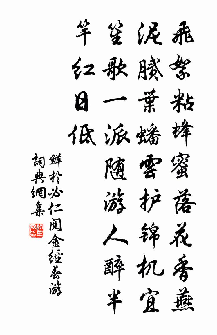 詩詞名句歷史字典書法欣賞書法字典國語詞典說文解字康熙字典古漢語字典標 題 作 者 詩 句 【南呂】閱金經 春遊作者:鮮于必仁 朝代:元代【南呂】閱金經 春遊原文飛絮粘蜂蜜,落花香燕泥,膩葉蟠雲護錦機。宜,笙歌一派隨。遊人醉,半竿紅日低。詩詞問答問:【南呂】閱金經 春遊的作者是誰?答:鮮于必仁問:【南呂】閱金經 春遊寫於哪個朝代?答:元代鮮于必仁【南呂】閱金經 春遊書法欣賞【南呂】閱金經 春遊書法作品詩詞推薦詩品二十四則。高古司空圖〔唐代〕畸人乘真,手把芙蓉。泛彼浩劫,窅然空縱。月出東斗,好風相從。太華夜碧,人聞清鍾。虛佇神素,脫然畦封。依修多羅立往生正信偈釋遵式〔宋代〕稽首蓋西方安樂蓋剎,彌陀蓋世主大慈尊。我依種種修多羅,成就往生決定信。住大乘者清淨心,十念念彼無量壽送蕭穎士赴東府,得離字長孫鑄〔唐代〕大德詎可擬,高梧有長離。素懷經綸具,昭世猶安卑。落日去關外,悠悠隔山陂。我心如浮雲,千里相追隨。好事近(秋晚)趙長卿〔宋代〕淅淅蓼花風,怪道曉來悽惻。翻見密雲拋雨,動一山秋色。從前多感為傷時,無處頓然寂。個事已寒前約,只晚陰氵隱亭元好問〔金代〕春物已清美,客懷自幽獨。危亭一徘徊,翛然若新沐。宿雲淡野川,元氣浮草木。微茫盡楚尾,平遠疑杜曲。生平恭州楊粹生日馮時行〔宋代〕鳳龍虎豹無凡文,墨池太玄之裔孫。至寶不琢粹璞具,猶有太古羲易淳。渝州別駕未足論,嘯歌已是騰清芬。一錢宿楚國寺有懷趙嘏〔唐代〕風動衰荷寂寞香,斷煙殘月共蒼蒼。寒生晚寺波搖壁,紅墮疏林葉滿床。起雁似驚南浦棹,陰雲欲護北樓霜。江邊鷓鴣天徐俯〔宋代〕綠水名園不是村。淡妝濃笑兩生春。笛中已自多愁怨,雨里因誰有淚痕。香旖旎,酒氤氳。多情生怕落紛紛。舊來哭日老二首劉克莊〔宋代〕初聞滅度指三彈,俄報荼毗鼻一酸。始悟杖頭挑布袋,不如龕里坐 * 。故交相與歸函骨,弟子誰來會涅槃。猶喜金剛隨機無盡頌如理實見分第五釋印肅〔宋代〕華胥夢易惺,盡屬髑髏精。卻將夢說夢,何日得超升。玩丹砂 化臥單馬鈺〔元代〕三髻山侗化臥單。諸公休要做艱難。三條乾布有餘寬。每幅度量須六尺,通為二九體長安。不愁炎暑與嚴寒。費華文輓詩二首魏了翁〔宋代〕三鳳齊飛日,相期到白頭。一丘生處樂,萬事死前休。風急啼烏放,霜零斷雁秋。懷人竟何極,緘淚寄西州。送資深知潼川府袁說友〔宋代〕昔日班行憶舊遊,天涯今已說離愁。珠璣咳唾頻傾倒,風月江山幾倡酬。三接自應還北闕,一麾猶欲惠東州。與君驀山溪(游鑑湖)曹冠〔宋代〕鑑湖千頃,四序風光好。撥棹皺漣漪,極目處、青山繚繞。微茫煙靄,鷗鷺點菰蒲,雲帆過,釣舟橫,俱被勞生擾宿滎陽甯氏園蘇轍〔宋代〕喧卑背城市,曠盪臨溪水。車流溯絕壁,河潤及桃李。居人有佳思,過客得新喜。中橋一回顧,欲入迷所自。琴操十首拘幽操韓愈〔唐代〕目窈窈兮,其凝其盲;耳肅肅兮,聽不聞聲。朝不日出兮,夜不見月與星。有知無知兮,為死為生。嗚呼,臣罪當七日逆洛夜宿延秋莊上邵雍〔宋代〕八月延秋禾熟天,農家富貴在豐年。一簞雞黍一瓢酒,誰羨王公食萬錢。金剛隨機無盡頌法身非相分第二十六釋印肅〔宋代〕法界全身量,在一毫頭上。西天牛吃禾,東土馬腹脹。秋山白居易〔唐代〕久病曠心賞,今朝一登山。山秋雲物冷,稱我清羸顏。白石臥可枕,青蘿行可攀。意中如有得,盡日不欲還。人生天台清溪釋行海〔宋代〕碧草生芽鳥弄春,短長亭外柳條新。釣船來往清溪上,定有桃花洞裡人。名句推薦相逢成夜宿,隴月向人圓。杜甫《宿贊公房》 國將興,必貴師而重傅,貴師而重傅,則法度存。荀子《荀子·大略》 誰忍窺河漢,迢迢問鬥牛。孟浩然《他鄉七夕》 英雄行險道,富貴似花枝。佚名《增廣賢文·上集》 春風不相識,何事入羅幃。李白《春思》 故人西辭黃鶴樓,煙花三月下揚州。李白《黃鶴樓送孟浩然之廣陵》 中歲頗好道,晚家南山陲王維《終南別業》 高風吹玉柱,萬籟忽齊飄司空曙《風箏》 想文君望久,倚竹愁生步羅襪。姜夔《八歸·湘中送胡德華》 愁雲淡淡雨瀟瀟。暮暮復朝朝。石孝友《眼兒媚·愁雲淡淡雨蕭蕭》
