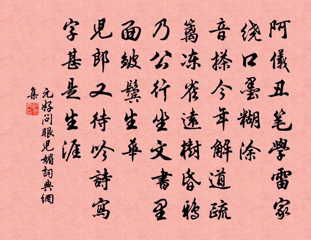 詩詞名句歷史字典書法欣賞書法字典國語詞典說文解字康熙字典古漢語字典標 題 作 者 詩 句 眼兒媚作者:元好問 朝代:金代眼兒媚原文阿儀醜筆學雷家。繞口墨糊塗。音搽今年解道,疏籬凍雀,遠樹昏鴉。乃公行坐文書里,面皺鬢生華。兒郎又待,吟詩寫字,甚是生涯。詩詞問答問:眼兒媚的作者是誰?答:元好問問:眼兒媚寫於哪個朝代?答:金代問:眼兒媚是什麼體裁?答:詞問:元好問的名句有哪些?答:元好問名句大全元好問眼兒媚書法欣賞眼兒媚書法作品詩詞推薦子思賦中秋玩月詞借韻作詩程公許〔宋代〕出路相呼遊冶盤,何妨月下更追歡。情知一夕秋無價,看徹三更酒未闌。衰鬢侵愁羞自照,迴腸索句大應難。可有次韻和吳侍郎喜令弟學士請告歸省宋庠〔宋代〕秋來遙說灑煩襟,季虎昆龍伴嘯吟。弓影奮疑臨酒釋,荊枝歡意巒叢深。仙山校籍催歸傳,宿館銷魂警曙砧。我亦維那觀師以偈示余求詩為贈因成兩絕句孔武仲〔宋代〕夾路長松綠蔭繁,送君從此入幽關。銅瓶錫仗無拘系,正好窺尋瀑水源。寄亨甫鄧肅〔宋代〕晴空當晝棲暘蟲,目林欲焚深甑中。多謝吾君肯相訪,袖中詩句來清風。愛主我堪犬馬比,采蕨山巔行餓死。豈能春日山居好十首舒岳祥〔宋代〕春日山居好,春深自向歸。且年城茂實,何必戀芳菲。樹合明湖隔,蒿長遠徑微。風雩吾黨事,試浴振春衣。偈頌五十一首釋道沖〔宋代〕天無門,地無戶,可中自有凌霄露。普請諸人,進這一步。宜霜梅方蒙仲〔宋代〕青女出驂鸞,負恃天然色。一等淡梳妝,太真迎虢國。鷓鴣天 贈珠廉秀 青樓集馮子振〔元代〕恁倚東風遠映樓。流鶯窺面燕低頭。暇須瘦影纖纖織,龜背香紋細細浮。紅霧斂,彩雲收。海霞為帶月為鉤。夜來次山房韻古意四首何夢桂〔宋代〕佳人藐中洲,倚竹翠袖寒。捐玦屬蹇修,脈脈一水間。夜半下雲旗,逸駕炊可攀。結言水為好,矢報念急難。君有慶長叔招飲一桮,未釂,雪聲璀然。即席走筆楊萬里〔宋代〕燕寧軒里集群仙,薄官歸來又兩年。梅影舞風風舞雪,勸人何苦怯金船。首尾吟邵雍〔宋代〕堯夫非是愛吟詩,詩是堯夫秋出時。樓上清風猶足喜,水邊芳草未全衰。才涼便可停新酒,薄暮初能著袷衣。都沒簡周晞稷張鎡〔宋代〕塵土真堪畏,君髯美亦衰。登樓才會面,促坐便論詩。社日休持酒,秋香待滿枝。客塗書旋習,猶似向來痴。憶平泉山居,贈沈吏部一首(中書作)李德裕〔唐代〕昔聞羊叔子,茅屋在東渠。豈不念歸路,徘徊畏簡書。乃知軒冕客,自與田園疏。歿世有遺恨,精誠何所如。嗟予楠樹為風雨所拔嘆杜甫〔唐代〕倚江楠樹草堂前,故老相傳二百年。誅茅卜居總為此,五月仿佛聞寒蟬。東南飄風動地至,江翻石走流雲氣。乾排喜祖三至留宿王維〔唐代〕門前洛陽客,下馬拂征衣。不枉故人駕,平生多掩扉。行人返深巷,積雪帶餘暉。早歲同袍者,高車何處歸。壺中天(壽陳碧山·十一月十五日)佚名〔宋代〕騎鯨直上,問姮娥何日,天生英傑。笑下瓊樓,還報導,甫近迎長佳節。萬里無雲,一天如水,擁出新團月。正當失調名佚名〔宋代〕爐香如霧斗帳深。自述陸游〔宋代〕意望天公本自廉,甘餐美睡偶容兼。一生憂患如山重,此日安閒抵蜜甜。拙宦雖無齊虜舌,早歸亦免楚人鉗。但余孤雲張喬〔唐代〕舒捲因風何所之,碧天孤影勢遲遲。莫言長是無心物,還有隨龍作雨時。白雲庵晏殊〔宋代〕草庵何似清風樓,更在空中最上頭。眼界豁開無畛域,枯藤古木暮煙浮。名句推薦白馬金羈遼海東,羅帷繡被臥春風。李白《春怨》 事事要留個有餘不盡的意思,便造物不能忌我,鬼神不能損我。洪應明《菜根譚·概論》 秋江帶雨,寒沙縈水,人瞰畫閣愁獨。史達祖《八歸·秋江帶雨》 文章做到極處,無有他奇,只是恰好;人品做到極處,無有他異,只是本然。洪應明《菜根譚·概論》 枯楊枯楊爾生稊,我獨七十而孤棲。李白《雉朝飛》 金樽清酒斗十千,玉盤珍羞直萬錢。李白《行路難·其一》 小桃灼灼柳鬖鬖,春色滿江南。黃庭堅《訴衷情·小桃灼灼柳鬖鬖》 東邊日出西邊雨,道是無晴卻有晴。劉禹錫《竹枝詞二首·其一》 烏啼隱楊花,君醉留妾家。李白《楊叛兒》 中歲頗好道,晚家南山陲王維《終南別業》