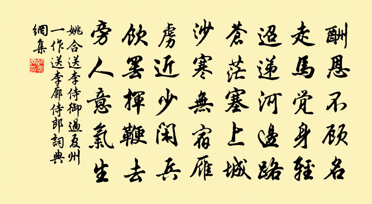 詩詞名句歷史字典書法欣賞書法字典國語詞典說文解字康熙字典古漢語字典標 題 作 者 詩 句 送李侍御過夏州(一作送李廓侍郎)作者:姚合 朝代:唐代原文酬恩不顧名,走馬覺身輕。迢遞河邊路,蒼茫塞上城。沙寒無宿雁,虜近少閒兵。飲罷揮鞭去,旁人意氣生。詩詞問答問:《送李侍御過夏州(一作送李廓侍郎)》的作者是誰?答:姚合問:該詩寫於哪個朝代?答:唐代問:該詩是什麼體裁?答:五律書法欣賞送李侍御過夏州(一作送李廓侍郎)書法作品注釋全唐詩:卷496-3詩詞推薦紫荊花衛宗武〔宋代〕稼艷壓春葩,葩成葉始芽。未張青羽旆,先糝紫金砂。譜接三荊樹,名齊連萼花。移根向深谷,寂寞愛繁奢。簡雪窗重寺丞周端臣〔宋代〕聖賢事業在心槃,禹稷顏回豈異觀。世故波潤同起減,姓名千古要清寒。冬日寄河中楊少尹馬戴〔唐代〕黃河岸柳衰,城下渡流澌。年長從公懶,天寒入府遲。家山望幾遍,魏闕赴何時。懷古心誰識,應多謁舜祠。謝劉明遠華亭惠書徐璣〔宋代〕別遠心常記,書歸亦到吾。離家非失計,有子已為儒。海淺編魚扈,人清養鶴雛。禮優賓館暇,賦詠幾歡娛。春日獨酌二首李白〔唐代〕東風扇淑氣, 水木榮春暉。白日照綠草, 落花散且飛。孤雲還空山, 眾鳥各已歸。彼物皆有託, 吾生獨無絕句六十四首張伯端〔宋代〕休泥丹灶費工夫,煉藥須尋偃月爐。自有天然真火用,不須柴炭及吹噓。郊廟歌辭。五郊樂章。舒和魏徵〔唐代〕笙歌籥舞屬年韶,鷺鼓鳧鍾展時豫。調露初迎綺春節,承雲遽踐蒼霄馭。青霞蒲壽宬〔宋代〕百尺長松岩下風,一輪明月屋西峰。夢回細數登山路,知在青霞第幾重。山間三首孔武仲〔宋代〕柔條細葉謾成業,亦有懸崖出小紅。欲試金丹求不死,靈苗應在此山中。上袁文昌知平江五首劉過〔宋代〕已辨行都欲去船,箇中因得少留連。長安在望空悲日,刺史誰知別有天。鼓吹後車喧水際,旌旗前騎簇花邊。書生碧澗寺見元九侍御和展上人詩有三生之句因以和劉禹錫〔唐代〕廊下題詩滿壁塵,塔前松樹已皴鱗。古來唯有王文度,重見平生竺道人。偈頌八十七首釋慧開〔宋代〕眼如鼻孔口如槌,業識忙忙喚不回。南浦西山耕未遍,披毛戴角又重來。送工部張侍郎入蕃弔祭(時張兼修史)劉禹錫〔唐代〕月窟賓諸夏,雲官降九天。飾終鄰好重,錫命禮容全。水咽猶登隴,沙鳴稍極邊。路因乘驛近,志為飲冰堅。毳帳建溪十詠其八仙人洲楊億〔宋代〕寒潭吞別派,孤嶼屹中流。昔有驂鸞客,因名墜馬洲。洪波長赴海,碧樹幾經秋。城郭何年變,空聞鶴語愁。端午游真如遲適遠從子由在酒局蘇軾〔宋代〕一與子由別,卻數七端午。身隨彩絲系,心與昌歜苦。今年匹馬來,佳節日夜數。兒童喜我至,典衣具雞黍。水餅李花司馬光〔宋代〕嘉李繁相倚,園林澹泊春。齊紈剪衣薄,吳佇下機新。色與晴光亂,香和露氣勻。望中皆玉樹,環堵不為貧。神君歌陸游〔宋代〕泰山可為礪,東海可揚塵。惟有壯士志,死生要一伸。我夢神君自天下,威儀奕奕難具陳。飛龍駕車不用馬,訶前南歌子佚名〔宋代〕樓迥迷雲日,溪深漲曉沙。年來悴憔費鉛華。樓上一天春思、浩無涯。羅頻寬腰素,真珠溜臉霞。海棠開盡柳飛花寄江南鶴林寺石冰上人顧況〔唐代〕山川重複出,心地暗相逢。忽憶秋江月,如聞古寺鐘。湖平南北岸,雲抱兩三峰。定力超香象,真言攝毒龍。風中病酒宿土坊驛陸游〔宋代〕少時見酒喜欲舞,老大畏酒如畏虎。一日飲酒三日病,客路那堪夜聞雨。雨聲蕭蕭宿空堂,不寐始知更漏長。賣藥名句推薦鞭影落春堤,綠錦鄣泥卷。納蘭性德《生查子·鞭影落春堤》 晨起動征鐸,客行悲故鄉。溫庭筠《商山早行》 漠漠黃雲,濕透木棉裘。蔣捷《梅花引·荊溪阻雪》 以少總多,情貌無遺矣。劉勰《文心雕龍·物色》 鴻雁不堪愁里聽,雲山況是客中過。李頎《送魏萬之京》 花滿渚,酒滿甌,萬頃波中得自由。李煜《漁父·一棹春風一葉舟》 斟酌姮娥,九秋宮殿冷。史達祖《齊天樂·中秋宿真定驛》 怡然敬父執,問我來何方。問答乃未已,驅兒羅酒漿杜甫《贈衛八處士》 布衣菜飯,可樂終身,不必作遠遊計也。沈復《浮生六記·閨房記樂》 酒盞旋將荷葉當。蓮舟盪。時時盞里生紅浪。歐陽修《漁家傲·花底忽聞敲兩槳》