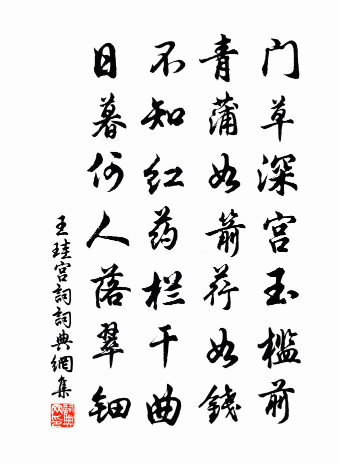 詩詞名句歷史字典書法欣賞書法字典國語詞典說文解字康熙字典古漢語字典標 題 作 者 詩 句 宮詞作者:王珪 朝代:唐代宮詞原文門草深宮玉檻前,青蒲如箭荇如錢。不知紅藥欄乾曲,日暮何人落翠鈿。詩詞問答問:宮詞的作者是誰?答:王珪問:宮詞寫於哪個朝代?答:唐代王珪宮詞書法欣賞宮詞書法作品詩詞推薦木芙蓉姜特立〔宋代〕美人{左女右便}娟隔秋江,翠羅織裳楸葉光。醉香艷粉凋斜陽,更使詩人感杏殤。歸雁亭白玉蟾〔宋代〕嗟予尚未發星星,今日杯茶歸雁亭。幾見霜翎巢白草,數行雲足篆青冥。方將寄字來苕霅,莫便翻身過洞庭。握手涌金門王鎡〔宋代〕涌金門外看花朝,步去船歸不見遙。一派笙歌來水上,鷺鷥飛過第三橋。送廣帥秩滿之官丹陽二首楊萬里〔宋代〕南海元戎禁從臣,卻升北斗捧星辰。回頭五嶺忽千里,屈指十賢添一人。笑別廣平堂下月,歸看太極殿前春。一尊新定望湖樓張伯玉〔宋代〕龍盤山影倒寒流,十里屏風翠入樓。畫筆肯歸涵碧手,湖光疑對涌金秋。主翁愛客排三雅,漁父忘機任直鉤。為訪寄左偃李中〔唐代〕蕭條陋巷綠苔侵,何事君心似我心。貧戶懶開元愛靜,病身才起便思吟。閒留好鳥庭柯密,暗養鳴蛩砌草深。況是懷仙樓歌奉呈鶴林尊友白玉蟾〔宋代〕閩為昔無諸,山水實秀嫵。其間多神仙,後先各軒翥。任敦丹井寒,董奉杏壇古。雲飛鄧伯元,風御王玄甫。烏石寄李簡夫宮使五首蘇泂〔宋代〕嘉言深味道之腴,啟鑰抽關許自如。顧我但將行腳誤,輸君全得病工夫。張氏館中早作陳著〔宋代〕小窗一榻清於水,親戚相看話久暌。困帶詩情投角枕,夢隨梅伴策霜藜。鄰家落杵催樵爨,山寺分鐘撼竹棲。犯冷頌古二十四首釋宗演〔宋代〕一日一日復一日,次第年窮歲暮來。莫道東君無面目,梅花依舊雪中開。見便見,絕疑猜,燈籠沿壁上天台。相和歌辭。子夜冬歌崔國輔〔唐代〕寂寥抱冬心,裁羅又褧褧。夜久頻挑燈,霜寒剪刀冷。似曾詩譚嗣同〔清代〕同住蓮花證四禪,空然一笑是橫闐。惟紅法雨偶生色,被黑罡風吹墮天。大患有身無相定,小言破道遣愁篇。年來侯革以詩風示次韻晁公溯〔宋代〕少陵有幽事,止共阮生論。把酒與賢樂,為邦漸主恩。欻傾賓客坐,知出聘君門。勝識中郎面,區區對虎賁。局中春興陸游〔宋代〕天知病眼困風沙,借與蓬山閱物華。微暖已迎新到燕,輕陰猶護欲殘花。幽窗寂寂書圍座,倦枕時時夢過家。立馬山居十首薛嵎〔宋代〕老妻倦縫紉,痴兒厭藜藿。一貧誰復言,多累吾已錯。山半雲可耕,山下泉可鑿。軒冕亦儻來,豈得長如昨。過徐城王安石〔宋代〕七年五過徐城縣,自笑皇皇此世間。安得身如倉庾氏,一 * 到子孫閒。和李巽伯春懷劉子翬〔宋代〕山寒古寺清,斷續春朝雨。遙憐遠客情,寂寞誰晤語。平生氣軒昂,失意今易與。有酒即佳晨,無兵皆樂土。微吟安樂窩中吟邵雍〔宋代〕安樂窩中甚不貧,中間有榻可容身。儒風一變至於道,和氣四時長若春。日月作明明主日,人言成信信由人。唯人閬州東園十詠花塢文同〔宋代〕繚繞穿紅萼,爛斑踏紫苔。誰將錦步障,端為使君開。渭河道中 其三王冕〔元代〕月出東溟白,天垂北斗低。礪馬思秣馬,舞劍忽聞雞。諸葛猶存存,田橫不辱齊。英雄如有見,瑣稍豈能迷?名句推薦西登香爐峰,南見瀑布水。李白《望廬山瀑布水二首》 不聞爺娘喚女聲,但聞黃河流水鳴濺濺。佚名《木蘭詩 / 木蘭辭》 都緣自有離恨,故畫作遠山長。歐陽修《訴衷情·眉意》 心體光明,暗室中有青天;念頭暗昧,白日下有厲鬼。洪應明《菜根譚·概論》 禮輕情意重,千里送鵝毛!緬伯高《千里送鵝毛(將鵝貢唐朝)》 早歲那知世事艱,中原北望氣如山。陸游《書憤五首·其一》 天下稍安,尤須兢慎,若便驕逸,必至喪敗。吳兢《貞觀政要·卷一·論政體》 求得人間成小會,試把金尊傍菊叢。晏殊《破陣子·燕子欲歸時節》 天道遠,人道邇,非所及也,何以知之?左丘明《左傳·昭公·昭公十八年》 永豐西角荒園裡,盡日無人屬阿誰。白居易《楊柳枝二首》
