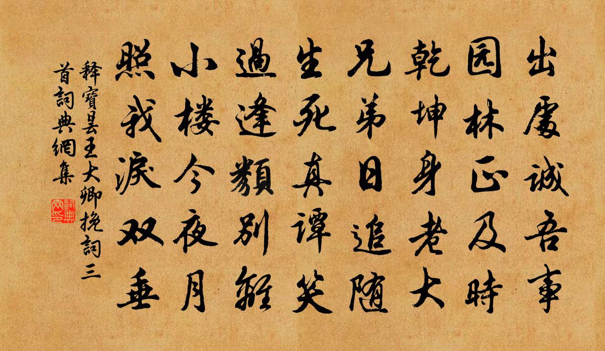 詩詞名句歷史字典書法欣賞書法字典國語詞典說文解字康熙字典古漢語字典標 題 作 者 詩 句 王大卿輓詞三首作者:釋寶曇 朝代:宋代王大卿輓詞三首原文出處誠吾事,園林正及時。乾坤身老大,兄弟日追隨。生死真譚笑,過逢類別離。小樓今夜月,照我淚雙垂。詩詞問答問:王大卿輓詞三首的作者是誰?答:釋寶曇問:王大卿輓詞三首寫於哪個朝代?答:宋代釋寶曇王大卿輓詞三首書法欣賞王大卿輓詞三首書法作品詩詞推薦送馬舍人赴建康軍幕張鎡〔宋代〕柳營謀客自楓宸,去去尖風雁字勻。莫把吟詩替橫槊,新亭北望正愁人。菩薩蠻(怨別)侯置〔宋代〕揉香嗅蕊朝還暮。無端卻被西風誤。底死欲留伊。金塵蔌蔌飛。茂陵頭已白。新聘誰相得。耐久莫相思。年年秋與民歌佚名〔清代〕人人要結後生緣,儂只今生結目前。一十二時不離別,郎行郎坐只隨肩。延英殿玉靈芝詩三章,章八句李亨〔唐代〕玉殿肅肅,靈芝煌煌。重英發秀,連葉分房。宗廟之福,垂其耿光。(此章缺二句)元氣產芝,明神合德。紫微間雪中苦寒戲嘲范成大〔宋代〕冥凌分職大間關,辛苦行冬強作難。費盡無邊風與雪,劣能供得一番寒。代棹歌行鮑照〔南北朝〕羇客離嬰時。飄颻無定所。昔失寓江介。茲春客河滸。往戢於役身。願言永懷楚。泠泠鯈疏潭。邕邕鴈循渚。飂戾答任殿中宗記室王中書別詩蕭衍〔南北朝〕問我去何節。光風正悠悠。蘭華時未晏。舉袂徒離憂。緩客承別酒。鳴琴和好仇。清宵一已曙。藐爾泛長洲。眷言夜宿護國寺李洪〔宋代〕積雨長塗淖,禪房臥枕書。松風醒耳目,梅雨上衣裾。誤著謝公屐,寧宜仲舉輿。前出聊細數,何事擁犀渠。謝三門提舉輦運宋叔達郎中寄古碑雜言強至〔宋代〕長安古名都,漢唐以來帝王宅。當時高冠大帶接跡公卿間,聲名大半文章伯。能書萬變軼出意象外,那局體法就常和陶淵明二十首陳造〔宋代〕少從師友間,雅意效一得。中年彈塵冠,欲起復回惑。初無輔是具,吾責良易塞。即今禹紹舜,群俊萃王國。偈頌一百零二首釋紹曇〔宋代〕頂{左寧右頁}機,法空座。不涉思而知,不動步而到,無端入荒草。陳用之學士輓詞秦觀〔宋代〕迢嶢芸閣上參天,直舍相依欲二年。願寫此情砍挽者,淚沾亮素不成篇。寄致政吳虞部王安石〔宋代〕白鷗生意在滄波,不為風塵有網羅。年抵馮唐初未半,才方疏廣豈能多。孤清楚國知誰繼,遺愛郴人想共歌。嗟我趙路鈴輓詞樓鑰〔宋代〕蚤歲游金闕,霞冠拜紫宸。可堪天寶亂,及見會昌春。宛宛王孫態,飄飄物外身。靈光愴陳跡,遺老更何人。金人捧露盤 淨業寺觀蓮,有懷蓀友納蘭性德〔清代〕藕風輕,蓮露冷,斷虹收,正紅窗、初上簾鉤。田田翠蓋,趁斜陽魚浪香浮。此時畫閣垂楊岸,睡起梳頭。舊遊蹤石榴范成大〔宋代〕日烘古錦囊,露浥紅瑪瑙。玉池咽清肥,三彭跡如掃。贈韋況李約〔唐代〕我有心中事,不與韋三說。秋夜洛陽城,明月照張八。雨中有懷廖行之〔宋代〕春色無多日,匆匆度七旬。驅馳遊子態,蕭索旅中貧。酒薄愁那減,詩窮句轉新。誰能念牢落,涸轍有枯鱗。雪晴姜特立〔宋代〕六出弄陰機,新晴閒夕暉。余過隨雁去,殘雪帶春歸。鷓鴣天王詵〔宋代〕才子陰風度遠關。清愁曾向畫圖看。山銜斗柄三星沒,雪共月明千里寒。新路陌,舊江乾。崎嶇誰嘆客程難。臨風名句推薦遙知湖上一樽酒,能憶天涯萬里人。歐陽修《春日西湖寄謝法曹歌》 兄弟不睦,則子侄不愛顏之推《顏氏家訓·兄弟篇》 風波不信菱枝弱,月露誰教桂葉香李商隱《無題·重幃深下莫愁堂》 參差連曲陌,迢遞送斜暉。李商隱《落花》 君家玉女從小見,聞道如今畫不成。黃庭堅《謝張仲謀端午送巧作》 背若泰山,翼若垂天之雲。莊周《逍遙遊(節選)》 東風有信無人見,露微意、柳際花邊。蘇軾《一叢花·今年春淺侵年》 樓頭小婦鳴箏坐,遙見飛塵入建章。王昌齡《青樓曲二首》 泥融飛燕子,沙暖睡鴛鴦。杜甫《絕句二首》 聖王者不貴義而貴法,法必明,令必行,則已矣。商鞅《商君書·畫策》