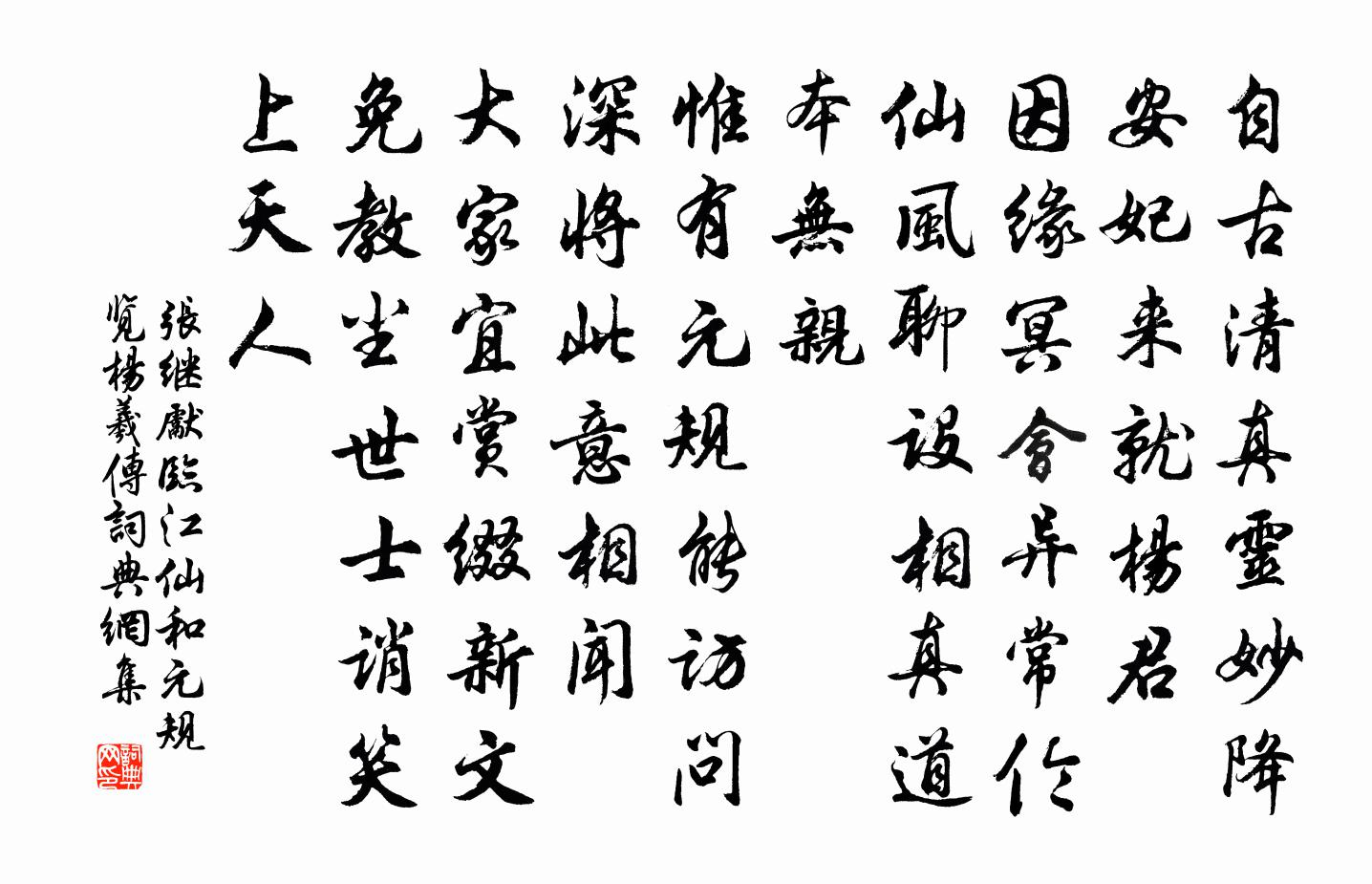詩詞名句歷史字典書法欣賞書法字典國語詞典說文解字康熙字典古漢語字典標 題 作 者 詩 句 臨江仙(和元規覽楊羲傳)作者:張繼先 朝代:宋代臨江仙(和元規覽楊羲傳)原文自古清真靈妙降,安妃來就楊君。因緣冥會異常倫。仙風聊設相,真道本無親。惟有元規能訪問,深將此意相聞。大家宜賞綴新文。免教塵世士,誚笑上天人。詩詞問答問:臨江仙(和元規覽楊羲傳)的作者是誰?答:張繼先問:臨江仙(和元規覽楊羲傳)寫於哪個朝代?答:宋代問:臨江仙(和元規覽楊羲傳)是什麼體裁?答:詞張繼先臨江仙(和元規覽楊羲傳)書法欣賞臨江仙(和元規覽楊羲傳)書法作品詩詞推薦雙清亭郭印〔宋代〕水竹兩奇絕,客來安此名。那知污穢里,識得是真清。送王郎中知江陰梅堯臣〔宋代〕持歸漢省青綾被,去看吳都白馬潮。疊鼓渡江寒浪伏,鳴鐃入境野雲飄。魚穿楊柳夸鮮膾,人采芙蓉學細腰。家有頌古一百則釋正覺〔宋代〕收盡余懷厭事華,歸來何所是生涯。爛柯樵子疑無路,掛樹壺公妙有家。夜水金波浮桂影,秋風雪陣擁蘆花。寒魚重寄虬上人儲光羲〔唐代〕一作雲峰別,三看花柳朝。青山隔遠路,明月空長霄。鵲浴西江雨,雞鳴東海潮。此情勞夢寐,況道雙林遙。秋日聽僧彈琴吳仁璧〔唐代〕金徽玉軫韻泠然,言下浮生指下泉。恰稱秋風西北起,一時吹入碧湘煙。草陳景沂〔宋代〕長淮何處雁聲多,西去渦心北邁河。影逐泗濱煙月艇,陣驚毫邑水雲蓑。小王草筆終難學,蘇武陵書果若何。陲草賦陳嘉謨東西軒二首曹勛〔宋代〕田田東作襯柴關,濕碧吹青一望間。已許傾心常向日,尚容高臥且懷山。光風春動方崇蕙,沆瀣宵零可駐顏。要是經照湖方乾舊居釋智圓〔宋代〕磻溪垂釣者,終得展其才。何事先生隱,不逢明主來。泉聲秋雨歇,月色夜雲開。對此空惆悵,吟魂早晚回。己酉夏偶興汪莘〔宋代〕雨後荷盤可乾汞,日中蓮座 * 香。兒童拗斷壘珠柄,牽出銀絲隨手長。晚登信美亭宋庠〔宋代〕磴道盤紆薄晚雲,天邊疑見斗方春。清風萬里知何意,吹盡華纓漠漠塵。一萼紅姜夔〔宋代〕古城陰。有官梅幾許,紅萼未宜簪。池面冰膠,牆腰雪老,雲意還又沈沈。翠藤共、閒穿徑竹,漸笑語、驚起臥沙次韻定國聞子由臥病績溪黃庭堅〔宋代〕炎洲冬無冰,十月雷虺虺。及春瘧癘行,用人祭非鬼。巫師司民命,藥石不入市。溪弩潛發機,土風甚不美。蘇子頌古三十八首釋從瑾〔宋代〕當陽打動番南鼓,萬象森羅立地聞。不是大家齊則劇,難消白日到黃昏。贊護教釋印肅〔宋代〕仰山顯跡,契會宗師。一法性身,利物宏慈。和洪秀才八首胡寅〔宋代〕杖策紛紛是,誰能志大猷。{牧去攵加角}衣與糲飯,長夏及清秋。辯論輕三耳,齋明見兩眸。聖門多要妙,文藝上新定宋使君貫休〔唐代〕禪坐吟行誰與同,杉松共在寂寥中。碧雲詩里終難到,白藕花經講始終。水疊山層擎草疏,砧清月苦立霜風。十年玉樹謠劉垕〔宋代〕臨春閣下花蒙茸,雕闌玉樹沉香風。君王酣醉眠未起,滿床明月鮫綃紅。羅襦學士文章女,碧葉黃鸝呈好語。可憐【雙調】殿前歡·對菊自嘆張養浩〔元代〕對菊自嘆可憐秋,一簾疏雨暗西樓。黃花零落重陽後,減盡風流。對黃花人自羞,花依舊,人比黃花瘦。問花不語夜歸驛樓許渾〔唐代〕水晚雲秋山不窮,自疑身在畫屏中。孤舟移棹一江月,高閣捲簾千樹風。窗下覆棋殘局在,橘邊沽酒半壇空。早炊遊仙四首曹勛〔宋代〕駕景絡絕響,游目低陰虹。靈光轉修袂,羽節飄晨風。抗手辭金母,偃蓋東華宮。高仙發空謠,逸響飛九重。霞觴名句推薦仁者見之謂之仁,知者見之謂之知佚名《易傳·繫辭傳上·第五章》 且就洞庭賒月色,將船買酒白雲邊。李白《游洞庭湖五首·其二》 孤雲與歸鳥,千里片時間。馬戴《落日悵望》 竹憐新雨後,山愛夕陽時。錢起《谷口書齋寄楊補闕》 先世之吏正,故其民篤;今世之吏邪,故其民薄。政弊而不行,令倦而不聽。班固《漢書·傳·公孫弘卜式兒寬傳》 樓倚霜樹外,鏡天無一毫。杜牧《長安秋望》 多少六朝興廢事,盡入漁樵閒話。張昪《離亭燕·一帶江山如畫》 一年三百六十日,多是橫戈馬上行。戚繼光《馬上作》 得寵思辱,居安思危。佚名《增廣賢文·上集》 馬色雖不同,人心本無隔。李白《君馬黃》