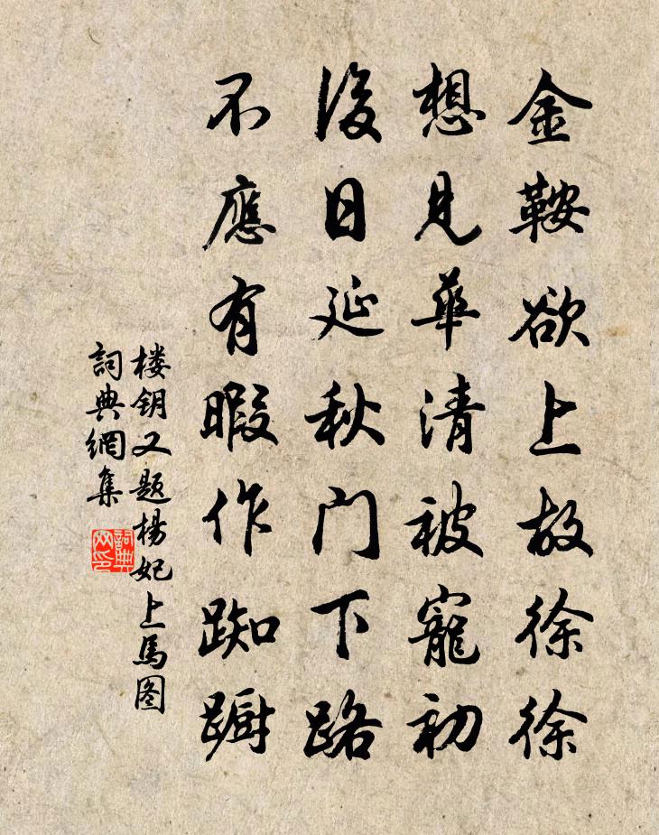 詩詞名句歷史字典書法欣賞書法字典國語詞典說文解字康熙字典古漢語字典標 題 作 者 詩 句 又題楊妃上馬圖作者:樓鑰 朝代:宋代又題楊妃上馬圖原文金鞍欲上故徐徐,想見華清被寵初。後日延秋門下路,不應有暇作踟躕。詩詞問答問:又題楊妃上馬圖的作者是誰?答:樓鑰問:又題楊妃上馬圖寫於哪個朝代?答:宋代樓鑰又題楊妃上馬圖書法欣賞又題楊妃上馬圖書法作品詩詞推薦春雨李彌遜〔宋代〕濛濛煙雨網春暉,南陌清明二月時。細草藏泥供燕子,好花藏蜜待蜂兒。送吉州通判趙德輝上印起闕楊萬里〔宋代〕太守九秋霜,通守三春風。太守鏡照膽,通守淵涵空。古來人才在寒士,皇家人才在宗子。君看二趙作廬陵,寬猛獨酌偶作梅堯臣〔宋代〕東路歸梁懶,黃流下汴深。眼穿南去翼,耳冷北來音。風雨昏斜日,乾坤入醉吟。不憂貧且老,自有伯鸞心。南山亭吟梅用韻趙必象〔宋代〕玉輦瑤車具,飄飄銀台路。群姬擁蓋羽,太真衣縞素。夜宴瓊花圃,玉郎騎鶴赴。翠衣凍欲仆,芳信誰傳付。無夢後紀時行陳著〔宋代〕歲在乙酉孟春朔,天氣凝滯雲不開。一日二日三四日,或雪或雨或夜雷。山川失色萬物病,寒氣折骨淖沒脛。如大寄強甫二首劉克莊〔宋代〕守局喧卑地,攜孥寂寞濱。魯儒猶季吏,周禮有鹽人。勿發泥塗嘆,姑持玉雪身。秋風懷檄否,莆與福比鄰。送鄭務拜伯父綦毋潛〔唐代〕名公作逐臣,驅馬拂行塵。舊國問鄖子,勞歌過郢人。一川花送客,二月柳宜春。奉料竹林興,寬懷此別晨。九日巴丘登高張均〔唐代〕客心驚暮序,賓雁下滄洲。共賞重陽節,言尋戲馬游。湖風扶戍柳,江雨暗山樓。且酌東籬酒,聊祛南國憂。懷林維國二首劉宰〔宋代〕尚記升堂拜母時,滿前兒女競牽衣。鳳雛想見今成立,雁序遙聞已奮飛。身後聲名終不朽,家傅詩禮足相輝。傷心寄題朱元晦武夷精舍十二釣磯楊萬里〔宋代〕月夜乘醉來,垂竿曲溪曲。水清無寸鱗,釣得半輪王。扇子詩李石〔宋代〕師資為學之規,朋友為學之勸。說與潤屋千金,何似傳家萬卷。齊桓公伐楚盟屈完左丘明〔先秦〕齊侯與蔡姬乘舟於囿,盪公。公懼變色;禁之,不可。公怒,歸之,未之絕也。蔡人嫁之。 四年春,齊侯以諸句洙泗鈞翁〔宋代〕巍巍顏魯公,筆正心亦正。凜凜元道州,高節抱幽貞。挽趙秋曉李昌辰〔宋代〕諸老之中骨相奇,天胡遽使哲人萎。每懷釣月池邊樂,尚憶編茅亭下詩。隔面樹雲勞我夢,傷心薤露為君悲。典型借宿洞門五絕程公許〔宋代〕一枕齁客夢長,忽聞鍾梵響雲堂。舌根久厭虀監味,洗缽聊分豆粥香。虞美人(賦荼蘼)辛棄疾〔宋代〕群花泣盡朝來露。爭奈春歸去。不知庭下有荼。偷得十分春色、怕春知。淡中有味清中貴。飛絮殘英避。露華微滲寄題章安禪師塔釋智圓〔宋代〕祖師墳塔在天台,雨壞風摧事可哀。香火無人空有跡,夜深明月照蒼苔。山中憶鶴林白玉蟾〔宋代〕蒼崖兮巍巍,對落花兮倚斜暉。猿啼兮鶴唳,望美人兮天一隅。春日即事五首舒邦佐〔宋代〕架上酴醿萬玉浮,當年攀折為遲留。而今老病空相對,花不羞人人自羞。旅次聞砧李中〔唐代〕砧杵誰家夜搗衣,金風淅淅露微微。月中獨坐不成寐,舊業經年未得歸。名句推薦念往昔,繁華競逐,嘆門外樓頭,悲恨相續。王安石《桂枝香·登臨送目》 長相思,摧心肝。李白《長相思三首》 言吾善者,不足為喜;道吾惡者,不足為怒。馮夢龍《警世通言·卷四》 兵強勝人,人強勝天佚名《逸周書·卷三·文傳解》 感此懷故人,中宵勞夢想。孟浩然《夏日南亭懷辛大》 鞭個馬兒歸去也,心急馬行遲。辛棄疾《武陵春·走去走來三百里》 千點寒梅曉角中,一番春信畫樓東。楊慎《鷓鴣天·元宵後獨酌》 竹樹帶飛嵐,荇藻俱明麗。劉道著《湘江秋曉》 月上柳梢頭,人約黃昏後。歐陽修《生查子·元夕》 西施若解傾吳國,越國亡來又是誰。羅隱《西施》