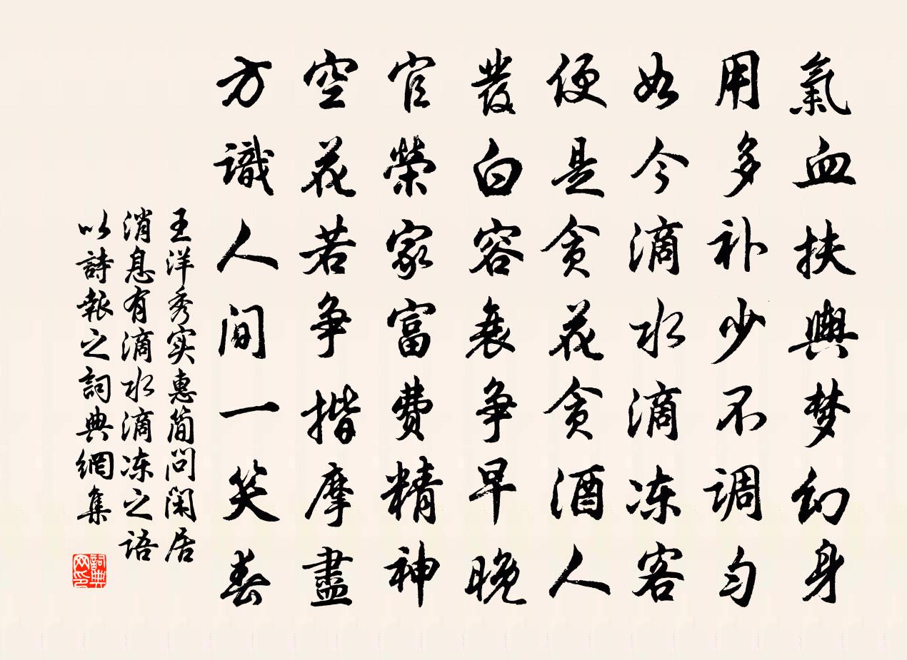 詩詞名句歷史字典書法欣賞書法字典國語詞典說文解字康熙字典古漢語字典標 題 作 者 詩 句 秀實惠簡問閒居訊息有滴水滴凍之語以詩報之作者:王洋 朝代:宋代原文氣血扶輿夢幻身,用多補少不調勻。如今滴水滴凍客,便是貪花貪酒人。發白容衰爭早晚,官榮家富費精神。空花若爭揩摩盡,方識人間一笑春。詩詞問答問:《秀實惠簡問閒居訊息有滴水滴凍之語以詩報之》的作者是誰?答:王洋問:該詩寫於哪個朝代?答:宋代書法欣賞秀實惠簡問閒居訊息有滴水滴凍之語以詩報之書法作品詩詞推薦念奴嬌張榘〔宋代〕三閭何在,把離騷細讀,幾番擊節。蘺蕙椒蘭紛江渚,較以艾蕭終別。清濁同流,醉醒一夢,此恨誰能說。忠魂耿秋日古蘭花十首方回〔宋代〕一乾一花山谷語,今蘭不是古時蘭。重陽菊料千絲紫,隆準曾孫卻解看。游黃山題湯院壁羅洪先〔明代〕紫翠林中便赤足,白龍潭上看青山。藥爐丹井知何處,三十六峰煙月寒。 清心鏡 詠長安馬鈺〔元代〕論長安,多美事。端的日有,三仙向市。滿城人、半做經商,半修煉真氣。壽長人,最多矣。因知罪福,早閒心地挽趙仲白二首劉克莊〔宋代〕昨吊寢門外,萊妻泣最悲。因言兒上學,復為墓求碑。零落燒丹訣,淒涼哭鶴詩。託孤朋友事,非謂刀泉知。和仁仲舟中三絕胡寅〔宋代〕支川千百欲歸東,不得江湖不會同。可但中流能擊楫,也知高浪要乘風。枕疾逾旬蒙丞相訪問仍辱寵示名篇輒搜枯腸次林光朝〔宋代〕丞相嚴裝似燕居,為憐消渴到相如。病多得艾三年遠,歌雜成琴十日余。綠野忽傳春草句,白頭還對朵雲書。若為山行衛宗武〔宋代〕山橫數里如鬟聳,水界千疇似砥平。花事已闌農事動,村村雨足一犁耕。烏棲曲李白〔唐代〕姑蘇台上烏棲時,吳王宮裡醉西施。吳歌楚舞歡未畢,青山欲銜半邊日。銀箭金壺漏水多,起看秋月墜江波。東方大雷口阻風黃庭堅〔宋代〕號櫓下滄江,避風大雷口。天與水饃糊,不復知地厚。誰家上江船,狂追雪山走。孤村無十室,旅飯困三韭。黃蘆劉展下判官相招以詩答之崔峒〔唐代〕國有非常寵,家承異姓勛。背恩慚皎日,不義若浮雲。但使忠貞在,甘從玉石焚。竄身如有地,夢寐見明君。西樓夜白居易〔唐代〕悄悄復悄悄,城隅隱林杪。山郭燈火稀,峽天星漢少。年光東流水,生計南枝鳥。月沒江沉沉,西樓殊未曉。游山歸遇雨呈仲靈沖晦楊蟠〔宋代〕九里松門雪過時,籃輿裊裊礙松枝。雨留宿客還斜落,風送行人亦倒吹。華表忽驚黃鶴反,耳中猶帶白猿悲。來朝減字木蘭花李綱〔宋代〕龜台金母。紺發芳容超敻古。絳節霓旌。青鳥傳言若可憑。瑤池龍宴。零落碧桃香片片。八駿西巡。更有何人繼後酹江月/念奴嬌胡世將〔宋代〕神州沈陸,問誰是、一范一韓人物。北望長安應不見,拋卻關西半壁。塞馬晨嘶,胡笳夕引,贏得頭如雪。三秦往三學院王投〔宋代〕精藍本是真人宅,疊嶂今古釋子山。綠樹不妨丹鶴下,白雲常伴老僧閒。無風木任秋蟬蔭,積雨庭多石蘚斑。儒客再用韻答趙汝騰〔宋代〕不羨叢菊並二螯,羨君出語真俊豪。崛奇退之石鼓句,清逸永叔廬山高。壯懷傾倒湧泉寺,健筆噓吸滄海濤。後期學士兄還鄉之始會賓親石門寺以開門見山不能李彌遜〔宋代〕群賢嘉會走輿臣,乍喜郎星照七閩。寺近南塘鍾秀責,筵開晚水薦甘珍。放懷想盡百川飲,留客應生四負輪。我獨秋日眾哲館對竹(一作題渚塘館竹)許渾〔唐代〕蕭蕭凌雪霜,濃翠異三湘。疏影月移壁,寒聲風滿堂。捲簾秋更早,高枕夜偏長。忽憶秦溪路,萬竿今正涼。覓蠹椽高登〔宋代〕顧影低徊只自憐,怕寒時聳作詩肩。全家食粥已數月,坐客無氈今幾年。君劈槽燒當止酒,我和琴爨況無弦。雪中名句推薦人告之以有過則喜。孟子《孟子·公孫丑章句上·第八節》 算陰晴,渾似幾番,渭城故人離會。吳文英《永遇樂·乙巳中秋風雨》 春至花如錦,夏近葉成帷。李爽《芳樹》 我醉欲眠卿且去,明朝有意抱琴來。李白《山中與幽人對酌》 若似月輪終皎潔,不辭冰雪為卿熱。納蘭性德《蝶戀花·辛苦最憐天上月》 璇室群酣夜,璜溪獨釣時。劉基《題太公釣渭圖》 微雨過,小荷翻。榴花開欲然。蘇軾《阮郎歸·初夏》 貌言華也,至言實也,苦言藥也,甘言疾也。司馬遷《史記·七十列傳·商君列傳》 朱顏空自改,向年年、芳意長新。韓縝《鳳簫吟·鎖離愁》 霧柳暗時雲度月,露荷翻處水流螢。張元乾《浣溪沙·山繞平湖波撼城》