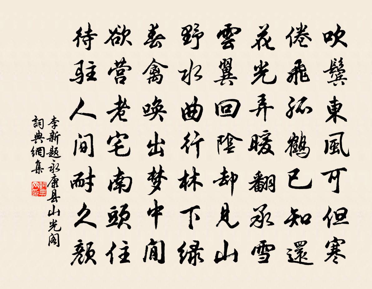 詩詞名句歷史字典書法欣賞書法字典國語詞典說文解字康熙字典古漢語字典標 題 作 者 詩 句 題永康縣山光閣作者:李新 朝代:宋代題永康縣山光閣原文吹鬢東風可但寒,倦飛孤鶴已知還。花光弄暖翻承雪,雲翼回陰卻見山。野水曲行林下綠,春禽喚出夢中閒。欲營老宅南頭住,待駐人間耐久顏。詩詞問答問:題永康縣山光閣的作者是誰?答:李新問:題永康縣山光閣寫於哪個朝代?答:宋代李新題永康縣山光閣書法欣賞題永康縣山光閣書法作品詩詞推薦謁金門袁去華〔宋代〕春寂寂。盡日蜂尋窗隙。隔葉黃鸝聲歷歷。滿庭芳草碧。相對熏爐象尺。新睡覺來無力。幾日郎邊無信息。閒拈雙晚出舒邦佐〔宋代〕晚徑收霜滑,青鞋踏淺沙。看雲閒活計,臨水淡生涯。籬菊猶存葉,江梅欲破花。楓林凋落盡,露出兩三家。跋惠峰詢老所編類海樓鑰〔宋代〕古德手段決裂,剝地破{上絕下方}地折。說道不立文字,未史橫說豎說。草庵文字太多,只為老婆心切。若不作驩州南亭夜望沈佺期〔唐代〕昨夜南亭望,分明夢洛中。室家誰道別,兒女案嘗同。忽覺猶言是,沉思始悟空。肝腸餘幾寸,拭淚坐春風。送堅知庫釋堅璧〔宋代〕埽盡法中閏,生憎佛是塵。堂堂一堅密,春至百花新。跋袁起岩所藏後湖帖並遺像一軸,詩中語皆檃楊萬里〔宋代〕先生向來落異縣,故人十載不相聞。歸來不但荒三逕,點檢松菊無一存。褁輪迴璧豈不好,朝廷禮數優遺老。紅旗杭州訪吉祥璘上人追感蘇才翁同賞牡丹蔡襄〔宋代〕曾乘春飲繞花畦,花底余香入燕泥。剪處佳人傳燭下,歸時明月到雲西。重來草樹驚秋色,零落交朋感舊題。若使送僧釋文珦〔宋代〕空山草木秋,相送古原頭。倦客難為別,寒蛩替說愁。舊房深翠壁,歸路隔滄洲。後夜多明月,相思為上樓。別舍弟後月夜白居易〔唐代〕悄悄初別夜,去住兩盤桓。行子孤燈店,居人明月軒。平生共貧苦,未必日成歡。及此暫為別,懷抱已憂煩。況是泛東湖風浪作復止孫應時〔宋代〕萬頃重湖東復東,意得得怕打頭風。故畦遺穗粼粼在,野水寒林處處通。鴻雁汀洲渺葭葦,牛羊籬落見兒童。衣冠青玉案蔡伸〔宋代〕鸞凰本是和鳴友。奈無計、長相守。雲雨匆匆分袂後。彩舟東去,櫓聲嘔軋,目斷長堤柳。涓涓清淚輕綃透。殘粉鵲橋仙(七夕)葛勝仲〔宋代〕鵲橋仙偶,天津輕渡,卻笑嫦娥孤皎。平時五夜似經年,問何事、今宵便曉。雲車將駕,神夫留戀,更吐心期多少浣溪沙(老妻生日)向子諲〔宋代〕星斗昭回自一天。疏梅池畔斗清妍。蟠桃正熟藕如船。葉上靈龜來瑞世,林間白鶴舞胎仙。春秋不記幾千年。贈胡人林逋〔宋代〕妻兒終擬棄,舊識盡名賢。高節嫌趨世,常流笑學仙。金方燒易得,星度算來玄。祇說尋山去,相期已數年。悲湘靈鮑溶〔唐代〕山上涼雲收,日斜川風止。娥皇五十弦,秋深漢江水。初因無象外,牽感百憂里。霜露結瑤華,煙波勞玉指。將隨除夕馮時行〔宋代〕峽裹江山暮,愁邊日月窮。酒濃新不飲,春近舊多慵。歲事橫胸臆,年華入鬢蓬。明朝有王會,心與蜀江東。同韓員外宿雲門寺嚴維〔唐代〕小嶺路難近,仙郎此夕過。潭空觀月定,澗靜見雲多。竹翠煙深鎖,松聲雨點和。萬緣俱不有,對境自垂蘿。偈頌二十九首釋雲〔宋代〕支提元不會禪,只是依時及節。孟春即曰猶寒,孟夏即曰漸勢。雖無格外高談,不向眼中添悄。汝等莫錯商量,打菱歌陸游〔宋代〕海內知心人漸少,眼前敗意事常多。問君底事渾忘卻,月下菱舟一曲歌。輦下寓題黃滔〔唐代〕對酒何曾醉,尋僧未覺閒。無人不惆悵,終日見南山。名句推薦綠樹暗長亭,幾把離尊,陽關常恨不堪聞。陸游《浪淘沙·丹陽浮玉亭席上作》 塵世難逢開口笑,菊花須插滿頭歸。杜牧《九日齊山登高》 湖水無端浸白雲,故人書斷孤鴻沒。黃庭堅《秋懷二首》 酌酒會臨泉水,抱琴好倚長松。王維《田園樂七首·其七》 黃霧漲天雪晦冥,黑雲拂地風膻腥沈約《昭君辭》 守節自誓,親誨之學。歐陽修《畫地學書》 官無恆友,禍存斯虛,勢之所然,智者弗怠焉。來俊臣《羅織經·謀劃卷第九》 時有官船橋畔過,白鷗飛去落前灘。姜夔《釣雪亭》 臣聞君子樂得其志,小人樂得其事。姜子牙《六韜·文韜·文師》 能行之者未必能言,能言之者未必能行。司馬遷《史記·孫子吳起列傳》
