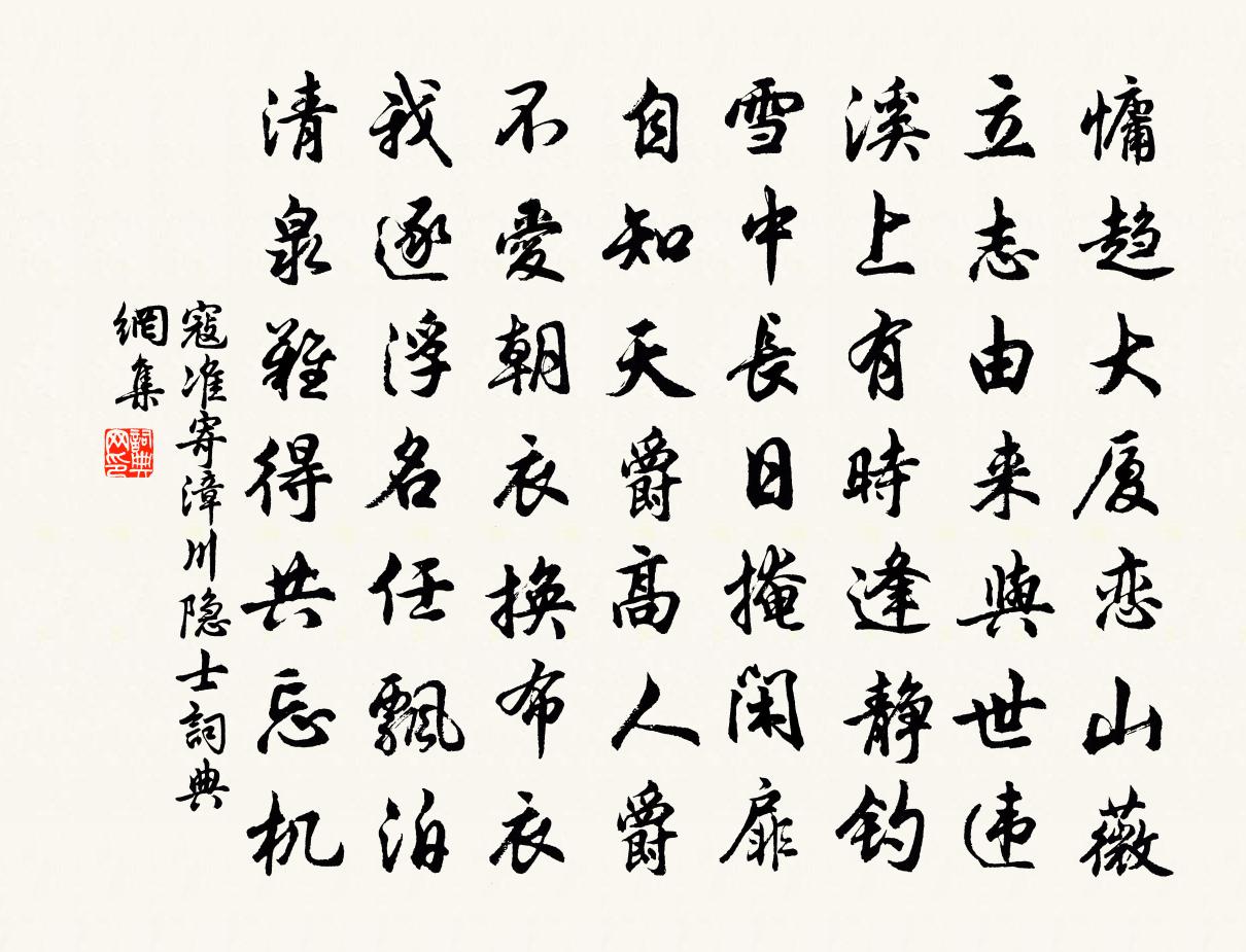 詩詞名句歷史字典書法欣賞書法字典國語詞典說文解字康熙字典古漢語字典標 題 作 者 詩 句 寄漳川隱士作者:寇準 朝代:宋代寄漳川隱士原文慵趨大廈戀山薇,立志由來與世違。溪上有時逢靜釣,雪中長日掩閒扉。自知天爵高人爵,不愛朝衣換布衣。我逐浮名任飄泊,清泉難得共忘機。詩詞問答問:寄漳川隱士的作者是誰?答:寇準問:寄漳川隱士寫於哪個朝代?答:宋代問:寇準的名句有哪些?答:寇準名句大全寇準寄漳川隱士書法欣賞寄漳川隱士書法作品詩詞推薦導引佚名〔宋代〕聖皇巡狩,清蹕駐三吳。十世嗣瑤圖。邊塵不動干戈戢,文德溥天敷。灰飛緹室氣潛噓。郊見紫壇初。歸來赦令樓和李秀才郊墅早春吟興十韻韋莊〔唐代〕暖律變寒光,東君景漸長。我悲游海嶠,君說住柴桑。雪色隨高岳,冰聲陷古塘。草根微吐翠,梅朵半含霜。酒市詠美人鞦韆陳維崧〔清代〕昨夜銅湔裙罷,銅今日意錢銅回。粉牆銅正亞朱戶,其外有銅街。百丈同心彩索,一寸雙文畫板,風颭繡旗開。低游沖虛觀蔡襄〔宋代〕真人玉骨輕,御氣升瑤台。俯首視下方,萬落腥塵埃。香火久寂寞,山川空徘徊。舊樹絡青蔓,虛壇生紫苔。宴坐己酉歲九月九日陶淵明〔魏晉〕靡靡秋已夕,淒淒風露交。蔓草不復榮,園木空自凋。清氣澄余滓,杳然天界高。哀蟬無留響,叢雁鳴雲霄。萬化卓錫泉留元崇〔宋代〕風月衿懷歉古人,蕭然天地一閒身。夜來偶讀唐庚記,貫石通泉在一真。詩壇楊公遠〔宋代〕突兀騷壇依漢立,英豪元帥凜霜威。四時景物知多少,一一投降聽指揮。乙卯端午十絕劉克莊〔宋代〕韓廟坡為記,羅池愈制碑。老農不識字,自唱送神詩。同鹿門少年馬紹隆冥游詩同望荊門龐德公〔唐代〕千年故國歲華奔,一柱高台已斷魂。唯有峴亭清夜月,與君長嘯學蘇門。秋獵孟諸夜歸置酒單父東樓觀妓李白〔唐代〕傾暉速短炬,走海無停川。冀餐圓丘草,欲以還頹年。此事不可得,微生若浮煙。駿發跨名駒,雕弓控鳴弦。鷹豪西湖徐僑〔宋代〕群巒回照紫瀰漫,坐攬湖光風不寒。最惜傍欄鳧鷺狎,往來不作眼生看。春日耕者蘇轍〔宋代〕陽氣先從土脈知,老農夜起飼牛飢。雨深一尺春耕利,日出三竿曉餉遲。婦子同來相嫵媚,鳥鳶飛下巧追隨。紛紜酬李校書釋重顯〔宋代〕一回辭我一回吟,眷戀岩叢意轉深。翻謝霜松不凋落,與君同有歲寒心。雨中登安福寺塔陸游〔宋代〕平生喜登高,醉眼無強界。北顧極幽并,東望跨海岱。喟然撫手嘆,從古幾成敗?英雄如過鳥,城郭但遺塊。今朝聞桂衛宗武〔宋代〕山光水色染秋客,天際明霞一線紅。冉冉有香來鼻觀,廣寒花氣散晴空。次韻陳祭酒直舍犀方岳〔宋代〕西雝夜直秋風底,斷是龍涎不敢香。月府肯分金粟粟,書床相對玉琅琅。人間富貴夢不到,世外高寒味盡長。亦笑懷智棲上人尚顏〔唐代〕臨水登山自有期,不同遊子暮何之。閒眠默坐身堪賞,已去還來事可知。林鳥隔雲飛一餉,草蟲和雨叫多時。思君與趙將軍三首白玉蟾〔宋代〕芒鞋布襪與青藜,朝市迷心忽幾時。料得山中猿鶴冷,多應相怨不相思。題江陵臨沙驛樓司空曙〔唐代〕江天清更愁,風柳入江樓。雁惜楚山晚,蟬知秦樹秋。淒涼多獨醉,零落半同游。豈復平生意,蒼然蘭杜洲。象弈各有等級四絕品四人高下文天祥〔宋代〕擊柱論功不忍看,築壇刑馬誓河山。當年絳灌知何似,只在春秋魯衛間。名句推薦薊城通漠北,萬里別吾鄉。李頎《古塞下曲》 就解佩旗亭,故人相遇。吳文英《掃花游·西湖寒食》 落地為兄弟,何必骨肉親!陶淵明《雜詩》 不知細葉誰裁出,二月春風似剪刀。賀知章《詠柳 / 柳枝詞》 枝上柳綿吹又少。天涯何處無芳草。蘇軾《蝶戀花·春景》 綠蓑江上秋聞笛,紅袖樓頭夜倚欄。曹雪芹《香菱詠月·其三》 鎮日無心掃黛眉。臨行愁見理征衣。夏竦《鷓鴣天·鎮日無心掃黛眉》 贈遠虛盈手,傷離適斷腸。李商隱《十一月中旬至扶風界見梅花》 牆倒眾人推。曹雪芹《紅樓夢·第五十五回》 大丈夫生居天地間,豈能鬱郁久居人下!羅貫中《三國演義·第九回》