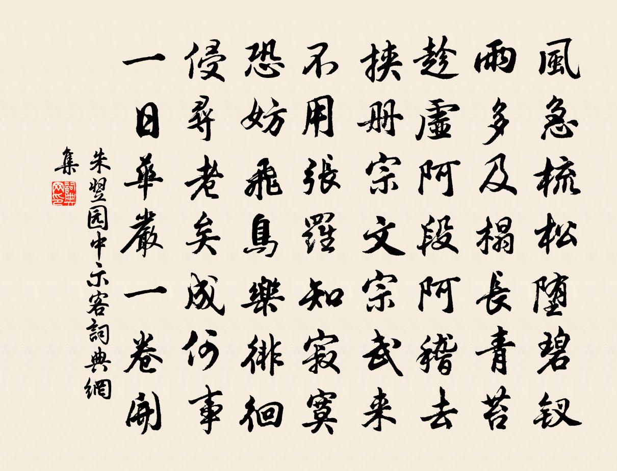 詩詞名句歷史字典書法欣賞書法字典國語詞典說文解字康熙字典古漢語字典標 題 作 者 詩 句 園中示客作者:朱翌 朝代:宋代園中示客原文風急梳松墮碧釵,雨多及榻長青苔。趁虛阿段阿稽去,挾冊宗文宗武來。不用張羅知寂寞,恐妨飛鳥樂徘徊。侵尋老矣成何事,一日華嚴一卷開。詩詞問答問:園中示客的作者是誰?答:朱翌問:園中示客寫於哪個朝代?答:宋代朱翌園中示客書法欣賞園中示客書法作品詩詞推薦【雙調】新水令_題西湖四時馬致遠〔元代〕題西湖四時湖水鏡無瑕,布江山自然如畫。雄宴賞,聚奢華。人不奢華,山景本無價。【慶東原】暖日宜乘轎,春如夢令向滈〔宋代〕誰伴明窗獨坐。和我影兒兩個。燈燼欲眠時,影也把人拋躲。無那。無那。好個恓惶的我。偈頌一百六十首釋宗杲〔宋代〕真生無可生,真滅無可滅。寂滅忽現前,蝦蟆吞卻月。觀鳳池橋上樑陳宓〔宋代〕溪自清如鏡,官那束似羈。不因乘小舫,還得賦新詩。邑肇千家聚,梁成萬世基。令慚無小補,刻石欲何詞。沁園春李道純〔元代〕道本虛無,虛無生一,一二成三。更三生萬物,物皆虛化,形形相授,物物交參。體體元虛,頭頭本一,未許常人次韻和前漳守馬郎中三篇續觀潮蘇頌〔宋代〕江皋空闊見東溟,兩訊潮隨遠近生。夾岸炎天迷雪嶺,居人晴日駭雷聲。客帆朝暮乘風去,漁罟東西逐浪行。盡道逗春海棠楊公遠〔宋代〕蜀地名花迥出奇,玉環卯未醉時。只開春暖二三月,偶冒冬寒四五枝。曉帶清霜濃傳粉,晚迎紅日淡勻脂。惜渠未和梅摯北池十詠蔣堂〔宋代〕池上有時釣,間忘侍從身。波平方浸月,更退閴無人。藻映魴魚尾,風搖獨繭綸。一亭容膝地,雅飾免荒榛。赤松夜宿王柏〔宋代〕香火悠長仙力重,山川布濩妙難控。詩魂飛繞翠屏中,冷雨疎風時入夢。為簡上人賦古色軒王諶〔宋代〕小舟吚啞渡橫塘,十里秋畦粳稻香。莫怪雨聲驚客夢,要催詩句入行囊。重過苹水波浮綠,遙見菊籬花正黃。佳節謝盧少卿惠千文貫休〔唐代〕廬山有石鏡,高倚無塵垢。晝景分煙蘿,夜魄侵星斗。苞含物象列,搜照魚龍吼。寄謝天地間,毫端皆我有。蘇武慢凌雲翰〔元代〕有酒無餚,柰何良夜,客有鱸魚相惠。如此山川,幾何日月,三國竟成何事。目斷風帆,江空歲晚,覓句漫思無已湖山十詠王希呂〔宋代〕山南山北異陰晴,雨腳垂垂日腳明。落盡桃花春事退,柔桑深處一鳩鳴。梅花陸游〔宋代〕廣寒官中第一仙,情深不礙韻超然。勸君莫作兒女態,但向花前傾玉船。與同僚游棲霞,洞極深遠,中有數路,相傳有范成大〔宋代〕竹杖芒鞋俗綱疏,每逢絕勝更踟躕。但隨岐路東西去,莫計光陰大小余。彷佛桃源猶舞鳳,辛勤李白謾騎魚。今朝魯直上東坡古風坡和之因次其韻張九成〔宋代〕浮筠雲海上,時作鐘磬聲。政似月中桂,不比首陽苓。蓬萊日月長,頃刻已千齡。群仙集其下,談笑得長生。回首雜興陸游〔宋代〕犀象本安山海遠,楩楠豈願棟樑材。伏波病困壺頭日,應有嚴光入夢來。折丹桂(用前韻送彥開弟省試)王之道〔宋代〕風漪欲皺春江碧。予寄江城北。子今東去赴春官,挽不住、摶風翼。修程應過天池息。何處堪留客。預知仙籍桂香傳言玉女袁綯〔宋代〕眉黛輕分,慣學玉真梳掠。艷容可畫,那精神怎貌。鮫綃映玉,鈿帶雙穿纓絡。歌音清麗,舞腰柔弱。宴罷瑤池,海口皇甫明子〔宋代〕窮島迷孤青,颶風盪頑寒。不知是海口,萬里空波瀾。蛟龍恃幽沈,怒氣雄屈蟠。崢嶸抉秋陰,掛席潮如山。熒惑名句推薦淇園春竹美,軍宴日椎牛。司馬光《送龔章判官之衛州·新及第》 因依老宿發心初,半學修心半讀書。王建《寄舊山僧》 紅樓隔雨相望冷,珠箔飄燈獨自歸。李商隱《春雨》 荷花嬌欲語,愁殺蕩舟人。李白《淥水曲》 寶馬雕車香滿路。辛棄疾《青玉案·元夕》 日日雨不斷,愁殺望山人。賈島《望山》 丹漆不文,白玉不雕佚名《孔子家語·好生》 西風多少恨,吹不散眉彎。納蘭性德《臨江仙·寒柳》 老人七十仍沽酒,千壺百瓮花門口。岑參《戲問花門酒家翁》 一切法無我無人無眾生無壽者。鳩摩羅什譯《金剛經·究竟無我》