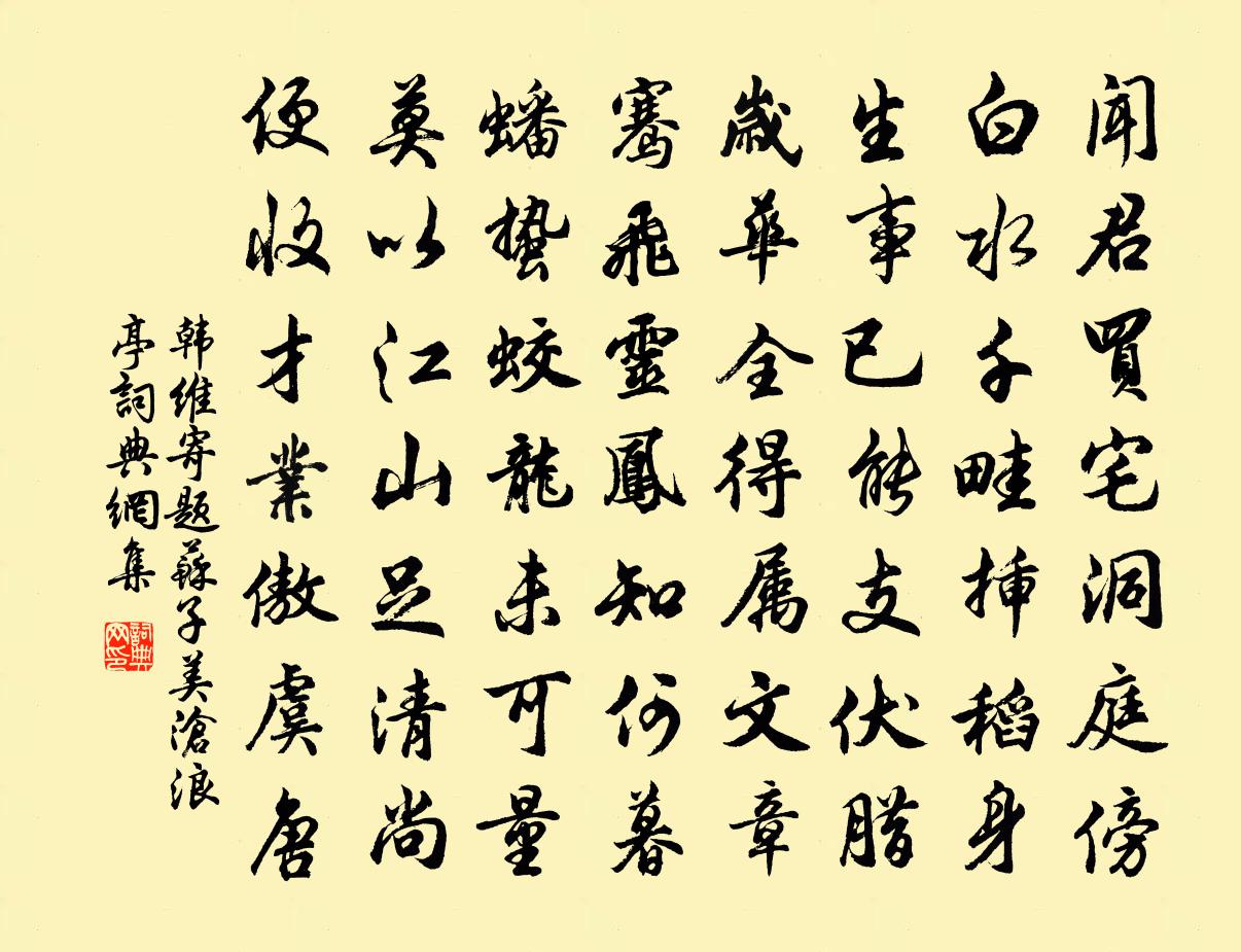 詩詞名句歷史字典書法欣賞書法字典國語詞典說文解字康熙字典古漢語字典標 題 作 者 詩 句 寄題蘇子美滄浪亭作者:韓維 朝代:宋代寄題蘇子美滄浪亭原文聞君買宅洞庭傍,白水千畦插稻身。生事已能支伏臘,歲華全得屬文章。騫飛靈鳳知何暮,蟠蟄蛟龍未可量。莫以江山足清尚,便收才業傲虞唐。詩詞問答問:寄題蘇子美滄浪亭的作者是誰?答:韓維問:寄題蘇子美滄浪亭寫於哪個朝代?答:宋代韓維寄題蘇子美滄浪亭書法欣賞寄題蘇子美滄浪亭書法作品詩詞推薦題琅邪上方顧況〔唐代〕東晉王家在此溪,南朝樹色隔窗低。碑沈字滅昔人遠,谷鳥猶向寒花啼。句潘大臨〔宋代〕兩屐上層樓,一目略千里。句吳光〔宋代〕彈壓京畿賢大尹,藩宣上國古賢侯。西江月史達祖〔宋代〕西月澹窺樓角,東風暗落檐牙。一燈初見影窗紗。又是重簾不下。幽思屢隨芳草,閒愁多似楊花。楊花芳草遍天涯宿顧城二首(顧城在范縣東)張直〔唐代〕綠草展青裀,樾影連春樹。茅屋 * 家,農器六七具。主人有好懷,搴衣留我住。春酒新潑醅,香美連糟濾。一醉早朝十絕趙子潚〔宋代〕一天星斗燦晴霄,香爇沉檀瑞靄飄。環佩趨朝天闕曉,五雲重睹凰儀韶。減字木蘭花(仙呂調)柳永〔宋代〕花心柳眼。郎似遊絲常惹絆。慵困誰憐。繡線金針不喜穿。深房密宴。爭向好天多聚散。綠鎖窗前。幾日春愁廢管鷓鴣天丘崈〔宋代〕陸海蓬壺自有山。光風霽月未應慳。但將歌舞酬佳節,卻信陰晴是等閒。花照夜,燭烘盤。明年公更酒腸寬。奉陪贈相士潘翁二首陳造〔宋代〕平時鏡里笑頭顱,道我為官已近諛。但遣餘年猶甲子,不妨絳老尚泥途。再用前韻呈陳得之諸公仲並〔宋代〕勳業毋庸攬鏡頻,空餘白髮向人親。未論骨相無三甲,細數年華有六身。泉石相看應笑我,萍蓬不定幾經春。尚須二十四日看山項安世〔宋代〕日日憑輿看遠山,不知行處是峰巒。他山亦有痴人看,卻向儂家行處看。疏影·苔枝綴玉姜夔〔宋代〕苔枝綴玉。有翠禽小小,枝上同宿。客里相逢,籬角黃昏,無言自倚修竹。昭君不慣胡沙遠,但暗憶、江南江北。湖中古愁三首李群玉〔唐代〕涼風西海來,直渡洞庭水。翛翛木葉下,白浪連天起。蘅蘭委皓雪,百草一時死。摧殘負志人,感嘆何窮已。昔我蝶戀花秦觀〔宋代〕今歲元宵明月好。想見家山,車馬應填道。路遠夢魂飛不到。清光千里空相照。花滿紅樓珠箔繞。當日風流,更許滿江南(用吳淵吳潛二公韻)王淮〔宋代〕踏遍江南,予豈為、解衣推食。謾贏得、煙波短棹,月樓長笛。看劍功名心已死,積薪涕淚今誰滴。想中原、一望壽王修齋樞密石林松陳著〔宋代〕矯矯千尺強,蒼蒼起層陰。紛紛相投依,百鳥諧春吟。風饕冰雪嚴,誰共歲晚心。獨鶴從何來,徘徊行石林。禪人並化主寫真求贊釋正覺〔宋代〕鼻直口四方,眉低眼三角。默默句難傳,深深誰轉腳。入掛樹之壺,天地能闊;得爛柯之棋,黑白未錯。如今更不解連環(戊午生日)劉克莊〔宋代〕旁人嘲我。甚鬢毛都禿,齒牙頻墮。不記是、何代何年,盡元祐熙寧,儂常喑麽。退下驢兒,今老矣、豈堪推磨。敘志釋文珦〔宋代〕夙了萬緣空,年衰轉更慵。夢身休化蝶,病耳畏聞蛩。野服蘿堪制,山糧穄可舂。誓將雲木友,怕與世人逢。即事王洋〔宋代〕官閒久愧叨祠廩,身幸真堪學種瓜。月給郡倉三斛米,日尋山路一川花。盤空婢去催嬈筍,爐暖妻來趁焙茶。閱盡名句推薦里仁為美,擇不處仁,焉得知?孔子弟子《論語·里仁篇》 昨別今已春,鬢絲生幾縷。韋應物《長安遇馮著》 獨上江樓思渺然,月光如水水如天。趙嘏《江樓舊感》 蓮渚收香,蘭皋浮爽,涼思頓欺班扇。王月山《齊天樂·夜來疏雨鳴金井》 黃蘆岸白蘋渡口,綠柳堤紅蓼灘頭白樸《沉醉東風·漁夫》 古之君子,使人必報之。魏徵《隋書·志·卷二》 急來抱佛腳,閒時不燒香。施耐庵《水滸傳·第十七回》 不知命,無以為君子也;不知禮,無以立也;不知言,無以知人也。孔子弟子《論語·堯曰篇》 不鳴則已,一鳴驚人。司馬遷《滑稽列傳》 誰知道,斷煙禁夜,滿城似愁風雨劉辰翁《永遇樂·璧月初晴》