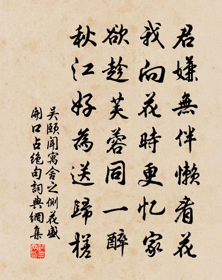 詩詞名句歷史字典書法欣賞書法字典國語詞典說文解字康熙字典古漢語字典標 題 作 者 詩 句 聞寓舍之側花盛開口占絕句作者:吳頤 朝代:宋代聞寓舍之側花盛開口占絕句原文君嫌無伴懶看花,我向花時更憶家。欲趁芙蓉同一醉,秋江好為送歸槎。詩詞問答問:聞寓舍之側花盛開口占絕句的作者是誰?答:吳頤問:聞寓舍之側花盛開口占絕句寫於哪個朝代?答:宋代吳頤聞寓舍之側花盛開口占絕句書法欣賞聞寓舍之側花盛開口占絕句書法作品詩詞推薦上翰林蔣防舍人朱慶餘〔唐代〕清重可過知內制,從前禮絕外庭人。看花在處多隨駕,召宴無時不及旬。馬自賜來騎覺穩,詩緣得後意長新。應憐次韻道潛留別蘇軾〔宋代〕為聞廬岳多真隱,故就高人斷宿攀。已喜禪心無別語,尚嫌剃髮有詩斑。異同更莫疑三語,物我終當付八還。到後醉落魄/一斛珠王沂孫〔宋代〕揉碎花心,吟碎淡黃雪。水龍吟送張大經御史,就用公九日韻,兼簡白樸〔元代〕賈按察司時。丁鈔本題 * 雲廬號疏齋。繡衣攬轡西行,慨然有志人知否。江山好處,留連光景,一杯別酒。世事雪十首楊公遠〔宋代〕臘前三白兆豐年,此話農家萬古傳。近值世更人事改,生民全藉老天憐。謁金門(枕上聞鵑賦)吳潛〔宋代〕紗窗曉。杜宇數聲聲悄。真箇不如歸去好。天涯人已老。欹枕欲眠還覺。猶有青燈殘照。謾道惜花春起早。家山千五歌雨夜陸龜蒙〔唐代〕屋小茅乾雨聲大,自疑身著蓑衣臥。兼似孤舟小泊時,風吹折葦來相佐。我有愁襟無可那,才成好夢剛驚破。背壁懷雪蓬姚希聲使君戴復古〔宋代〕寒入疏蓬夜雪深,是非難辯口如喑。一官不幸有奇禍,萬事但求無愧心。想像騎牛開畫卷,丁寧回雁寄來音。傳家醉蓬萊(次韻張子永同飲謝德輿家)韓元吉〔宋代〕聽清歌初轉,翠嶺雲橫,乍飛還駐。水落秋明,正千岩呈露。況有賓朋,飄然才調,盡凌空鵷鷺。步繞西疇,同尋春月觀省屬城,始憩東西林精舍韋應物〔唐代〕因時省風俗,布惠迨高年。建隼出潯陽,整駕游山川。白雲斂晴壑,群峰列遙天。嶔崎石門狀,杳靄香爐煙。榛荒歸途次韻黃彥平〔宋代〕湘桃亦作春風面,與拭中原淚眼看。舊染天香悲麥秀,續書王夢失槐安。九日范仲淹〔宋代〕欲賦前賢九日詩,茱萸相鬥一枝枝。可憐宋玉情無限,爭似陶潛醉不知。綠鬢愛隨風景變,黃華能與歲寒期。登高關雎佚名〔先秦〕關關雎鳩,在河之洲。窈窕淑女,君子好逑。參差荇菜,左右流之。窈窕淑女,寤寐求之。求之不得,寤寐思服。汴堤暮雪懷徑山澄慧道人晁補之〔宋代〕朔風吹雪亂沾襟,走馬投村日向沉。遙想道人敲石火,冷杉寒竹五峰深。秋山秋雨蚤作有嘆楊萬里〔宋代〕梧葉新黃柿葉紅,更兼鳥臼與丹楓。只言山色秋蕭索,繡出西湖三四峰。早夏賀鑄〔宋代〕吏役初無補,端令樂事妨。不知春遂去,但愛日何長。薄雨梅含核,溫風麥擢芒。須容退食暇,一枕夢吾鄉。跋潘岳悼亡一首劉克莊〔宋代〕長恨齊眉人已往,可憐尊足者猶存。乃知劍履圖麟閣,不似琴書隱鹿門。題徐氏姑壽安君壽梅亭黃庭堅〔宋代〕大鶵銜枚來作亭,小鶵銜實來種花。兩鶵反哺聲查查,慈烏髮白爾成家。梅梁丹青射寒日,梅英飛雪點親發。二鶵燕脂菊史鑄〔宋代〕天汝染花情若狂,鮮妍直欲媚秋光。忍將陶徑黃金色,也學秦宮朱臉妝。春日寄許渾先輩杜牧〔唐代〕薊北雁初去,湘南春又歸。水流滄海急,人到白頭稀。塞路盡何處?我愁當落暉。終須接鴛鷺,霄漢共高飛。名句推薦欲覺聞晨鐘,令人發深省杜甫《游龍門奉先寺》 教人學而執有命,是猶命人葆而去其冠也。墨子《墨子·48章 公孟》 川澤納污,所以成其深;山嶽藏疾,所以就其大。魏徵《隋書·列傳·卷十一》 屈指數春來,彈指驚春去。高觀國《卜運算元·泛西湖坐間寅齋同賦》 大江流日夜,客心悲未央。謝朓《暫使下都夜發新林至京邑贈西府同僚》 雙眼自將秋水洗,一生不受古人欺。袁枚《隨園詩話·補遺 卷三》 相思相見知何日?此時此夜難為情!李白《三五七言 / 秋風詞》 今朝北客思歸去,回入紇那披綠羅。劉禹錫《竹枝詞二首·其二》 撩亂舞晴空,發人無限思。劉禹錫《柳花詞三首》 百結愁腸郁不開,此生惆悵異鄉來。秋瑾《九日感賦》