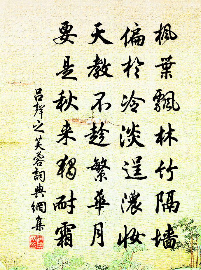詩詞名句歷史字典書法欣賞書法字典國語詞典說文解字康熙字典古漢語字典標 題 作 者 詩 句 芙蓉作者:呂聲之 朝代:宋代芙蓉原文楓葉飄林竹隔牆,偏於冷淡逞濃妝。天教不趁繁華月,要是秋來獨耐霜。詩詞問答問:芙蓉的作者是誰?答:呂聲之問:芙蓉寫於哪個朝代?答:宋代呂聲之芙蓉書法欣賞芙蓉書法作品詩詞推薦清平樂(居厚弟生日)劉克莊〔宋代〕人間喘汗。無計翻銀漢。有個至人來震旦。宴坐補陀岩畔。吾聞福壽難量。待看海底生桑。乞取淨瓶一滴,普教大汴人舟行答張祜杜牧〔唐代〕千萬長河共使船,聽君詩句倍愴然。春風野岸名花發,一道帆檣畫柳煙。念奴嬌·和雪谷九日遊星岩趙必〔宋代〕一時四美,對重陽、那更無風無雨。塵世難逢開口笑,不飲黃花有語。雲谷春生,星岩秋好,引領群仙去。滿襟霽賞牡丹王建〔唐代〕此花名價花別,開艷花益皇都。花香遍苓菱死,紅燒躑躅枯。軟光籠細脈,妖色暖鮮膚。滿蕊攢黃粉,含棱縷絳蘇點絳唇 送王世英程文海〔元代〕執法星邊,從前合著雙星佐。近來添個。轉覺光明大。到得長乾,想見鶯花過。情無那。王郎知麽。喚起思歸我。靜夜晁說之〔宋代〕此身飄蕩久,靜夜得幽情。月色隨窗盡,泉聲到枕輕。老夫方讀易,稚子莫談兵。似說歸期近,嵩陽學自耕。次韻虞永康讀易有作魏了翁〔宋代〕室中萬象本寬閒,門戶何曾頃刻關。未始有時觀太極,不終止處認兼山。人文自昔先犧昊,天賦雲誰不也顏。有志次張學錄韻十首陳造〔宋代〕君才高懷時,從我計已左。要追莊惠塵,揮麈論然可。偈三十五首釋祖珍〔宋代〕青氈本屬吾家,日用何曾欠闕。要識里許清規,除是君子可八。和丁少詹韻陳傅良〔宋代〕明月隋珠忽墮前,坐令衰颯意飄然。無端太史頭搶地,安得揚雄賦上天。前輩門牆余幾在,他時竹帛竟誰傳。落花明日復雨排悶陸游〔宋代〕湖上孤村冷欲冰,更堪衰與病相乘!夢回點滴檐間雨,心折青熒帳外燈。雖有數椽常似客,僅存一肉未成僧。披衣句彭止〔宋代〕吾生良可嗟。次韻杜若川春日雜興集句二首於石〔宋代〕九陌淨無車馬塵,不須移檻損天真。凡花俗草敗人意,悵望煙雲縹緲人。書無悶寮艾性夫〔宋代〕喧啾百鬼瞰高明,寂歷朱門野草生。斗大山中茅屋好,日長欹枕聽松聲。惜黃花慢·送客吳皋吳文英〔宋代〕送客吳皋。正試霜夜冷,楓落長橋。望天不盡,背城漸杳,離亭黯黯,恨水迢迢。翠香零落紅衣老,暮愁鎖、殘柳八景歌趙汝鐩〔宋代〕晚日放晴雨腳收,楚山千里江吞秋。上水風生荻花渚,漠漠幅蒲天際浮。輕雲驟掩目力斷,雲消似過芳洲半。危檣減字木蘭花佚名〔宋代〕東君有待。留得一枝香雪在。晚日融融。只恐輕酥暖漸熔。歌催管送。芳酒一尊誰與共。寂寞牆東。瀟灑黃昏滿院偈頌一百二十三首釋崇岳〔宋代〕千聖不傳到今日,口上著來無等匹。洞庭山腳太湖心,人行道上空啾唧。冬日書懷徐璣〔宋代〕閒庭黃葉滿,園樹盡玲瓏。寒水終朝碧,霜天向晚紅。蔬餐如野寺,茅舍近溪翁。非是分囂寂,由來趣不同。芙蓉城(並敘)蘇軾〔宋代〕世傳王迥子高,與仙人周瑤英游芙蓉城。元豐元年三月,余始識子高,問之信然,乃作此詩。極其情而歸之正,亦名句推薦數年前也放狂,這幾日全無況。康海《雁兒落帶得勝令·飲中閒詠》 檳榔無柯,椰葉無陰。左思《三都賦》 黃蘆岸白蘋渡口,綠柳堤紅蓼灘頭白樸《沉醉東風·漁夫》 秋雨一何碧,山色倚晴空。方岳《水調歌頭·平山堂用東坡韻》 歌中醉倒誰能恨,唱罷歸來酒未消。晏幾道《鷓鴣天·小令尊前見玉簫》 奸巧語,穢污詞。市井氣,切戒之。李毓秀《弟子規·信》 過江千尺浪,入竹萬竿斜。李嶠《風》 停車坐愛楓林晚,霜葉紅於二月花。杜牧《山行》 野曠雲連樹,天寒雁聚沙。文森《九日》 千步虹橋,參差雁齒,直趨水殿。柳永《破陣樂·露花倒影》