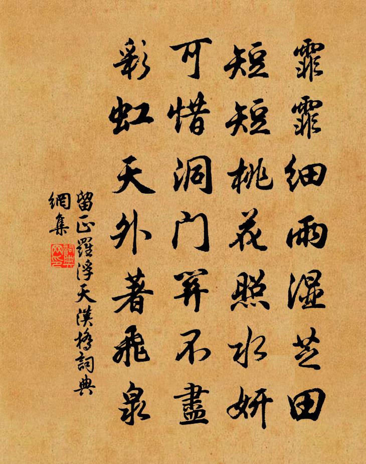 詩詞名句歷史字典書法欣賞書法字典國語詞典說文解字康熙字典古漢語字典標 題 作 者 詩 句 羅浮天漢橋作者:留正 朝代:宋代羅浮天漢橋原文霏霏細雨濕芝田,短短桃花照水妍。可惜洞門關不盡,彩虹天外著飛泉。詩詞問答問:羅浮天漢橋的作者是誰?答:留正問:羅浮天漢橋寫於哪個朝代?答:宋代留正羅浮天漢橋書法欣賞羅浮天漢橋書法作品詩詞推薦白雲歌為李紫□作王冕〔元代〕我歌謫仙白雲歌,清風飄飄吹女蘿。女蘿風飛白雲出,秦山楚山爭嵯峨。秦楚之山青欲舞,白雲不向湖山住。忘機柳梢青(元宵何高士說京師舊事)張孝祥〔宋代〕今年元夕。探盡江梅,都無訊息。草市梢頭,柳莊深處,雪花如席。一尊鄰里相過,也隨分、移時換節。玉輦端門送察院李侍御使廬陵因寄孟員外徐鉉〔唐代〕繡衣乘驛急如星,山水何妨寄野情。肯向九仙台下歇,閒聽孟叟醉吟聲。桐徐介軒〔宋代〕灝氣行秋萬宇涼,玄姑新敕辦衣裳。林為機杼織無跡,月當膏油緝易長。謂爾索裘雖有日,到頭無褐可禁霜。工夫劍客行陸游〔宋代〕世無知劍人,太阿混凡鐵。至寶棄泥沙,光景終不滅。一朝斬長鯨,海水赤三月。隱見天地間,變化豈易測。國家遠寺鐘司空曙〔唐代〕杳杳疏鍾發,因風清復引。中宵獨聽之,似與東林近。觀潮袁說友〔宋代〕倏見江頭萬鼓催,更聞腳底一聲雷。怒濤直欲浮天去,急浪猶能帶雨來。豈但皇都夸偉觀,要令區宇絕纖埃。靈胥大閫撥醅於園亭坐上文武各半恰西師捷至用同陳杰〔宋代〕花氣深迷院,湖光曲抱城。淺春烽火暇,細雨笑談清。舁翁看浮蟻,飛書報斬鯨。漁陽回席處,半著魯諸生。司馬溫公輓詩五首孔武仲〔宋代〕拙與世沈浮,登門十二秋。雲天曾送上,風壑此來游。霄漢三台坐,江湖萬里舟。摳衣已不及,慘愴逝川流。巫山一段雲 平沙落雁李齊賢〔元代〕醉墨疏還密,殘棋整復斜。料應遺蹟在泥沙。來往歲無差。水暖仍菰米,霜寒尚葦花。心安只合此為家。何事客天送陳校勘入宿王初〔唐代〕日落風回卷碧霓,芳蓬一夜拆龍泥。銀台級級連清漢,桂子香濃月杵低。菩薩蠻(沐發)蔡伸〔宋代〕鴛鴦枕上雲堆綠。蘭膏微潤知新沐。開帳對華燈。見郎雙眼明。錦衾香馥郁。檻竹敲寒玉。何物最無情。曉雞咿喔馬希振葬地碣佚名〔唐代〕亂石之壤,絕世之岡。谷變庚戌,馬氏無王。鷓鴣天姬翼〔元代〕弱喪飄流未肯歸。玄關說與更增迷。此行若遇商丘老,棄卻枯髏更不疑。先犯早,後遲遲。箇中訊息幾人知。東風落照(一作耿湋詩)馬戴〔唐代〕照曜天山外,飛鴉幾共過。微紅拂秋漢,片白透長波。影促寒汀薄,光殘古木多。金霞與雲氣,散漫復相和。福田寺陳天麟〔宋代〕逵市前朝寺,何年古佛廬。上方分勝業,小築寄幽居。坡隴青相接,川原綠自如。欹眠聽秋雨,懷抱稍虛徐。紹興以後祀五方帝六十首佚名〔宋代〕[太簇為徽一奏]神在途矣,習習以風。百發後先,敢一不恭。奔走羌疫,祓除切凶。顧瞻下方,逍遙從容。殘花(一作羅隱詩)楊發〔唐代〕已笑良時晚,仍悲別酒催。暖芳隨日薄,殘片逐風回。黛斂愁歌扇,妝殘泣鏡台。繁陰莫矜衒,終是共塵埃。題潮出海門圖二首陳造〔宋代〕絕島平岡卷欲空,兩崖相對屹穹崇。即今畫手兼詩筆,更與江山角長雄。糖多令(丙子中秋前,聞歌此詞者,即席借蘆葉滿汀洲韻)劉辰翁〔宋代〕明月滿滄洲。長江一意流。更何人、橫笛危樓。天地不知興廢事,三十萬、八千秋。落葉女牆頭。銅駝無恙不。看名句推薦興亡千古繁華夢,詩眼倦天涯。張可久《人月圓·山中書事》 思歸若汾水,無日不悠悠。李白《太原早秋》 人之事兄,不可同於事父,何怨愛弟不及愛子乎?顏之推《顏氏家訓·兄弟篇》 晨必盥,兼漱口。便溺回,輒淨手。李毓秀《弟子規·謹》 鮑魚蘭芷,不同篋而藏劉向《說苑·指武》 芳菊開林耀,青松冠岩列。陶淵明《和郭主簿·其二》 雪裡溫柔,水邊明秀,不借春工力。辛棄疾《念奴嬌·梅》 願學秋胡婦,貞心比古松。李白《湖邊採蓮婦》 不知三江水,何事亦分流?陳子龍《三洲歌》 夫謀必素見成事焉,而後履之左丘明《國語·吳語·越王勾踐命諸稽郢行成於吳》