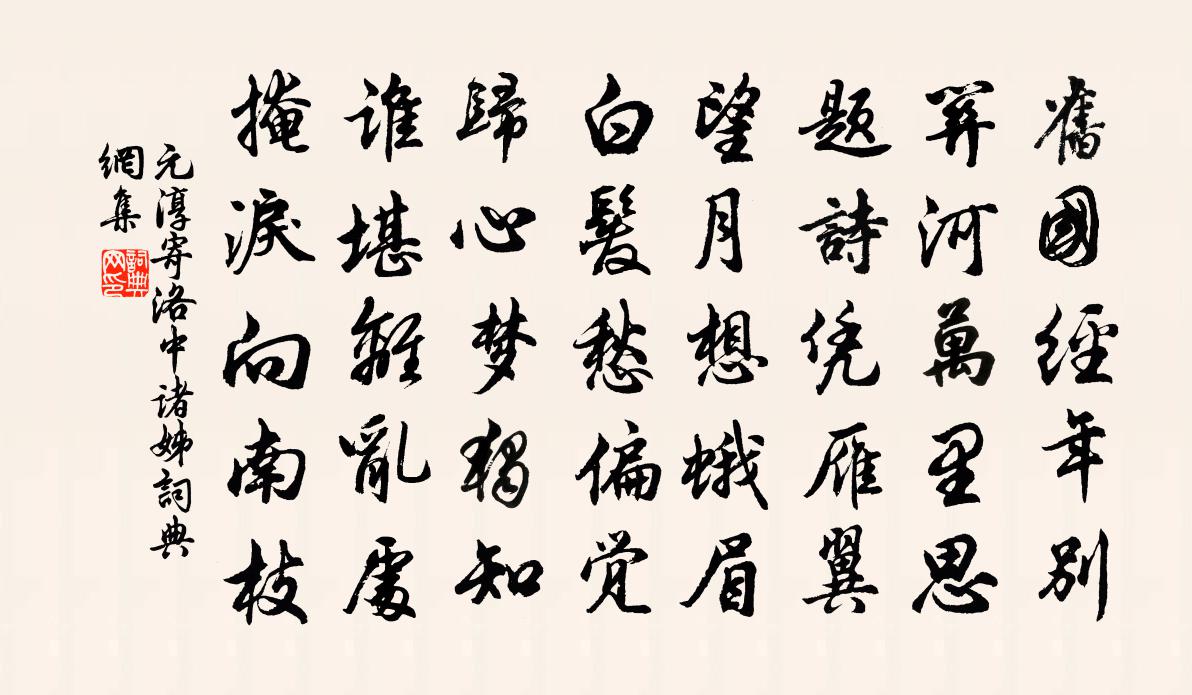 詩詞名句歷史字典書法欣賞書法字典國語詞典說文解字康熙字典古漢語字典標 題 作 者 詩 句 寄洛中諸姊作者:元淳 朝代:唐代寄洛中諸姊原文舊國經年別,關河萬里思。題詩憑雁翼,望月想蛾眉。白髮愁偏覺,歸心夢獨知。誰堪離亂處,掩淚向南枝。詩詞問答問:寄洛中諸姊的作者是誰?答:元淳問:寄洛中諸姊寫於哪個朝代?答:唐代問:寄洛中諸姊是什麼體裁?答:五律元淳寄洛中諸姊書法欣賞寄洛中諸姊書法作品注釋全唐詩:卷805-18詩詞推薦和許總卿王之望〔宋代〕孔明屢出師,常苦糧食少。公今主邊計,積粟丘阜小。臥龍志空大,流馬功竟杳。當時若得公,大事指顧了。遊仙詞三十三首王鎡〔宋代〕夜半瑤宮上會開,龍車聲軋鳳飛來。演窮靈寶玄元法,大梵天仙帶月回。水調歌頭(柳州北湖)吳鎰〔宋代〕澄徹北湖水,圓鏡瑩青銅。客槎星漢天上,隱隱暗朝通。六月浮雲落日,十頃增冰積雪,勝絕與誰同。羅襪步新月贈郭將軍李白〔唐代〕將軍少年出武威,入掌銀台護紫微。平明拂劍朝天去,薄暮垂鞭醉酒歸。愛子臨風吹玉笛,美人向月舞羅衣。疇昔金縷曲/賀新郎劉辰翁〔宋代〕問何年種植。獨成蹊、穠花爛漫,錦開千步。花下老人猶記我,不似那回賞處。並吹卻、道邊謝墅。黃四娘家今何次韻王省乾陳造〔宋代〕大匠成風手,器就不待模。老夫默自哂,堆豗守一隅。論交獨何幸,魚目儷明珠。他年君鄰牆,作意營一區。與沈五官李提點飲酒席間作七首釋道濟〔宋代〕昔我父妨作此態,生我這個臭皮袋。我心不比父娘心,我心除酒都不愛。好事近程垓〔宋代〕急雨鬧冰荷,銷盡一襟煩暑。趁取晚涼幽會,近翠陰濃處。風梢危滴撼珠磯,灑面得新句。莫怪玉壺傾盡,待月明西江月王哲〔元代〕堪嘆木金相間。夫庚婦開顏。聲美處水潺潺。清流出澗。滋潤黃芽無限。便教白雪循環。西江月里我躋攀。步步銀次韻畢叔文苦旱嘆趙蕃〔宋代〕爾何不歸乎故宇,卻向殊方書閔雨。江東數月不得書,憶弟看雲在何許。舊傳重湖北之北,米賤真成等泥土。如何夜坐林尚仁〔宋代〕焚香獨坐勘騷經,庭樹無風葉不鳴。靜入夜深聞鼓吹,一池明月亂蛙聲。相次尋舉客寄住人(一作再經三叟居)周賀〔唐代〕停橈因舊識,白髮向波濤。以我往來倦,知君耕稼勞。渚田臨舍盡,坂路出檐高。游者還南去,終期伴爾曹。過麻子湖遇逆風有作姚勉〔宋代〕世道如斯決意歸,此心不怕八風吹。吾生忠信無休日,天下風波有定時。次德和韻寄談李二丈二首王阮〔宋代〕心在淮山下,身行湘水中。喜拋餘子去,恨不故人同。舊隱勞征夢,浮名任化工。衡陽春漸暖,終欲伴歸鴻。出塞門許棠〔唐代〕步步經戎虜,防兵不離身。山多曾戰處,路斷野行人。暴雨聲同瀑,奔沙勢異塵。片時懷萬慮,白髮數莖新。題寶山寺二首釋圓悟〔宋代〕去臘應差暖,今春定有寒。澗梅花半樹,侵曉又凋殘。謁金門元好問〔金代〕羅衾薄。簾外五更風惡。醉後題詩渾忘卻。烏啼殘月落。憔悴何郎東閣。病酒不禁重酌。袖裡梅花春一握。幽懷無重陽宴集同用寒字張登〔唐代〕錫宴逢佳節,窮荒亦共歡。恩深百日澤,雨借九秋寒。望氣人謠洽,臨風客以難。座移山色在,杯盡菊香殘。欲識句江施〔宋代〕深隨石竇千尋去,遠自雲峰十里來。送劉坰登第赴調二首項安世〔宋代〕我老愚難改,年深病不瘳。鄉閭仗不雋,科甲慰窮愁。拾芥雖堪喜,看花且莫留。歸來修遠業,可以張吾州。名句推薦應無所住而生其心。鳩摩羅什譯《金剛經·莊嚴淨土》 西園有分,斷柳淒花,似曾相識。吳文英《瑞鶴仙·秋感》 有約不來過夜半,閒敲棋子落燈花。趙師秀《約客》 遊子乍聞征袖濕,佳人才唱翠眉低。鄭谷《鷓鴣》 不知而自以為知,百禍之宗也。呂不韋《呂氏春秋·覽·有始覽》 誓將掛冠去,覺道資無窮。岑參《與高適薛據同登慈恩寺浮圖》 大嫂采芙蓉,溪湖千萬重。李白《湖邊採蓮婦》 夫綴文者情動而辭發,觀文者披文以入情,沿波討源,雖幽必顯。劉勰《文心雕龍·知音》 古戍蒼蒼烽火寒,大荒沈沈飛雪白。李頎《聽董大彈胡笳聲兼寄語弄房給事》 蓄疑敗謀,怠忽荒政佚名《尚書·周書·周官》