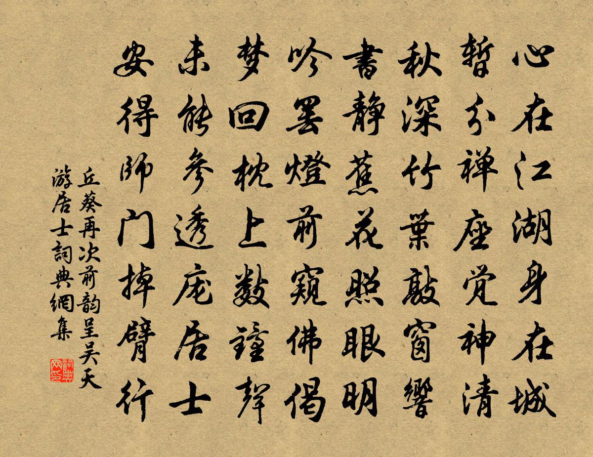 詩詞名句歷史字典書法欣賞書法字典國語詞典說文解字康熙字典古漢語字典標 題 作 者 詩 句 再次前韻呈吳天游居士作者:丘葵 朝代:宋代再次前韻呈吳天游居士原文心在江湖身在城,暫分禪座覺神清。秋深竹葉敲窗響,書靜蕉花照眼明。吟罷燈前窺佛偈,夢回枕上數鐘聲。未能參透龐居士,安得師門掉臂行。詩詞問答問:再次前韻呈吳天游居士的作者是誰?答:丘葵問:再次前韻呈吳天游居士寫於哪個朝代?答:宋代丘葵再次前韻呈吳天游居士書法欣賞再次前韻呈吳天游居士書法作品詩詞推薦送堯夫二章文同〔宋代〕欲與民為利,先求正所妨。紛更初下議,旁午遂交章。不爾毛安傅,其如體自傷。西南余弊在,歸為對明光。季弟黃岩任滿大人率家眾先歸作詩見示恭次元孫應求〔宋代〕長拘棲寓季微官,攜杖扶車愧二難。翹首雲山魚雁遠,關心歲月骨毛寒。方來負米還為養,未遂承顏數問安。何日次韻郎中弟見寄李彌遜〔宋代〕浮木隨流誰見招,春江無盡水雲遙。只今瘴海投閒地,魑魅為鄰資正驕。自省徐瑞〔宋代〕閉閣焚香一欠伸,晴窗如鏡暖如春。平生自有會心處,後世豈無知我人。漫拄蟲魚消白日,莫緣炙獨或天真。客來風馬兒 繼重陽韻馬鈺〔元代〕意馬顛狂自由縱。來往走、鐺滴*丁。更加之、心猿廝調弄。歌迷酒惑財色引,鐺滴*丁。幸遇風仙把持*。便不掩扉陸游〔宋代〕久臥空山獨掩扉,迂疏不恨世相違。新霜巷陌鳥烏樂,小雨園畦菘芥肥。驥病極知當伏櫪,鷗閒誰與共忘機?一編偈頌一百五十首釋心月〔宋代〕金烏飛,玉兔走。目前事,看不透。十日前,五日後,誰敢咳嗽。慶宮春姜夔〔宋代〕雙漿蓴波,一蓑松雨,暮愁漸滿空闊。呼我盟鷗,翩翩欲下,背人還過木末。那回歸去,盪雲雪,孤舟夜發。傷心秋夜泛舟劉方平〔唐代〕林塘夜發舟,蟲響荻颼颼。萬影皆因月,千聲各為秋。歲華空復晚,鄉思不堪愁。西北浮雲外,伊川何處流。沈大虛以丁逑發韻寄兩篇交韻王洋〔宋代〕長淮千里擁雙旌,攬轡曾聞志已清。槐市早年先走譽,橋門多士羨蜚聲。山長靜默溪長綠,人有豪華物有英。早趁哭士特二首劉子翬〔宋代〕自古才難得,斯人又早亡。青蠅頻去國。白首嘆為郎。不睹遺書奏,徒懷掛劍傷。楚魂招不得,南斗夜無光。頤軒詩六首黃庭堅〔宋代〕知足是靈龜,無厭乃朵頤。虛心萬物表,寒暑自四時。病中書懷呈友人溫庭筠〔唐代〕逸足皆先路,窮郊獨向隅。頑童逃廣柳,羸馬臥平蕪。黃卷嗟誰問,朱弦偶自娛。鹿鳴皆綴士,雌伏竟非夫。采地次韻湯伯紀送別二首劉克莊〔宋代〕比似莆杭傾蓋時,更崇古雅黜新奇。久棲衡泌寧非樂,不倚門牆未易麾。析理自應重講席,論文吾合豎降旗。撫弦秋晚三首張舜民〔宋代〕久雨秋深對晚晴,近山昏黑遠山明。灘頭艇子排行系,水底魚兒作隊行。衰柳帶風猶喜舞,殘蟬送日尚能鳴。角冠鷓鴣天陳三聘〔宋代〕指剝春蔥去采苹。衣絲秋藕不沾塵。眼波明處偏宜笑,眉黛愁來也解顰。巫峽路,憶行雲。幾番曾夢曲江春。相逢頌古四十四首釋法泰〔宋代〕風前露出無瑕璧,室內擎將如意珠。兩度獻渠渠不識,可憐流落在江湖。再用前韻贈高司理共八首陳造〔宋代〕衰宗如此況他揚,碌碌諸雛欠肯堂。薄宦幽憂殊未醒,故園歸夢可勝長。杯盤頓頓家雞嫩,翁媼鳴鳴社酒香。猶記幽趣十二首鄭剛中〔宋代〕幽趣無人會,人應為我愁。山深雲易聚,市遠酒難謀。恃力貙驚鹿,爭巢鵲避鳩。老夫春睡美,蝴蝶是莊周。楊岐和尚贊釋慧遠〔宋代〕劄楊岐,獨腳寨。嚇臨濟,小廝兒。栗棘金圈輸貸價,土曠和人稀賣與誰。只將破草鞵泥彈子,向十字街頭換得眼名句推薦露蓼香涇,記年時相識吳文英《尾犯·甲辰中秋》 以陽求陰,苞以德也;以陰結陽,施以力也。王詡《鬼谷子·捭闔》 風淅淅,雨纖纖。難怪春愁細細添。納蘭性德《赤棗子·風淅淅》 精衛銜微木,將以填滄海。陶淵明《讀山海經·其十》 祖宗疆土,當以死守,不可以尺寸與人。脫脫《宋史·列傳·卷一百一十七》 居高聲自遠,非是藉秋風。虞世南《蟬》 歸雁橫秋,倦客思家。張可久《折桂令·九日》 親卿愛卿,是以卿卿;我不卿卿,誰當卿卿?劉義慶《世說新語·惑溺》 春風不解禁楊花,蒙蒙亂撲行人面。晏殊《踏莎行·小徑紅稀》 世人解聽不解賞,長飆風中自來往。李頎《聽安萬善吹觱篥歌》