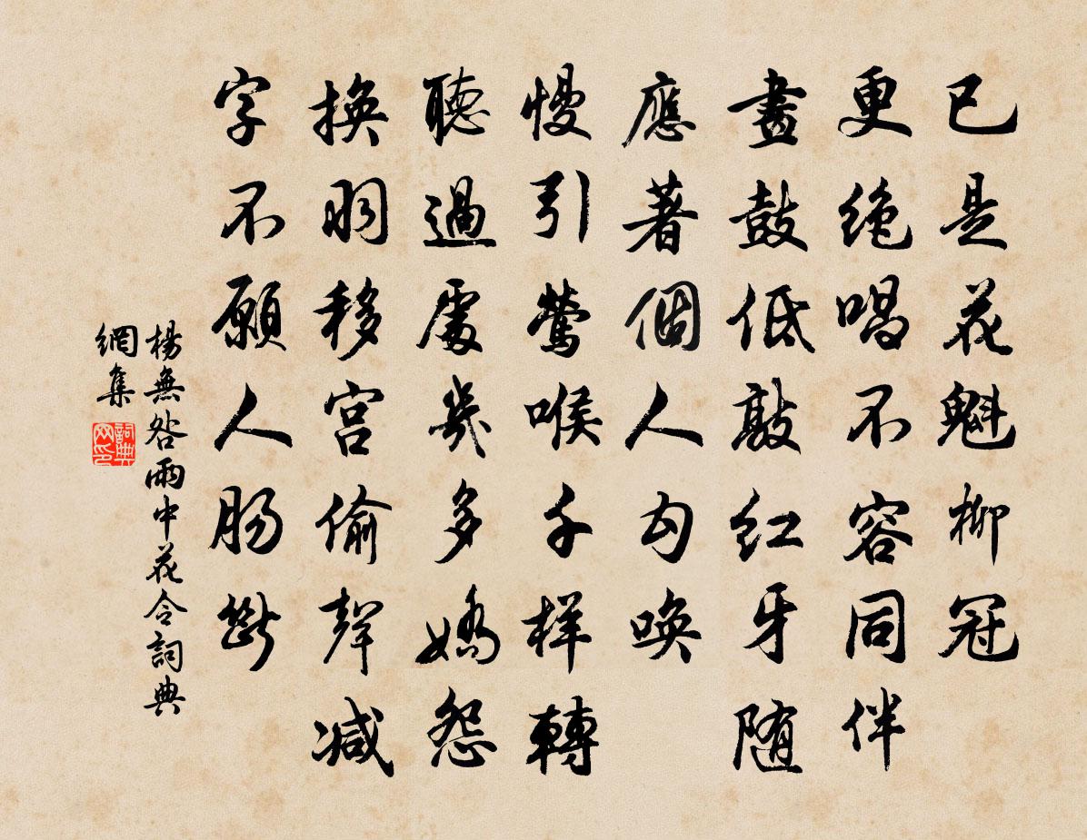 詩詞名句歷史字典書法欣賞書法字典國語詞典說文解字康熙字典古漢語字典標 題 作 者 詩 句 雨中花令作者:楊無咎 朝代:宋代雨中花令原文已是花魁柳冠。更絕唱、不容同伴。畫鼓低敲,紅牙隨應,著個人勾喚。慢引鶯喉千樣轉。聽過處、幾多嬌怨。換羽移宮,偷聲減字,不願人腸斷。詩詞問答問:雨中花令的作者是誰?答:楊無咎問:雨中花令寫於哪個朝代?答:宋代問:雨中花令是什麼體裁?答:詞楊無咎雨中花令書法欣賞雨中花令書法作品詩詞推薦送春鄧肅〔宋代〕宿雨初開萬翠屏,相攜雲水自由身。寸心未逐鶯花老,一笑能留天地春。儻得新詩同刻燭,不妨濁酒共傾銀。往來觀徐復州家書畫七首趙蕃〔宋代〕萬竹陰中屋數間,幾回剝啄叩柴關。忽開短紙霜雪乾,如對照人冰玉顏。寄賀天童滅翁和尚釋紹曇〔宋代〕接人籌室肯雷同,用治後機不犯鋒。把定牢關輕放過,一人標記一株松。別家杜牧〔唐代〕初歲嬌兒未識爺,別爺不拜手吒叉。拊頭一別三千里,何日迎門卻到家?公子錢惟演〔宋代〕蓮勺交衢接荻園,來時十里一開筵。歌翻南國桃根曲,馬過章台杏葉韉。別殿對回雙綬貴,後門歸夜九枝然。閒隨滕達道輓詞二首蘇軾〔宋代〕雲夢連江雨,樊山落木秋。公方占賈鵩,我正買龑牛。共有江湖樂,俱懷畎畝憂。荊溪欲歸老,浮玉偶同游。骯髒相思引袁去華〔宋代〕曉鑒燕脂拂紫綿。未忄欠梳掠髻雲偏。日高人靜,瀋水裊殘煙。春老菖蒲花未著,路長魚雁信難傳。無端風絮,飛方公祠堂迎送神曲李長吉〔宋代〕思公不見兮我心愁,渺八荒兮遠遊。嚴祀事兮歲修,幾來下兮淹留,勤恤祈天兮惠澤同。如父母兮子孫謀,非公休過桃川萬壽宮二首王阮〔宋代〕翁子洞頭魂黯黯,桃川山上目淒淒。自憐終失邯鄲步,不是重來舊路迷。頌古一百二十一首釋宗杲〔宋代〕覓心無處更何安,嚼啐通紅鐵一團。從使眼開張意氣,爭如不受老胡謾。放懷陳師道〔宋代〕施食烏鳶喜,持經鳥鼠聽。杖藜矜矍鑠,顧影怪伶俜。門靜行隨月,窗虛臥見星。擁衾眠未穩,艱阻飽曾經。劉器之陰山七騎圖孔武仲〔宋代〕北風颯颯邊雲黃,飛沙噎日天慘蒼。駕鵝鳴哀雁不翔,七騎正出陰山旁。山傍陰塵歲無陽,鳥飛墮翼人立僵。犯寒滿庭芳 寄趙宣慰平遠姚燧〔元代〕有北先寒,來時鴻雁,記經何地初霜。問渠鵝鸛,何苦上顏行。浩蕩煙波萬頃,怕誰去、爭許三湘。聊容與,誰求感舊張良臣〔宋代〕三十六陂春水綠,四十九年人事非。楊子江頭永嘉後,吳儂盪槳北人稀。酬吳仲庶龍圖暮春感懷曾鞏〔宋代〕瑣闈延閣腹心臣,籍甚聲華動縉紳。藥石言行天下雨,袴襦恩達國中春。召南去後餘思在,綸氏歸來壯志新。莫為絜矩書院示學子章粲〔宋代〕四時配四德,元亨利與貞。天德元最重,方春木主生。夏火物暢茂,是為德之亨。金利秋向實,水貞冬日成。既貞鵲橋仙王惲〔元代〕調羹粉桂。愛香種蕙。自笑秋風野卉。兩椽茅屋對青山,初不羨、入雲高弟。將心自逸。欲行且憩。如愛清時有味送劉耕歸舒州姚鵠〔唐代〕四座莫紛紛,須臾岐路分。自從同得意,誰不惜離群。舊國連青海,歸程在白雲。棄繻當日路,應競看終軍。杜工部有同谷七歌其辭高古難及而音節悲壯可王炎〔宋代〕有婦有婦嬪吾孫,僅能朞月問晨昏。吉凶自古不可定,所以賀吊更在門。人言貧家女難嫁,豈料既嫁俄不存。嗚呼送新知永州潘宮贊若沖赴任、賈黃中〔宋代〕鴛鷺行中已著名,頒條暫慰遠民情。道途行去乘軺貴,鄉里過時晝錦榮。鈴乘積曉江月滿,戟枝寒照雪峰明。知君名句推薦把酒送春春不語。黃昏卻下瀟瀟雨。朱淑真《蝶戀花·送春》 十五入漢宮,花顏笑春紅。李白《怨歌行》 晴雲輕漾,薰風無浪,開樽避暑爭相向。薛昂夫《西湖雜詠·夏》 來如風雨,去似微塵。佚名《增廣賢文·上集》 離恨恰如春草,更行更遠還生。李煜《清平樂·別來春半》 關山四面絕,故鄉幾千里。劉昶《斷句》 君自故鄉來,應知故鄉事。王維《雜詩三首·其二》 天生我材必有用,千金散盡還復來。李白《將進酒》 凡軍欲其眾也,心欲其一也,三軍一心則令可使無敵矣。李昉、李穆、徐鉉《太平御覽·兵部·卷二》 幾時能命駕,對酒落花前。賈島《清明日園林寄友人》