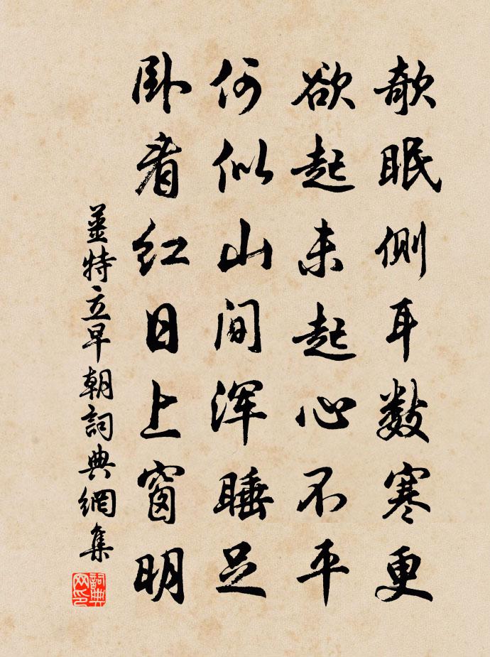 詩詞名句歷史字典書法欣賞書法字典國語詞典說文解字康熙字典古漢語字典標 題 作 者 詩 句 早朝作者:姜特立 朝代:宋代早朝原文欹眠側耳數寒更,欲起未起心不平。何似山間渾睡足,臥看紅日上窗明。詩詞問答問:早朝的作者是誰?答:姜特立問:早朝寫於哪個朝代?答:宋代姜特立早朝書法欣賞早朝書法作品詩詞推薦贈李司空妓劉禹錫〔唐代〕高髻雲鬟宮樣妝,春風一曲杜韋娘。司空見慣渾閒事,斷盡蘇州刺史腸。憶江西(一作南並悼亡友)曹松〔唐代〕前心奈兵阻,悔作豫章分。芳草未歸日,故人多是墳。帆行出岫雨,馬踐過江雲。此地一樽酒,當時皆以文。書香山寺壁強至〔宋代〕精藍孤絕亂雲間,雲外疑無路可還。顧我塵喧非白傅,緣何今日到香山。句陽枋〔宋代〕可奈紅法飛白羽,不容黃叟臥青山。送廣東潘帥移鎮湖南十口號曾豐〔宋代〕廣州初怨失吾侯,逕入中都為借留。上詔廣人好歸去,朕心先已許潭州。偈傾一百六十九首釋智朋〔宋代〕安居禁足,護生殺生。無依倚處,百匝千層。柏山手裹有烏藤。野人李覯〔宋代〕村落蒼茫半草茅,路無車轍水無橋。婚姻取足唯春繭,鹽酪歸來待晚樵。一樣寬衣疑效古,幾人華發未經徭。相逢水調歌頭(次袁仲機韻)朱熹〔宋代〕長記與君別,丹鳳九重城。歸來故里,愁思悵望渺難平。今夕不知何夕,得共寒潭煙艇,一笑俯空明。有酒徑須醉中秋不見月陳與義〔宋代〕去年中秋端正月,照我霑襟萬條血。姮娥留笑侍今年,淨洗金觥對銀闕。高唐妬歸心不閒,招得對姨同作難。豈惟送李翱習之孟郊〔唐代〕習之勢翩翩,東南去遙遙。贈君雙履足,一為上皋橋。皋橋路逶迤,碧水清風飄。新秋折藕花,應對吳語嬌。千巷感事十詩上李侍郎陳造〔宋代〕枉尋固已污,索價則已欺。人生功名念,舒捲自一詩。榮辱取所適,窮達非敢知。及物儻在道,卑官亦可為。咄咄微之就拜尚書居易續除刑部因書賀意兼詠離懷白居易〔唐代〕我為憲部入南宮,君作尚書鎮浙東。老去一時成白首,別來七度換春風。簪纓假合虛名在,筋力銷磨實事空。遠地韓公閱古堂歐陽修〔宋代〕兵閒四十年,士不識金革。水旱數千里,民流誰墾闢。公初來視之,嘻此乃予責。將法多益辦,萬千由十百。整齊和鞏教授訪別二首姜特立〔宋代〕酒醨情惡不成醺,況復匆匆欲語分。留客恨輪無四角,供庖嘆鱉少雙裙。先主廟次唐貞元中張儼詩韻陸游〔宋代〕洛陽化為灰,棘生銅駝陌。討賊志不成,父老泣陵柏。和新城旅店壁間韻葛立方〔宋代〕我本臞山澤,冠裳絆此身。平生只黃卷,晚歲誤朱輪。妓舞山禽怪,騶呼疊穎嗔。會當還此笏,不愧葛天民。甲申歲作楊冠卿〔宋代〕渺渺冰雪盡,欣欣花柳蘇。江澄炫初日,沙潤茁新蔞。久客亦勞止,我行猶載驅。乾坤如許大,何處著吾廬。祝英台(和翁士秀牡丹韻)曾協〔宋代〕放花開,催花謝,誰解東君意。要遣花王,獨占花蹊邃。且看玉鏡台前,霞觴新舉,紅玉軟、曉妝慵試。好風味。望皖公山周必大〔宋代〕太婆嶺獨高秋浦,皖公山正望龍舒。端如牛女隔天漢,不似彭郎近小姑。句趙廱〔宋代〕金風涼夜深,吹我蕭蕭發。名句推薦假作真時真亦假,無為有處有還無。曹雪芹《紅樓夢·第一回》 牆角數枝梅,凌寒獨自開。王安石《梅花 / 梅》 寒山幾堵,風低削碎中原路,秋空一碧無今古。陳維崧《醉落魄·詠鷹》 儉節則昌,淫佚則亡。墨子《墨子·06章 辭過》 願得一心人,白頭不相離。卓文君《白頭吟》 天子居未央,妾侍卷衣裳。李白《秦女卷衣》 枯楊枯楊爾生稊,我獨七十而孤棲。李白《雉朝飛》 昨夜江邊春水生,艨艟巨艦一毛輕。朱熹《活水亭觀書有感二首·其二》 從來幽怨應無數?鐵馬金戈,青冢黃昏路。納蘭性德《蝶戀花·出塞》 尊長前,聲要低。低不聞,卻非宜。李毓秀《弟子規·出則弟》
