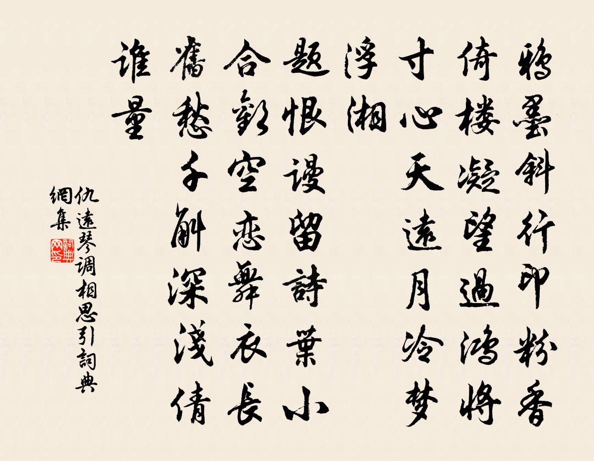 詩詞名句歷史字典書法欣賞書法字典國語詞典說文解字康熙字典古漢語字典標 題 作 者 詩 句 琴調相思引作者:仇遠 朝代:宋代琴調相思引原文鴉墨斜行印粉香。倚樓凝望過鴻將。寸心天遠,月冷夢浮湘。題恨謾留詩葉小,合歡空戀舞衣長。舊愁千斛,深淺倩誰量。詩詞問答問:琴調相思引的作者是誰?答:仇遠問:琴調相思引寫於哪個朝代?答:宋代問:琴調相思引是什麼體裁?答:詞仇遠琴調相思引書法欣賞琴調相思引書法作品詩詞推薦金山寺趙湘〔唐代〕眾木皆穿石,名香自合焚。兩廊吳分月,一閣楚天雲。雨過新燈露,潮平晚磬分。僧吟貝多偈,夜靜釣人聞。重遊南嶽范成大〔宋代〕舍舟得馬如馭氣,步入青松三十里。我從蠻嶺瘴煙來,不怕雨雲進岳趾。憶昔南征款廟庭,往來無恙神所祉。當時己酉生日敬次靖節先生掇輓歌辭三首葉茵〔宋代〕自古皆有死,載歌酹清觴。嗟予早失怙,艱阻亦備嘗。母兮歲六十,終古青松傍。陟岡慟伯氏,忘簪悲孟光。後波菩薩蠻(十一之六)賀鑄〔宋代〕粉香映葉花羞日。窗間宛轉蜂尋蜜。歡罷捲簾時。玉纖勻面脂。舞裙金斗熨。絳襭鴛鴦密。翠帶一雙垂。索人題艷詠史詩荊山胡曾〔唐代〕抱玉岩前桂葉稠,碧谿寒水至今流。空山落日猿聲叫,疑是荊人哭未休。雨中作陸游〔宋代〕三日雨頻作,昏昏饒睡眠。泥深散酒市,風惡惱燈天。茅屋松明照,茶鐺雪水煎。山家自成趣,撫枕寄悠然。競秀閣朱翌〔宋代〕輞川遙展右丞圖,盤谷中藏李原居。龍睡潭深飛客櫂,鳳鳴枝才結吾廬。但令蠟屐去前齒,安用鴟夷托後車。西望春去白居易〔唐代〕一從澤畔為遷客,雨度江頭送暮春。白髮更添今日鬢,青衫不改去年身。百川未有回流水,一老終無卻少人。四十十二月二十六日旦聞東堂啄木聲忽記作福昌尉張耒〔宋代〕睡余聞啄木,忽憶福昌春。官舍題詩壁,如今經幾人。猶能老耽酒,依舊拙謀身。尚想蘭宮路,東風清洛濱。苦雨馬廷鸞〔宋代〕倦夜拋書病不禁,投床無寐雨涔涔。長潸舊國山河淚,細滴孤臣禾黍心。狂象蹋池喧濘淖,飢鴉謀稻愴淋淫。天公望江南李綱〔宋代〕新雨足,一夜滿南塘。禾更稻向成初吐秀,芰荷雖敗尚余香。爽氣入軒窗。澄霽後,遠岫更青蒼。兩部蛙聲鳴鼓吹上章戴灘楊萬里〔宋代〕脫巾枕手仰喔詩,醉上諸灘總不知。回看他船上灘苦,方知它看我船時。晨炊橫塘橋酒家小窗楊萬里〔宋代〕仰聽金衣語,偶窺鶯婦巢。深穿喬木里,危掛弱枝稍。啄菢雙雙子,經營寸寸茅。何時雛脫殼,新哢響交交。臨平道中道潛〔宋代〕風蒲獵獵弄清柔,欲立蜻蜓不自由。五月臨平山下路,藕花無數滿汀州。老陳道人自雲︰夢被召作地上主者;又常受一范成大〔宋代〕野人何苦赴官差,符使追呼撓道懷。幸有千門香積供,不如隨喜去羅齋。春日早起周必大〔宋代〕樓上雲山逐望來,樓前花木及時開。老夫腳力猶強在,不記登臨日幾回。齊雩祭歌 世祖武皇帝謝朓〔南北朝〕浚哲維祖。長發其武。帝出自震。重光御宇。七德攸宣。九疇鹹敘。靜難荊衡。凝威蠡浦。昧旦丕承。夕惕刑政。懷歸史彌寧〔宋代〕倚閣南湖一釣舟,西風將夢到鄉州。蛙蠅名利苦多事,薄有田園歸去休。依韻酬吳春卿二首其一鶴范仲淹〔宋代〕華亭孤立病時身,終日徘徊尚海濱。露掌思高還警夜,芝田音斷欲務春。千年靈氣何求藥,八變奇姿已過人。莫厭代同游者賦宿雲軒呈李果州劉宰〔宋代〕君不見流金鑠石氣如焚。巫祝並禱天不聞。滂霈一雨洗乾坤,膚寸而合山中雲。又不見疾雷契山風助勢,八表同昏名句推薦何事東君,解將芳思,巧綴一斛春冰。朱晞顏《一萼紅·盆梅》 父在,觀其志;父沒,觀其行;三年無改於父之道,可謂孝矣。孔子弟子《論語·學而篇》 無限河山淚,誰言天地寬夏完淳《別雲間》 青青一樹傷心色,曾入幾人離恨中。白居易《青門柳》 微吟不道驚溪鳥,飛入亂雲深處啼。沈周《題畫》 楚水辭魚窟,燕山到雁家裴說《塞上曲》 借得山東煙水寨,來買鳳城春色施耐庵《念奴嬌·天南地北》 時見幽人獨往來,縹緲孤鴻影。蘇軾《卜運算元·黃州定慧院寓居作》 風蕭蕭而異響,雲漫漫而奇色。江淹《別賦》 日習則學不忘,自勉則身不墮徐幹《中論·上卷·治學》