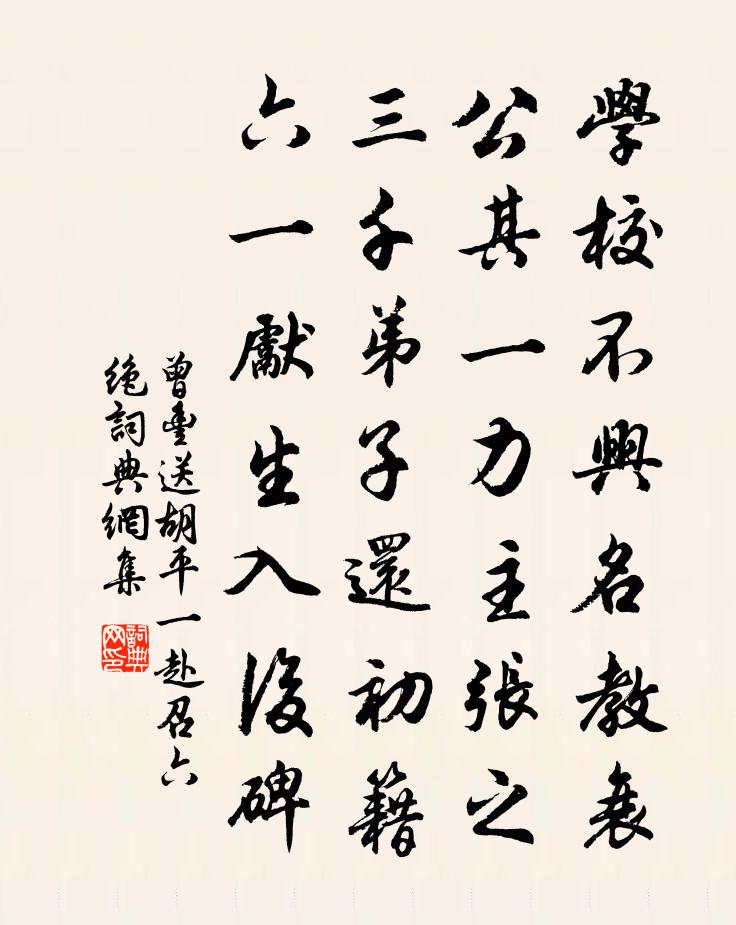 詩詞名句歷史字典書法欣賞書法字典國語詞典說文解字康熙字典古漢語字典標 題 作 者 詩 句 送胡平一赴召六絕作者:曾豐 朝代:宋代送胡平一赴召六絕原文學校不興名教衰,公其一力主張之。三千弟子還初籍,六一先生入後碑。詩詞問答問:送胡平一赴召六絕的作者是誰?答:曾豐問:送胡平一赴召六絕寫於哪個朝代?答:宋代曾豐送胡平一赴召六絕書法欣賞送胡平一赴召六絕書法作品詩詞推薦雲溪雜詠郭印〔宋代〕竹色琅玕立,花光錦繡舒。物情奚得喪,人意妄分疏。污淨川同納,媸妍鑒本虛。和光聊復爾,看取未形初。題黃碧酒肆張沄〔宋代〕東風吹雨水平沙,下卻籃輿訪洒家。行役不知春早暮,牆頭紅杏欲飛花。善慧師禪齋夏竦〔宋代〕是誰名作佛,何法謂之禪。恍惚起無象,逍遙出自然。有修皆障礙,欲問即攀緣。寄語猊床客,心心不易傳。貴溪夜泊寄趙昌甫趙師秀〔宋代〕蓍草占秋動,蓬秋早得歸。本非為事迫,不欲興心違。波淨孤螢度,宵涼數葉飛。遠懷高臥者,微月閉松扉。至學省作蔡肇〔宋代〕平生擾擾復膠膠,學省重來歲又交。騎馬醉遭宮長罵,讀書慚被學生嘲。何為眷戀米三斗,便可經營宅一茅。好買宿楓平楊萬里〔宋代〕休說江西西路行,東來骨瘦卻詩清。恐緣桂玉疏雲子,敢對溪山喚麴生。奉酬皮先輩霜菊見贈崔璞〔唐代〕菊花開晚過秋風,聞道芳香正滿叢。爭奈病夫難強飲,應須速自召車公。秦紀劉克莊〔宋代〕土廣曾吞九雲夢,民勞因起一阿房。人皆憐楚三戶在,天獨天秦二世亡。發潯陽孔武仲〔宋代〕西遊不敢避殘年,兄弟分攜楚水邊。浩蕩東風回草木,朦瞳曉色滿山川。卻穿梅徑花爭落,久憩郵亭日未偏。安佚重送王十杜牧〔唐代〕分袂還應立馬看,向來離思始知難。雁飛不見行塵滅,景下山遙極目寒。六祖贊釋道沖〔宋代〕七百高僧總會禪,眼空四海鼻遼天。黃梅若也無私曲,有甚衣盂到汝傳。之官五羊,過太和縣登快閣,觀山谷石刻,賦楊萬里〔宋代〕閣中陳跡故依然,欲問風流已百年。南岸一峰東一塔,自言曾試老詩仙。鷓鴣天(宴王園作)郭應祥〔宋代〕休道泉江寂寞濱。喧喧歌吹遍城闉。莫辭邀賞連三日,且慶開禧第一春。呼小隊,領嘉賓。王園佳處踏芳塵。星球思越人張泌〔唐代〕燕雙飛,鶯百轉,越波堤下長橋。斗鈿花筐金匣恰,舞衣羅薄纖腰。東風澹蕩慵無力,黛眉愁聚春碧。滿地落花無偈頌一百一十七首釋紹曇〔宋代〕浴乎沂,舞雩歸。道存目擊,樂以忘機。嗟嘆賓士途路客,拋家失業有誰知。杜鵑啼出血,勸得幾人歸。華峰亭喻良能〔宋代〕華峰抱紫翠,茲亭瞰清幽。春林羅畫屏,新月吐玉鉤。宛如東屯居,恍若南澗游。信美吾亦樂,特用慰淹留。牢落羅公升〔宋代〕牢落歲時晚,天寒遊子悲。機幾如趙壹,舌不救張儀。夢短雞聲急,心飛雁足遲。亂愁已堪織,零雨更如絲。感皇恩(壽鉛山陳丞及之)辛棄疾〔宋代〕富貴不須論,公應自有。且把新詞祝公壽。當年仙桂,父子同攀希有。人言金殿上,他年又。冠冕在前,周公拜手八月八日發潭州後得絕句四十首趙蕃〔宋代〕仰山林壑舊曾游,擬欲重尋不自由。倚賴艤舟相對處,為予排闥向城頭。題畫十首唐寅〔明代〕野水荒亭氣象幽,山深因少客來游。啼禽欲歇煙霞暝,一對西風落葉秋。名句推薦理直千人必往,心虧寸步難移。馮夢龍《醒世恆言·卷十六》 瞿塘嘈嘈十二灘,此中道路古來難。劉禹錫《竹枝詞九首·其七》 苦雨思白日,浮云何由卷。李白《玉真公主別館苦雨贈衛尉張卿二首》 白雪卻嫌春色晚,故穿庭樹作飛花。韓愈《春雪》 新年都未有芳華,二月初驚見草芽。韓愈《春雪》 山舞銀蛇,原馳蠟象,欲與天公試比高 * 《沁園春·雪》 野花不種年年有,煩惱無根日日生。馮夢龍《警世通言·卷二十》 明朝望鄉處,應見隴頭梅。宋之問《題大庾嶺北驛》 送君如昨日,檐前露已團。江淹《古離別》 以五十步笑百步。孟子《孟子·梁惠王章句上·第三節》