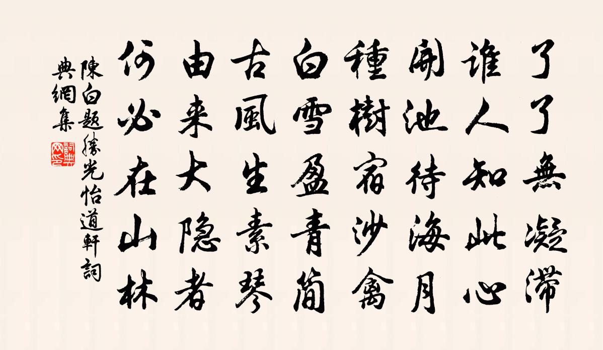 詩詞名句歷史字典書法欣賞書法字典國語詞典說文解字康熙字典古漢語字典標 題 作 者 詩 句 題勝光怡道軒作者:陳白 朝代:宋代題勝光怡道軒原文了了無凝滯,誰人知此心。開池待海月,種樹宿沙禽。白雪盈青簡,古風生素琴。由來大隱者,何必在山林。詩詞問答問:題勝光怡道軒的作者是誰?答:陳白問:題勝光怡道軒寫於哪個朝代?答:宋代陳白題勝光怡道軒書法欣賞題勝光怡道軒書法作品詩詞推薦哭劉四尚書(勒於碑陰)權德輿〔唐代〕士友惜賢人,天朝喪守臣。才華推獨步,聲氣幸相親。理析寰中妙,儒為席上珍。笑言成月旦,風韻挹天真。丹地洞仙歌劉弇〔宋代〕淒涼楚弄,行客腸曾斷。濤卷秋容暗淮甸。去年時、還是今日孤舟,煙浪里,身與江雲共遠。別來丹枕夢,幾過滄丁卯元日十首劉克莊〔宋代〕瞎翁九起茅檐下,失喜繁星滿樹梢。想泰元尊衰景貺,知新天子講初郊。懷友陳柏〔宋代〕攜書入空山,幾若幾世絕。俯仰一室間,頗見古人別。良朋令人思,思君意彌切。食芹差自甘,那得共君啜。米元章寶月觀詩帖贊岳珂〔宋代〕月之行空,四海清輝,豈獨於一觀見之。覽層宇之翬,地高而天隨,而後可以觀公之詩。梅花陸游〔宋代〕冰崖雪谷木未芽,造物破荒開此花。神全形枯近有道,意莊色正知無邪。高堅政要飽憂患,放棄何遽愁荒遐。移根浦江道中三絕鄭剛中〔宋代〕籃輿風緊揭心簾,雨著春衣潤欲粘。滿眼陰雲壓平野,此時懷抱惡憎惡。碾驢鞍判羅紹威〔唐代〕鄴城大道甚寬,何故駕車碾鞍?領鞴驢漢子科決,待駕車漢子喜歡。春半桃李盛開陳宓〔宋代〕縞裙練帨映丹霞,默默無言不自誇。陌上行人重回首,一年春事數朝花。答林祖武劉克莊〔宋代〕向來思鈍費冥搜,不覺呻吟到白頭。曾與乃翁分雪案,今看吾子突煙樓。晚多借月留雲作,卻悔升天入海求。大有臨江仙(壽師幕)李廷忠〔宋代〕秋到三山呈瑞氣,斑斑繡虎廣章。早分桂殿一枝香。婉謀參幕府,華署等朝行。駕月姮娥來獻壽,勝如昨夜輝光。法雲寺和湯立賢留題王之道〔宋代〕寺占湖邊數畝山,杖藜偷得一朝閒。昨朝恰別居巢長,又喜新詩在壁間。贈胡端本顯伯教諭二首方回〔宋代〕芙蓉嶺外矮窗開,夜讀燈從祖父來。四海八荒□□□,□山一壑絕塵埃。生涯晚節香 * ,世德清陰映綠槐。□□滿江紅 別毗陵二十載,一日北歸,艤舟訪舊周權〔元代〕戲調此詞以自述獨酌新豐,任疏放、從人不識。還只是、舊時把酒,秋風狂客。顛倒天吳歸短褐,風濤歲月頭將白和潁川公秋夜詩庾信〔南北朝〕泬寥空色遠。葉黃淒序變。洞浦落遵鴻。長飈送巢燕。千秋流夕景。百籟含宵囀。峻雉聆金柝。曾台切銀箭。空城雀(一作孟郊詩)聶夷中〔唐代〕一雀入官倉,所食能損幾。所慮往損頻,官倉乃害爾。魚網不在天,鳥網不在水。飲啄要自然,何必空城裡。舊將劉筠〔宋代〕丈八蛇矛戰血乾,子孫今已列材官。青煙碧瓦開新第,白草黃雲廢舊壇。勞薄可甘先蘭舌,爵高還許戴劉冠。秋來竹枝歌十首汪元量〔宋代〕快風吹我入三巴,桂櫂蘭橈倚暮花。一道月明天似水,湘靈鼓瑟下長沙。望江南淨圓〔宋代〕西方好,群鳥美音聲。華下和鳴歌六度,光中哀雅攢三乘。聞者悟無生。三惡道,猶自不知名。皆是佛慈親變化,送文總管朝燕四首劉應鳳〔宋代〕滿眼平疇草自春,烏鴉無數是耘丁。鬼神如奉君王問,為說東南燐火青。名句推薦江南三月聽鶯天,買酒莫論錢。吳錫麒《少年游·江南三月聽鶯天》 帆影依依楓葉外,灘聲汩汩碓床間查慎行《雨過桐廬》 佳人重勸千長壽。柏葉椒花芬翠袖。毛滂《玉樓春·己卯歲元日》 克城以武,戡亂以仁。張廷玉《明史·本紀·卷一》 蕭條亭障遠,悽慘風塵多庾信《擬詠懷二十七首·其二十六》 日暖泥融雪半消,行人芳草馬聲驕。杜牧《宣州送裴坦判官往舒州時牧欲赴官歸京》 坡謂西湖,正如西子,濃抹淡妝臨鏡台。劉過《六州歌頭·寄稼軒承旨》 笙歌散後酒初醒,深院月斜人靜。司馬光《西江月·寶髻松松挽就》 古戍蒼蒼烽火寒,大荒沈沈飛雪白。李頎《聽董大彈胡笳聲兼寄語弄房給事》 素娥無賴,西去曾不為人留。蘇轍《水調歌頭·徐州中秋》