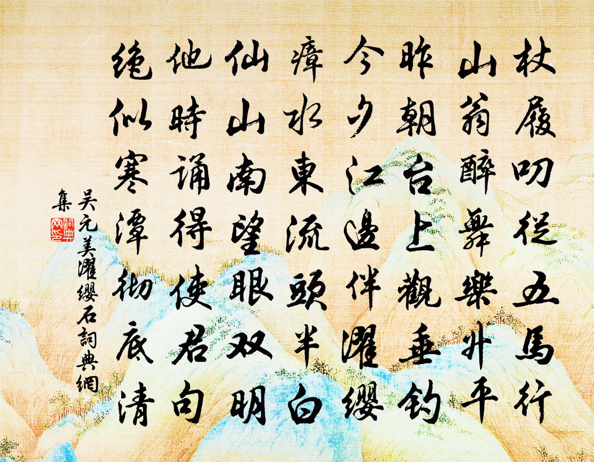 詩詞名句歷史字典書法欣賞書法字典國語詞典說文解字康熙字典古漢語字典標 題 作 者 詩 句 濯纓石作者:吳元美 朝代:宋代濯纓石原文杖履叨從五馬行,山翁醉舞樂昇平。昨朝台上觀垂釣,今夕江邊伴濯纓。瘴水東流頭半白,仙山南望眼雙明。他時誦得使君句,絕似寒潭徹底清。詩詞問答問:濯纓石的作者是誰?答:吳元美問:濯纓石寫於哪個朝代?答:宋代吳元美濯纓石書法欣賞濯纓石書法作品詩詞推薦次韻劉寬夫題學士進此庵李彌遜〔宋代〕道人清淨觀,夢幻閱諸有。成心自得師,率世方結友。默如彼上人,語合亡是叟。問焉一得三,疑者十居九。人情禪人並化主寫真求贊釋正覺〔宋代〕太行盤紆,黃河泄舒。肝膽明潔,胸膺廓虛。清風未生齒頰,白雪已上眉須。少林之默無他說,黃梅之舂不識書。送新蓬州程倅吳泳〔宋代〕宛宛黃柳絲,錐錐雜花垂。柳解織別愁,花能送春歸。思君遠行邁,遊子心依依。有弦不解揮,有鏡不復治。豈是張寺丞鳴玉亭書事祖無擇〔宋代〕為憐瀟灑近城闉,來往何曾問主人。列岫曉昏雲鬱郁,流泉秋淨石粼粼。陸機詩就伏招隱,班固文成正答賓。愁見楊梅塢楊蟠〔宋代〕夏日紅相照,天晴塢自開。襄陽多稚子,摘贈故人來。廣陵送林宰李嘉祐〔唐代〕清政過前哲,香名達至尊。明通漢家籍,重識府公恩。春景生雲物,風潮斂雪痕。長吟策羸馬,青楚入關門。月牖朱元升〔宋代〕誰將造化手,開此混沌竅。每夜吐月時,九州同一照。隱居雜興楊公遠〔宋代〕籬編紅槿障蓬茅,半探測城闉半近。苔繡曲蹊千萬點,梅窺碧沼兩三梢。閒將今古澆胸臆,嫩把榮枯問卦爻。一自戴少美輓詞林亦之〔宋代〕一聲哀管水邊聞,忽憶秋風留月軒。洛下書生來問字,襄陽耆舊亦過門。游梁無限通宵話,訪戴如今何處村。縱使題凌波採蓮圖楊冠卿〔宋代〕綽約風姿雲霧衣,波心新月映明輝。更深折得清香去,煙靄不知何處歸。食米倉宋沆〔宋代〕陋巷顏回獨屢空,生涯惟在一瓢中。太倉腐粟雖山積,非義寧甘君子窮。將使契丹九日對酒懷子瞻兄並示坐中蘇轍〔宋代〕黃華已向初旬見,白酒相攜九日嘗。萸少一枝心自覺,春同斗粟味終長。蘭生庭下香時起,玉在人前坐亦涼。千里九日對菊有懷粹老在河上四首黃庭堅〔宋代〕碧窗閒殺春風手,古柳堤鶯幾日回。縱有黃花堪對酒,應無紅袖與傳杯。從軍行戎昱〔唐代〕昔從樓梯李都尉,樓梯雙鞬照馬樓梯蹄。擒生黑山北,殺敵黃雲西。太白沈虜地,邊草復萋萋。歸來邯鄲市,百尺送王道士還京賈至〔唐代〕一片仙雲入帝鄉,數聲秋雁至衡陽。借問清都舊花月,豈知遷客泣瀟湘。蝶戀花仇遠〔宋代〕碧樹殘鵑啼未歇。昨夜春歸,不與行人別。留得綠楊枝上月。曉風吹作晴天雪。龜甲屏低紅疊疊。火暖萸煙。羅薦贈寫照吳生方岳〔宋代〕幾人堪畫麒麟閣,萬事不如鸚鵡杯。只謂故吾詩瘦耳,寒沙鷗鷺莫驚猜。題鄭拾遺南齋許棠〔唐代〕明時無事諫,豈是隱明君。每值離丹陛,多陪宴白雲。門連蕭洞僻,地與曲江分。滿院皆檉竹,期棲鸞鶴群。示阿泰三首陳造〔宋代〕老稚懸知樂有餘,迎門先問小於菟。風煙滿眼山環海,對酒還曾斲句無。乙卯正月別子融陳文蔚〔宋代〕相逢便欲作歸謀,為子殷勤一日留。山好不妨和雨看,水平重得繞湖游。酒須更放微醺飲,詩亦無勞著意求。別去名句推薦積善逢善,積惡逢惡。馮夢龍《喻世明言·卷二十六》 春日游,杏花吹滿頭。韋莊《思帝鄉·春日游》 莫遣只輪歸海窟,仍留一箭射天山。李益《塞下曲》 鳥下綠蕪秦苑夕,蟬鳴黃葉漢宮秋。許渾《鹹陽城東樓 / 鹹陽城西樓晚眺 / 西門》 落日心猶壯,秋風病欲疏。杜甫《江漢》 凡斗者,必自以為是而以人為非也。荀子《荀子·榮辱》 淡淡橫朝煙,脈脈深秋思。劉道著《湘江秋曉》 貧居往往無煙火,不獨明朝為子推。孟雲卿《寒食》 爭奈醒來,愁恨又依然朱淑真《江城子·賞春》 江間波浪兼天涌,塞上風雲接地陰。杜甫《秋興八首·其一》
