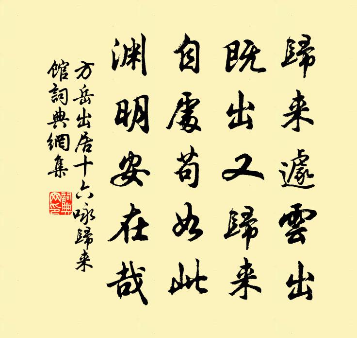 詩詞名句歷史字典書法欣賞書法字典國語詞典說文解字康熙字典古漢語字典標 題 作 者 詩 句 出居十六詠歸來館作者:方岳 朝代:宋代出居十六詠歸來館原文歸來遽雲出,既出又歸來。自處苟如此,淵明安在哉。詩詞問答問:出居十六詠歸來館的作者是誰?答:方岳問:出居十六詠歸來館寫於哪個朝代?答:宋代方岳出居十六詠歸來館書法欣賞出居十六詠歸來館書法作品詩詞推薦庚辰元旦王冕〔元代〕試題春帖紀新年,靄靄青雲起硯田。展卷不知山是畫,舉頭恰喜屋如船。梅花雪後開無數,楊柳風前困欲眠。悵望句釋惠崇〔宋代〕危溜含清瑟,飛花點玉觴。詠史下陸機陳普〔宋代〕須信雕蟲不用工,至今天地不相容。君看奕葉東吳陸,轉作詞章便覆宗。句周海〔宋代〕十里平郊連郡堞,一溪清水溉民田。銅雀台(一作沈佺期詩)宋之問〔唐代〕昔年分鼎地,今日望陵台。一旦雄圖盡,千秋遺令開。綺羅君不見,歌舞妾空來。恩共漳河水,東流無重回。書王定國所藏王晉卿畫著色山二首蘇軾〔宋代〕白髮四老人,何曾在商顏。煩君紙上影,照我胸中山。山中亦何有,木老土石頑。正賴天日光,澗谷紛斕斑。我心循梅路口四首劉克莊〔宋代〕鈔法如弓末愈張,可堪於比更求詳。只應新執牙籌者,拾得研桑肘後方。新灘三首李流謙〔宋代〕蜀船南來去未休,吳船西上到沙頭。人生能著幾兩屐,三峽風煙替往愁。詠鳧文同〔宋代〕雙雙紋羽弄清漪,全得天真似爾稀。萬頃滄波供口腹,一梁寒日曬毛衣。雨歸別島嘔唲語,風度前灘翕呷飛。好向失意書懷呈知己馬戴〔唐代〕直道何由啟聖君,非才誰敢議論文。心存黃籙與丹訣,家憶青山與白雲。麋鹿幽棲閒可近,鴛鸞高舉勢宜分。微生點絳唇廖行之〔宋代〕此去何之,駢闐車馬朝來起。揚鞭西指。意氣眉間是。閭里兒童,競矚秦蕭史。歸時幾。快瞻行李。還看如雲喜。寒食清明十首劉克莊〔宋代〕楊柳堤邊立,荼醾架下行。不知一遺老,更看幾清明。和侃法師三絕詩 三庾信〔南北朝〕回首河堤望。眷眷嗟離絕。誰言舊國人。到在他鄉別。吊曹覲曾公亮〔宋代〕款軍樵門日再晡,空弮猶自把戈鈇。身垂虎口方安坐,命若鴻毛竟敗呼。柱下杲卿曾斷骨,袴中杵臼得遺孤。可憐贈鏡湖相士文天祥〔宋代〕五月五日揚子江心水,鑄作道人雙瞳子。吾面碟子大,安用鏡照二百里。擬歐陽舍人古篆黃庶〔宋代〕隸鬼滿紙籀文鬼,字法破碎失本根。中間陽冰入篆室,下筆日與丞相親。點畫各得萬物體,科蚪筋骨千載新。泉銘送張寺丞知常州項安世〔宋代〕吾鄉人物鄭與張,堂堂介圭出琳琅。論文合草北扉制,論經合講金華藝。兩途未遂如命何,四方為君充撫摩。鄭公菖蒲最難養置而弗省則弗滋勤勤拂拭則病矣余舒岳祥〔宋代〕多忘昏昏久廢書,閒來石上采菖蒲。瘦鞭走石蛟龍窟,細葉穿苔虎豹須。陰洞容光明復晦,乳泉盈坎潤難枯。試拈送崔黃臣殿丞之任廬山梅堯臣〔宋代〕驊駒西行四千里,直度經橋百尋水。石上菖蒲未見花,蒙頂茶牙初似觜。采時應憶故園春,故園開焙亦思人。其間思歸引陸游〔宋代〕善泅不如穩乘舟,善騎不如謹持轡。妙於服食不如寡慾,工於揣摩不如省事。在天有命誰得逃,在我無求直差易。名句推薦天時懟兮威靈怒,嚴殺盡兮棄原野。屈原《國殤》 細草微風岸,危檣獨夜舟。杜甫《旅夜書懷》 日暮九疑何處?認舜祠叢竹。文廷式《好事近·湘舟有作》 黃埃散漫風蕭索,雲棧縈紆登劍閣。白居易《長恨歌》 清談可以飽,夢想接無由。韓愈《洞庭湖阻風贈張十一署·時自陽山徙掾江陵》 兵者兇器,將者危任,是以器剛則缺,任重則危。諸葛亮《將苑·卷一·將志》 人情似紙張張薄,世事如棋局局新。佚名《增廣賢文·上集》 蓬頭稚子學垂綸,側坐莓苔草映身。胡令能《小兒垂釣》 雁柱十三弦,一一春鶯語。歐陽修《生查子·含羞整翠鬟》 但箭雁沈邊,梁燕無主。劉辰翁《蘭陵王·丙子送春》