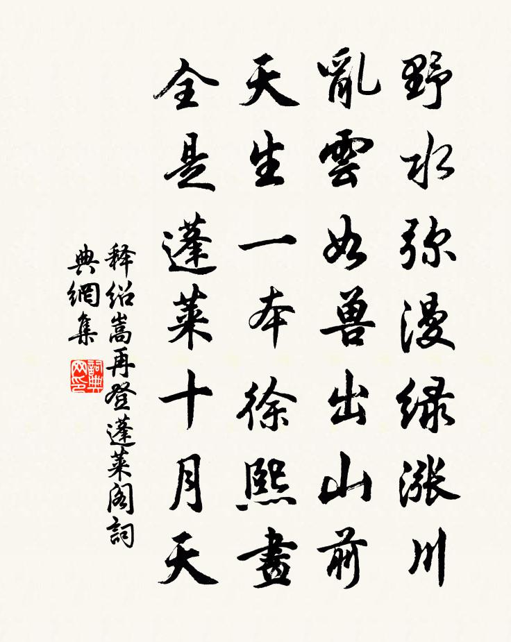 詩詞名句歷史字典書法欣賞書法字典國語詞典說文解字康熙字典古漢語字典標 題 作 者 詩 句 再登蓬萊閣作者:釋紹嵩 朝代:宋代再登蓬萊閣原文野水瀰漫綠漲川,亂雲如獸出山前。天生一本徐熙畫,全是蓬萊十月天。詩詞問答問:再登蓬萊閣的作者是誰?答:釋紹嵩問:再登蓬萊閣寫於哪個朝代?答:宋代釋紹嵩再登蓬萊閣書法欣賞再登蓬萊閣書法作品詩詞推薦解珮令(本意)王庭珪〔宋代〕湘江停瑟。洛川回雪。是耶非、相逢飄瞥。雲鬢風裳,照心事、娟娟山月。翦煙花、帶蘿同結。留環盟切。貽珠情登張知省溪樓林季仲〔宋代〕木落霜清橘柚香,榜歌迢遞起滄浪。來鴻去鶩紛無數,怕上西樓望夕陽。八月十日夜看月有懷子由並崔度賢良蘇軾〔宋代〕宛丘先生自不飽,更笑老崔窮百巧。一更相過三更歸,古柏陰中看參昴。去年舉君苜蓿盤,夜傾閩酒赤如丹。今年寄題壽師塔南軒何昌弼〔宋代〕焚修七十載,內外已圓成。教相論因果,冥心契死生。紙窗應自白,花砌本無情。燕坐觀浮世,誰非走利名。客中臨歸仍送游教諭真山民〔宋代〕建括相望天一涯,快哉此地話襟期。芹邊春暖幾杯酒,門外月高千首詩。去去先生此休矣,棲棲遊子暮何之。送行和至聊述懷二首王炎〔宋代〕老氣軒昂驥躡雲,丘園盤薄不求聞。詩方平淡如摩詰,人亦清真似右軍。無以為家那得爾,幸哉有子不徒雲。鳳雛游武夷葉樞〔宋代〕孤台起天半,群峰羅崔巍。大王挺其間,玉女相因依。上攀牛半墟,下窺鷗鷺磯。神仙遙可接,靈草正秋肥。念此過洞庭青草湖黃庭堅〔宋代〕乙丑越洞庭,丙寅渡青草。似為神所憐,雪上日杲杲。我雖貧至骨,猶勝杜陵老。憶昔上岳陽,一飯從人討。行矣上蒙里灘楊萬里〔宋代〕清江斜抱嶺根來,暗石衝波卻倒回。幸自琉璃青一片,落灘碎作雪花堆。卜宅章甫〔宋代〕卜宅定何好,廬山泉石奇。夜夢五老人,問我歸何時。山中有蕨薇,可以療子飢。束書早歸來,長歌歌紫芝。董嬌饒宋子侯〔兩漢〕洛陽城東路,桃李生路旁。花花自相對,葉葉自相當。春風東北起,花葉正低昂。不知誰家子,提籠行採桑。縴手鷓鴣天周紫芝〔宋代〕彩鷁雙飛雪浪翻。楚歌聲轉綠楊灣。一川紅旆初銜日,兩岸朱樓不下簾。闌倚處,玉垂纖。白團扇底藕絲衫。未成春日聞禽戲題寓廨蒲壽宬〔宋代〕隔牆聽幽哢,入坐春隔隔。午夢恬不成,始知身在籠。李士曹廳對雨錢起〔唐代〕春雨暗重城,訟庭深更寂。終朝人吏少,滿院煙雲集。濕鳥壓花枝,新苔宜砌石。掾曹富文史,清興對詞客。愛爾題陳晉卿頤齋曾豐〔宋代〕鯤鵬振翼初九萬,楩楠歸根終數寸。稚須有發老有收,養之各要適欺發。三兒讀書翁臥聽,生涯固有何所營。功名和人語道吟邵雍〔宋代〕吾道昭昭是可尊,豈宜他適復□□。珠藏水底川須媚,月到天心夜不昏。禮樂不□□□□,詩書自可造形論。直須逍遙詠宋太宗〔宋代〕清靜常清靜,緣來盡可行。道高麋鹿性,庸識歲年輕。日昃相依勢,花開觸處明。是非論巧拙,達外福蒼生。秋夜不寐楊萬里〔宋代〕秋氣侵人冷欲永,不由老境不愁生。雨聲己遣儂無睡,更著寒蛩泣到明。次韻李公朝著作見贈二首蘇轍〔宋代〕遠客徒為爾,江邊有故丘。江洲信廣大,鳧雁任漂浮。好事時攜酒,歸心久倦遊。還鄉定衰老,朋友肯相收。稽古磅拙庵住洪福釋鹹傑〔宋代〕瞎驢生得瞎驢兒,齷齪聲名徹四維。更把少林無孔備,逢人應是逆風吹。名句推薦處世讓一步為高,退步即進步的張本洪應明《菜根譚·概論》 今夕復何夕,共此燈燭光。杜甫《贈衛八處士》 凡與敵戰,若有形勢便利之處,宜爭先據之,以戰則勝。佚名《百戰奇略·第四卷·爭戰》 雲白山青萬餘里,愁看直北是長安杜甫《小寒食舟中作》 長風破浪會有時,直掛雲帆濟滄海。李白《行路難·其一》 花間一壺酒,獨酌無相親。李白《月下獨酌四首·其一》 通則驕而偏,窮則棄而儑。荀子《荀子·不苟》 陽春布德澤,萬物生光輝。佚名《長歌行》 台在山腰,一峰突起,離水十餘丈。沈復《浮生六記·浪遊記快》 獨行潭底影,數息樹邊身。賈島《送無可上人》