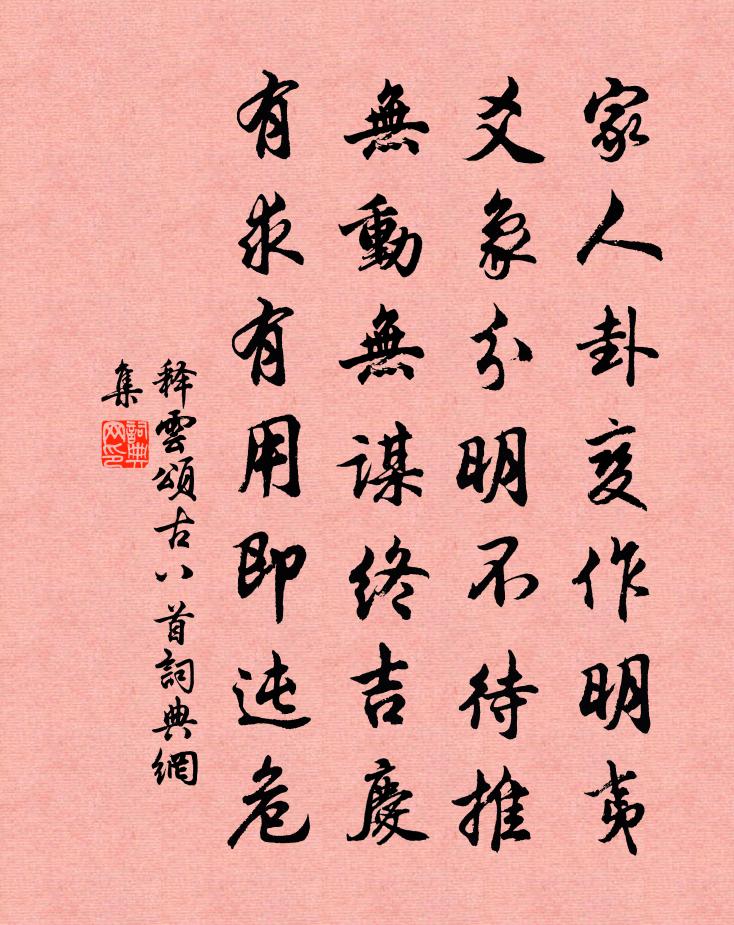 詩詞名句歷史字典書法欣賞書法字典國語詞典說文解字康熙字典古漢語字典標 題 作 者 詩 句 頌古八首作者:釋雲 朝代:宋代頌古八首原文家人卦變作明夷,爻象分明不待推。無動無謀終吉慶,有求有用即迍危。詩詞問答問:頌古八首的作者是誰?答:釋雲問:頌古八首寫於哪個朝代?答:宋代釋雲頌古八首書法欣賞頌古八首書法作品詩詞推薦和劉仙尉詠梅舒岳祥〔宋代〕垂垂一樹壓疏籬,最愛崚嶒鶴膝枝。只占歲寒花盡後,不爭開早與開遲。朝中措(月季)趙師俠〔宋代〕開隨律琯度芳辰。鮮艷見天真。不比浮花浪蕊,天教月月常新。薔薇顏色,玫瑰態度,寶相精神。休數歲時月季,寄題荊南王君行牧齋項安世〔宋代〕千斤黑牸將黃犢,八歲山童手堅竹。呵牛行前童御之,坤艮為謙直初六。夷山入地山已庫,微陰更在山之麓。觀爻秋夜不寐寄崔溫進士周朴〔唐代〕愁多難得寐,展轉讀書床。不是旅人病,豈知秋夜長。歸鄉憑遠夢,無夢更思鄉。枕上移窗月,分明是淚光。朝中措范成大〔宋代〕繫船沽酒碧簾坊。酒滿勝鵝黃。醉後西園入夢,東風柳色花香。水浮天處,夕陽如錦,恰似鱸鄉。中有憶人雙淚,賦雪李洪〔宋代〕閶闔風勢饕,朔雪夜方積。窗隙散明璣,瓦溝露微白。讙譁競兒曹,跼蹐愁病客。漢淮鐵衣冷,勦敵要長策。安得詠懷庾信〔南北朝〕楚材稱晉用,秦臣即趙冠。離宮延子產,羈旅接陳完。寓衛非所寓,安齊獨未安。雪泣悲去魯,悽然憶相韓。唯彼西江月·攜手看花深徑賀鑄〔宋代〕攜手看花深徑,扶肩待月斜廊。臨分少佇已倀倀。此段不堪回想。欲寄書如天遠,難銷夜似年長。小窗風雨碎人腸撫州江口雨中作韋莊〔唐代〕江上閒沖細雨行,滿衣風灑綠荷聲。金騮掉尾橫鞭望,猶指廬陵半日程。訊黃乙山於壽寧寺黃敏求〔宋代〕草草茅亭古木間,萬琅玕里一禪關。秋陰只俟風收盡,分我浮生增日閒。香林董嗣杲〔宋代〕日月岩頭古翠埋,綿雲深隔洞門開。蒼藤隨石無根活,靈杞何年有種栽。氣凝野煙疑麝過,暖熏山雨誤蜂來。空亭澗壁阻風登小山四望書懷孫應時〔宋代〕崇阿岩長江,荒蹊得徐步。徘徊一舒眺,邂逅豁心素。天壤故寵廓,川塗渺回互。蒼煙極東溟,落日臨北固。波光觀周曾秋塘圖有作王沂孫〔宋代〕秋,秋。蕭灑,清幽。人靜處,水邊頭。波細紋紋,風色颼颼。鷗鷺情相狎,鳧鴛樂自由。疏葦敗荷池沼,白苹紅平原郡王南園詩二十一首鮮霞姜特立〔宋代〕蟠桃花發景爭新,流水漂香幾換春。洞口霞光長蔽日,須知中有武陵人。至元廿四年十一月二十日得宣命詣朝可庵有詩方逢振〔宋代〕雪棹殷勤泛剡溪,吟香為拂案頭埃。老軀久已乞骸去,瘦骨應難入畫來。但願東皇憐病瘦,早從西華覓雲台。當年贈致仕沈彬郎中李中〔唐代〕自言婚嫁畢,塵事不關心。老去詩魔在,春來酒病深。山翁期採藥,海月伴鳴琴。多謝維舟處,相留接靜吟。自題山亭三首徐鉉〔唐代〕簪組非無累,園林未是歸。世喧長不到,何必故山薇。小舫行乘月,高齋臥看山。退公聊自足,爭敢望長閒。跂石祖逖徐鈞〔宋代〕慷慨才能立志堅,計謀端可定中原。晉元倘使圖經略,事業韓彭可比肩。步蟾宮佚名〔宋代〕蓂開四葉祥光發。又還是、清和時節。昴星呈瑞夜來明,慶此日、挺生英傑。少年玉樹神清澈。未說到、龜齡鶴髮芙蓉五絕呈景仁韓維〔宋代〕小沾清露細搖風,養得新花北第紅。客至莫教樽酒燥,朝吟夕賞未知窮。名句推薦可惜重陽,不把黃花與。吳文英《蝶戀花·九日和吳見山韻》 寸寸微雲,絲絲殘照,有無明滅難消。賀雙卿《鳳凰台上憶 * ·寸寸微雲》 借得山東煙水寨,來買鳳城春色施耐庵《念奴嬌·天南地北》 少小雖非投筆吏,論功還欲請長纓。祖詠《望薊門》 西宮南內多秋草,落葉滿階紅不掃。白居易《長恨歌》 唯有閒愁將不去,依舊住,伴人直到黃昏雨。段克己《漁家傲·詩句一春渾漫與》 不將辛苦意,難近世間財。馮夢龍《醒世恆言·卷十四》 山黛遠,月波長,暮雲秋影蘸瀟湘。蔡松年《鷓鴣天·賞荷》 秋波落泗水,海色明徂徠。李白《魯郡東石門送杜二甫》 美人結長想,對此心悽然。李白《折楊柳》