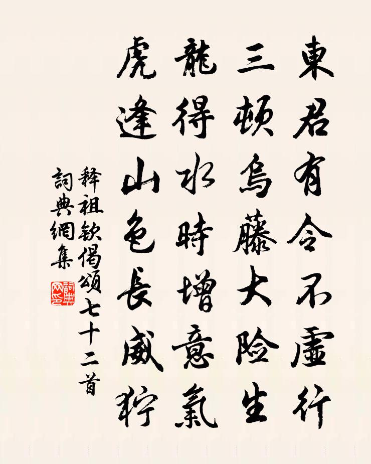 詩詞名句歷史字典書法欣賞書法字典國語詞典說文解字康熙字典古漢語字典標 題 作 者 詩 句 偈頌七十二首作者:釋祖欽 朝代:宋代偈頌七十二首原文東君有令不虛行,三頓烏藤大險生。龍得水時增意氣,虎逢山色長威獰。詩詞問答問:偈頌七十二首的作者是誰?答:釋祖欽問:偈頌七十二首寫於哪個朝代?答:宋代釋祖欽偈頌七十二首書法欣賞偈頌七十二首書法作品詩詞推薦偈頌二十一首釋堅璧〔宋代〕十日梅天曉未晴,千岩俱作偃溪聲。直饒透出威音外,猶較曹山半月程。人日雪陸游〔宋代〕病臥江村不厭深,貂裘無奈曉寒侵。非賢那畏蛇年至?多難卻愁人日陰。嫋嫋孤雲生翠壁,霏霏急雪灑青林。一盂送張無夢歸天台陳越〔宋代〕紫籍仙階貴,丹丘隱路深。五圖傳秘訣,三祝契堯心。瓢飲和瓊蕊,樓居接桂陰。宸歌旌有道,垂象賁中林。【雙調】新水令_攪閒風吹散關漢卿〔元代〕攪閒風吹散楚台天,天對付滿懷愁悶。您那裡歡娛嫌夜短,俺寂寞恨長更。恰似線斷風箏,絕魚雁杳音信。【駐馬綠陰蘇泂〔宋代〕佳木豐交午蔭稠,門闌青草沒階頭。道人洗淨箏琶耳,睡起一聲黃栗留。頌一百則釋重顯〔宋代〕出草入草,誰解尋討。白雲重重,紅日杲杲。左顧無暇,右眄已老。君不見寒山子,行太早,十年歸不得,忘卻來戲靠安岩呈雙溪大師釋重顯〔宋代〕陝府鐵牛卻知有,春秋几几成過咎。一身還作二如來,黑白不分辨香臭。逢雷太簡殿丞梅堯臣〔宋代〕長安初見君,君頷微有須。後於河內逢,秀峻美髯鬍。又會在桐鄉,談時多孟盧。寧書得天然,鐘王不能奴。荏苒小重山(學士生日)李彌遜〔宋代〕鞭鳳驂鸞自斗杓。老君親抱送,下層霄。人間仙李占春饒。千秋里,松月伴 * 。故國水雲遙。謫仙丹荔熟,剝紅疲馬梅堯臣〔宋代〕疲馬不畏鞭,暮途知幾千。當須量馬力,始得君馬全。和葉愛梅韻謝枋得〔宋代〕道逢患難正當行,禮食從來孰重輕。綠鬢行藏堪檢點,白頭去就要分明。了知死別如龔勝,未必生還似子卿。緯地春思方岳〔宋代〕菸草茸茸匝岸齊,晴天鳧浴喜清溪。一春造化花開盡,大欠渠詩共品題。竹窗兄因貓捕雞日囚夜縱有詩自憐因次韻陳著〔宋代〕坎止流行不在人,人生只合任天真。無聊句踐能興越,垂死范雎終相秦。病足不妨登上袞,顰眉休復效工鄰。竹窗除夜(一作棲蟾詩)尚顏〔唐代〕九冬三十夜,寒與暖分開。坐到四更後,身添一歲來。魚燈延臘火,獸炭化春灰。青帝今應老,迎新見幾回。次韻徐贊府蜚英八首方回〔宋代〕老農持底報君公,十日甘霖五日風。夜靜山中看天象,福星偏許照江東。泐潭暹上人出示延福頌古三首索鄙語因用其韻釋慧空〔宋代〕馬駒踏殺天下人,炙地熏天氣轉腥。百歲翁翁開口笑,江西從此足人行。望蓬萊馬鈺〔元代〕馬風子,忽想在家時。火院熬煎無限苦,心驚膽戰哭聲悲。悔恨出離遲。號啕罷,感謝我真師。釣出凡籠修不二,八聲甘州(和魏鶴山韻)吳潛〔宋代〕任渠儂、造物自兒嬉。安能止吾歸。有秋來竹徑,春時花塢,夏里荷漪。何事東塗西抹,空遣鬢毛稀。矯首看鴻鵠羊丁謂〔宋代〕千足比侯封,矜矜莫可窮。觸藩難進退,荷箠易西東。鄭伯牽降辱,初平叱化功。律和當薦瑞,願牧上林中。和鄧慎思同舍問及故山景物用鍾字韻詩以答耿南仲〔宋代〕草廬高臥對千峰,白眼能顧萬鍾。仄席不因天子詔,藏詩未許世人逢。輪子年社稷勛如立,歸老煙霞志會從。五柳名句推薦家家乞巧望秋月,穿盡紅絲幾萬條。林傑《乞巧》 還君明珠雙淚垂,恨不相逢未嫁時。張籍《節婦吟·寄東平李司空師道》 蕭蕭落木不勝秋,莫回首、斜陽下。納蘭性德《一絡索·過盡遙山如畫》 落日照大旗,馬鳴風蕭蕭。杜甫《後出塞五首》 有兼聽之明,而無矜奮之容;有兼覆之厚,而無伐德之色。荀子《荀子·正名》 夫惜草茅者耗禾穗,惠盜賊者傷良民。韓非及後人《韓非子·難二》 更落盡梨花,飛盡楊花,春也成憔悴。汪元量《鶯啼序·重過金陵》 勢有不可得,事有不可成。韓非及後人《韓非子·觀行》 千古風流八詠樓,江山留與後人愁。李清照《題八詠樓》 一上高城萬里愁,蒹葭楊柳似汀洲。許渾《鹹陽城東樓 / 鹹陽城西樓晚眺 / 西門》