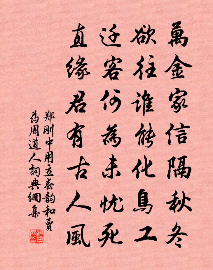 詩詞名句歷史字典書法欣賞書法字典國語詞典說文解字康熙字典古漢語字典標 題 作 者 詩 句 用立春韻和賣藥周道人作者:鄭剛中 朝代:宋代用立春韻和賣藥周道人原文萬金家信隔秋冬,欲往誰能化鳥工。遷客何為未憂死,直緣君有古人風。詩詞問答問:用立春韻和賣藥周道人的作者是誰?答:鄭剛中問:用立春韻和賣藥周道人寫於哪個朝代?答:宋代鄭剛中用立春韻和賣藥周道人書法欣賞用立春韻和賣藥周道人書法作品詩詞推薦賈節庵冒夏暑越修塗過我苕霅情誼甚厚令聞古牟巘五〔宋代〕事故不可料,柯爛棋局更。兩家骨肉內,往往隔死生。龍興寺楊備〔宋代〕高剎長幡敞淨居,方袍圓笠照通渠。龍興舊額加新榜,不見金輪皇帝書。春日雜書十首 其九朱淑真〔宋代〕濛濛細雨濕香塵,似欲藏鴉柳色新。鬥草工夫渾忘卻,只憑詩酒破除春。次韻和表臣惠符離去歲重醞酒時與杜挺之李宣梅堯臣〔宋代〕贈以榴花酒,沉清貴隔年。不憂航滯磧,為泛盞如船。加品盈盤內,無花到眼前。還招李杜醉,野釀莫稱賢。送曾孫灼出贅盧氏陳著〔宋代〕男生必有室,有室在嗣親。家貧或出贅,出贅難為人。汝今為此行,及此初花春。粼粼潮迎舟,葉葉風吹巾。鳳雲送關都官致仕陳襄〔宋代〕野月白駒,來食我麰。君子之往,胡為不留。我心悠悠,為天子憂。壽崔西清二首洪咨夔〔宋代〕武侯王佐材,有膽大如屋。愛之莫助之,只手挈全蜀。淋漓出師表,所舉良且淑。孔鸞非不佳,健翮欠鴻鵠。先生句時定欽〔宋代〕白雲黃鶴自來去,綠水青山無古今。大滌洞天留題二首秘仲威〔宋代〕我行不識洞霄門,但怪東來見紫氛。玉帝袞衣明日月,仙官劍履會風雲。箬根也有靈丹助,芝草疇非協氣薰。亦恐次韻高秘書謁陸待制二首蘇泂〔宋代〕人物推前輩,聲名重泰山。斯文無毀譽,吾道有間關。袖短方妍舞,弓強愧力彎。風舟雖屢引,中路忍追還。哀仲妹劉克莊〔宋代〕壺范班班在里閭,始知列女傳非虛。室無遺桂空花妄,溪有新塋宰樹疏。弟憶雪中聯汝句,兄行雷岸寄家書。自憐陶使君輓歌二首徐鉉〔唐代〕太守今何在,行春去歸。筵空收管吹,郊迥儼驂騑。營外星才落,園中露已晞。傷心樑上燕,猶解向人飛。瑞鷓鴣華岳〔宋代〕華月樓前見玉容。鳳釵斜褪鬢雲松。梅花體態香凝雪,楊柳腰肢瘦怯風。幾向白雲尋楚□,難憑紅葉到吳宮。別來偈頌一百六十首釋宗杲〔宋代〕一年三百六十日,今朝又是從頭起。人人有個主人公。水牛銜卻老鼠尾。深沙歡,那吒喜。佛殿走出門去,僧堂撞劉共甫樞密輓詞三首周必大〔宋代〕芸省翻黃卷,詞垣賦紫薇。年華飛電過,耆德曉星稀。梅閣臨風迥,滕城指日歸。懷賢並感舊,衰涕一時揮。??山曉雲歌袁正〔宋代〕大坤濕氣蒸嵷巃,油然勃然連蒼穹。曙窗注望東{外了內凵}峰,須臾不見青芙蓉。初疑博山噴出紫煙縷,又疑蜃次韻曾季永乞筍趙蕃〔宋代〕鄙夫食肉書生菜,要是均為口腹賣。籜龍雖美亦菜流,我苦嗜之還自怪。君家作屋溪上篁,想見春風參短長。奈何草堂成即事二首喻良能〔宋代〕燕雀桑麻五畝勻,香爐峰下磬湖濱。青衫不礙兩居士,白髮真成六老人。子美浣花元不惡,淵明栗里總宜貧。作詩壽牛都大李劉〔宋代〕律中黃鐘九日前,長淮巨海降真賢。鵬程九萬快搏系,騋牝三千表塞淵。夜看牛星貫南極,早攜鶴馭出西川。梅花墨子引周詩佚名〔先秦〕王道蕩蕩。不偏不黨。王道平平。不黨不偏。名句推薦秋色漸將晚,霜信報黃花。葉夢得《水調歌頭·秋色漸將晚》 長江萬里東注,曉吹卷驚濤。吳潛《水調歌頭·焦山》 師之所處,荊棘生焉。大軍之後,必有凶年。老子《老子·道經·第三十章》 弗知而言為不智,知而不言為不忠。劉向《戰國策·秦一·張儀說秦王》 小舟從此逝,江海寄餘生。蘇軾《臨江仙·夜飲東坡醒復醉》 萬里無人收白骨,家家城下招魂葬。張籍《征婦怨》 寂寞尊前席上,唯愁海角天涯。李清照《轉調滿庭芳·芳草池塘》 鳥飛反故鄉兮,狐死必首丘。屈原《九章》 高樓送客不能醉,寂寂寒江明月心。王昌齡《芙蓉樓送辛漸二首》 鳳凰台上鳳凰游,鳳去台空江自流。李白《登金陵鳳凰台》