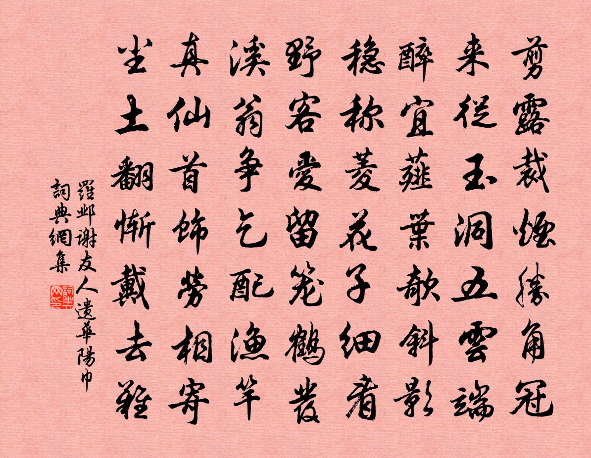詩詞名句歷史字典書法欣賞書法字典國語詞典說文解字康熙字典古漢語字典標 題 作 者 詩 句 謝友人遺華陽巾作者:羅鄴 朝代:唐代謝友人遺華陽巾原文剪露裁煙勝角冠,來從玉洞五雲端。醉宜薤葉欹斜影,穩稱菱花子細看。野客愛留籠鶴髮,溪翁爭乞配漁竿。真仙首飾勞相寄,塵土翻慚戴去難。詩詞問答問:謝友人遺華陽巾的作者是誰?答:羅鄴問:謝友人遺華陽巾寫於哪個朝代?答:唐代問:謝友人遺華陽巾是什麼體裁?答:七律羅鄴謝友人遺華陽巾書法欣賞謝友人遺華陽巾書法作品注釋全唐詩:卷654-34詩詞推薦鵲橋仙(題陳敬之扇)劉辰翁〔宋代〕乘鸞著色,疾蠅誤拂。不及羲之醉墨。偶然入手送東陽,便看取、薰時清適。清風去暑,閒題當日。宰相紗籠誰識西廟古檜和卞南仲韻仇遠〔宋代〕奇木有古意,愛古人亦奇。嘉禾老君觀,毗陵烈帝祠。二檜棟樑物,俱逐劫火移。朅來溧城西,見此鐵石姿。靈狸早寒白居易〔唐代〕黃葉聚牆角,青苔圍柱根。被經霜後薄,鏡遇雨來昏。半卷寒檐幕,斜開暖閣門。迎冬兼送老,只仰酒盈尊。入唐溪嚴維〔唐代〕嘯終萬籟起,吹去當溪雲。環嶼或明昧,遠峰尚氛氳。雨新翠葉發,夜早玄象分。金澗流不盡,入山深更聞。閒中書事陸游〔宋代〕病過新年逐日添,清愁殘醉兩厭厭。惜花萎去常遮日,待燕歸來始下簾。堂上清風生玉麈,澗中寒溜注銅蟾。一生和山房夾谷僉事韻二首何夢桂〔宋代〕蒼生下土望天仙,乞得君恩易地然。繡斧聿來霄漢上,丹書先到浙江邊。學徒免隸夫征法,官品寧輸戶役錢。愧死蝶戀花晏幾道〔宋代〕碧玉高樓臨水住,紅杏開時,花底曾相遇。—曲陽春春已暮,曉鶯聲斷朝雲去。遠水來從樓下路,過盡流波,未得漁村雜詩十首再和前韻薛嵎〔宋代〕巡檐修竹晚風敲,古寺僧歸月下橈。童子閉門無一事,只須清坐過中宵。王籍文學求讀書堂詩周必大〔宋代〕倚相端能記典墳,子羔未可治人民。十年莫作攸之恨,萬卷方知甫也神。堂下從渠糟粕議,城南容我簡編親。鐵更贈江山人劉黻〔宋代〕相山如相人,不論肥與瘠。神氣參有無,毫釐千里隔。今古非茫茫,山骨水為液。誰歟璞輅翁,眼為天地碧。持二十五輪頂彌陀蓮葉贊釋慧開〔宋代〕機輸纏轉,作者猶迷。頂{左寧右頁}一著,獨弄單提。自從蹈得這些子,便向風波險處施。郊外即事七首袁燮〔宋代〕幾處汪汪成巨浸,傳聞昔日盡良田。興除利害寧無策,忍把膏腴久棄捐。挽孟仲安二首吳芾〔宋代〕琴劍縱橫亦已陳,凜然英氣尚好存。向來忠義全鄉社,老去詩書付子孫。正好林泉窮勝事,那知風月負清樽。他年意難忘何夢桂〔宋代〕避暑林塘。數元戎小隊,一簇紅妝。旌雲影動,簾幕水沉香。金縷徹,玉肌涼。慢拍舞輕揚。更一般,輕弦細管灃上對月,寄孔諫議韋應物〔唐代〕思懷在雲闕,泊素守中林。出處雖殊跡,明月兩知心。相和歌辭。婕妤怨劉氏雲〔唐代〕君恩不可見,妾豈如秋扇。秋扇尚有時,妾身永微賤。莫言朝花不復落,嬌容幾奪昭陽殿。旅舍除夜皮日休〔唐代〕永夜誰能守,羈心不放眠。挑燈猶故歲,聽角已新年。出谷空嗟晚,銜杯尚愧先。晚來辭逆旅,雪涕野槐天。西江月謝逸〔宋代〕密雪未知膚白,夜寒已覺香清。振芳堂下月盈庭。踏碎橫斜疏影。且醉杯中綠蟻,休辭笛里清聲。東君催促子青青記夢王安國〔宋代〕萬頃波濤木葉飛,笙簫宮殿號靈芝。揮毫不似人間世,長樂鐘聲夢覺時。航海之賓陀防真歇師兄釋正覺〔宋代〕得得來尋真歇兄,孤舟揚檝順潮行。重聯斷雁雲中字,遠赴閒鷗沙上盟。新味清油燣紫菜,古方淳蜜漬黃菁。海山名句推薦柳色參差掩畫樓,曉鶯啼送滿宮愁。司馬扎《宮怨 / 閨怨》 雪雰雰而薄木兮,雲霏霏而隕集。劉向《九嘆》 故山知好在,孤客自悲涼。蘇軾《臨江仙·送王緘》 臨官莫如平,臨財莫如廉。劉向《說苑·政理》 從善如順流,去惡如探湯。房玄齡《晉書·列傳·第五十七章》 漢家旌幟滿陰山,不遣胡兒匹馬還。戴叔倫《塞上曲二首·其二》 風回雲斷雨初晴,返照湖邊暖復明。白居易《南湖早春》 秋江帶雨,寒沙縈水,人瞰畫閣愁獨。史達祖《八歸·秋江帶雨》 人刑者非人也,罰人者非罰也。來俊臣《羅織經·刑罰卷第十一》 志忍私,然後能公;行忍情性,然後能修荀子《荀子·儒效》