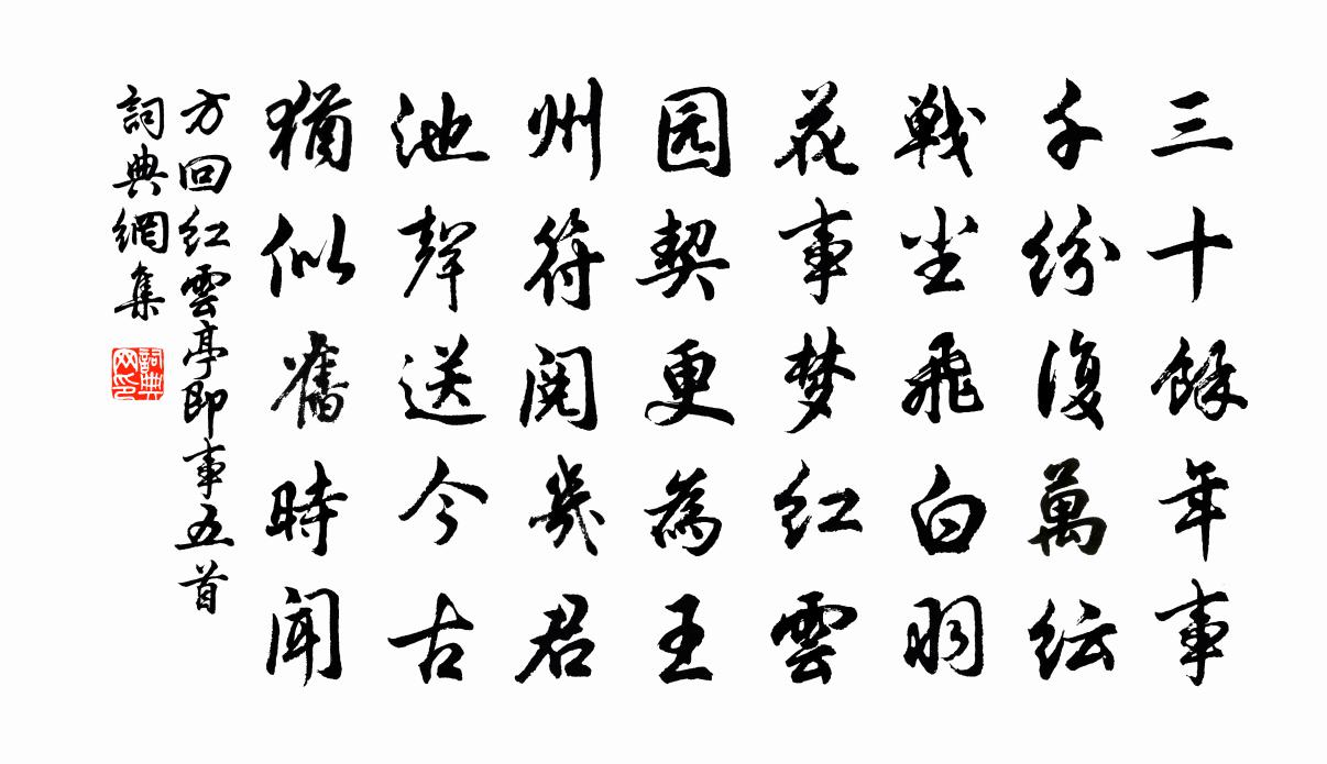 詩詞名句歷史字典書法欣賞書法字典國語詞典說文解字康熙字典古漢語字典標 題 作 者 詩 句 紅雲亭即事五首作者:方回 朝代:宋代紅雲亭即事五首原文三十餘年事,千紛復萬紜。戰塵飛白羽,花事夢紅雲。園契更為王,州符閱幾君。池聲送今古,猶似舊時聞。詩詞問答問:紅雲亭即事五首的作者是誰?答:方回問:紅雲亭即事五首寫於哪個朝代?答:宋代方回紅雲亭即事五首書法欣賞紅雲亭即事五首書法作品詩詞推薦寄人李群玉〔唐代〕寄語雙蓮子,須知用意深。莫嫌一點苦,便擬棄蓮心。次金東園農家雜詠八首楊公遠〔宋代〕趁雨足時翻畎畝,插秧遍後便耔耘。原天頻把甘霖霔,佇看豐年萬頃雲。惜花李建勛〔唐代〕白髮今如此,紅芳莫更催。預愁多日謝,翻怕十分開。點滴無時雨,荒涼滿地苔。閒階一杯酒,惟待故人來。浮萍寄水行釋文珦〔宋代〕浮萍寄諸水,漂流本無要。倚水以為命,然後生意蕃。女子方在室,怙恃父母恩。及其既結髮,託身向他門。室家酬令狐相公秋懷見寄劉禹錫〔唐代〕寂寞蟬聲靜,差池燕羽回。秋風憐越絕,朔氣想台駘。相去數千里,無因同一杯。殷勤望飛雁,新自塞垣來。過僧竹院周賀〔唐代〕一生愛竹自未有,每到此房歸不能。高人留宿話禪後,寂寞雨堂空夜燈。和李相之勸農吳芾〔宋代〕憂民無語對東君,一雨滂沱慰望雲。宣化但期施實惠,勸耕寧復事虛文。已看野老扶藜去,應有幽人植杖耘。千里初寒陸游〔宋代〕船尾寒風不滿旗,江邊叢祠常掩扉。行人畏虎少晨起,舟子捕魚多夜歸。茆葉翻翻帶宿雨,葦花漠漠弄斜暉。傷心次志宏韻督成壽置酒洪邁〔宋代〕歸耕食吾言,回首愧江水。方爭揚子度,誰置穆生醴。鄧侯傾蓋舊,小寢藝桃李。走書約啗我,涎迸齧脣齒。朝來自問二首邵雍〔宋代〕年來因甚可吟詩,桃李無言鶯有辭。啼到黃昏猶自啼,奈何人老又春歸。閬中行杜甫〔唐代〕豺狼當路,無地游從。 雨晴偶作示禪者釋正覺〔宋代〕快雨快晴寒食近,崢嶸芳事趁佳辰。弄風柳絮疑成雪,滿地榆錢買得春。雷吐英英茶爪露,暖班茁茁蕨拳伸。桃華和張寺丞功父八絕句楊萬里〔宋代〕門訊南湖作麽生,日撞金玉奏英莖。無人打殺淨飯子,放出渠頭七步行。為樂提刑壽二首衛涇〔宋代〕繡衣持斧按蠻荊,三見門弧喜氣盈。孟子能令棠粟發,不疑更使漢刑平。好將兩手摩銅狄,長對三秋正玉衡。聞道衡州石鼓書院范成大〔宋代〕古磴浮滄渚,新黌鎖碧蘿。要津山獨立,巨壑水同波。俎豆彌文肅,衣冠盛事多。地靈鍾傑俊,寧但拾儒科。題崇安驛黃公度〔宋代〕睡美生憎曉色催,丹心自愧未能灰。塵埃汨汨歲將暮,霜霧蒙蒙晝不開。身外百端俱長物,時危萬事入羈懷。君恩次韻子瞻和淵明飲酒二十首蘇轍〔宋代〕去年旅都城,三月不求宅。彼哉安知我,爭靜習禮跡。三已竟無怨,心伏鷙鳥百。無私心如丹,經患發先白。功名滿庭芳(茅舍)史浩〔宋代〕柴作疏籬,茅編小屋,繞堤苦竹黃蘆。老翁蝸處,卻自樂清虛。理釣何妨鉤直,據琴又、不管弦無。逍遙處,都捐題齊山翠微亭喻良能〔宋代〕山深雲氣多,撥雲尋逕入。但覺襟袖寒,不知濃翠濕。建士施霆亨自夔以相迓魏了翁〔宋代〕三峽雲連白帝城,風波九死得餘生。虎頭狼尾亂流濟,貓面馬肝緣壁行。中衍何妨需在險,心亨但見坎常平。況逢名句推薦一枕新愁,殘夜花香月滿樓。項鴻祚《減字木蘭花·春夜聞隔牆歌吹聲》 轉眼葵肌初繡,又紅欹欄角。陳維崧《好事近·分手柳花天》 亂石穿空,驚濤拍岸,捲起千堆雪。蘇軾《念奴嬌·赤壁懷古》 同心一人去,坐覺長安空。白居易《別元九後詠所懷》 青山飛起不壓物,野水流來欲濕人牛殳《琵琶行》 陶令不知何處去, 桃花源里可耕田 * 《七律·登廬山》 燕支落漢家,婦女無華色。李白《塞上曲》 洛陽親友如相問,一片冰心在玉壺。王昌齡《芙蓉樓送辛漸》 人情似紙張張薄,世事如棋局局新。佚名《增廣賢文·上集》 人無禮則不生,事無禮則不成,國家無禮則不寧。荀子《荀子·修身》