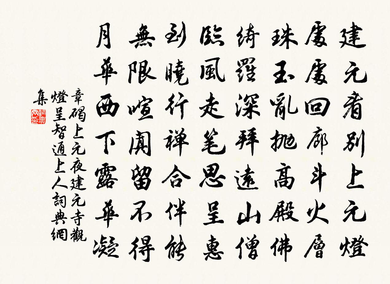 詩詞名句歷史字典書法欣賞書法字典國語詞典說文解字康熙字典古漢語字典標 題 作 者 詩 句 上元夜建元寺觀燈呈智通上人作者:章碣 朝代:唐代原文建元看別上元燈,處處迴廊斗火層。珠玉亂拋高殿佛,綺羅深拜遠山僧。臨風走筆思呈惠,到曉行禪合伴能。無限喧闐留不得,月華西下露華凝。詩詞問答問:《上元夜建元寺觀燈呈智通上人》的作者是誰?答:章碣問:該詩寫於哪個朝代?答:唐代書法欣賞上元夜建元寺觀燈呈智通上人書法作品注釋全唐詩:卷669-25詩詞推薦煙波亭吳珠〔宋代〕漢水連天闊,江雲護曉寒。青青山數點,最好倚欄看。登安仁雲錦驛後挹仙亭三首趙蕃〔宋代〕古木陰中屋數椽,下臨縈折幾山川。晚來快雨仍新浴,端覺飄飄意欲仙。儒巾顧逢〔宋代〕儒冠同昔日,吾道未嘗衰。畢竟猶存古,從教不入時。簪花何足遜,漉酒尚堪為。懶把青銅照,傷心兩鬢絲。杜君章家賦海棠二首韓維〔宋代〕濯錦江頭千萬枝,當年未解惜芳菲。今朝得向君家見,不怕春寒雨濕衣。次韻陳殿丞除夜感懷李覯〔宋代〕浮世因循過。流年次第新,回思舊來事,都似夢中人。不飲偏嫌雪,多愁卻怕春。星魁欲寅位,五鼓莫頻頻。鵲橋仙熊以寧〔宋代〕隱君仙裔,帥垣佳配。誰似碩人清貴。幾番鸞誥自天來,森綠綬、彩衣當砌。蓮開十丈,蓂留十莢,遲十日、瑤池郊廟歌辭。隱太子廟樂章。迎神佚名〔唐代〕蒼震有位,黃離蔽明。江充禍結,戾據災成。銜冤昔痛,贈典今榮。享靈有秩,奉樂以迎。閨怨韋莊〔唐代〕戚戚彼何人,明眸利於月。啼妝曉不乾,素麵凝香雪。良人去淄右,鏡破金簪折。空藏蘭蕙心,不忍琴中說。望雪王初〔唐代〕銀花珠樹曉來看,宿醉初醒一倍寒。已似王恭披鶴氅,憑欄仍是玉欄乾。題煙霞驛陶弼〔宋代〕歌聲野色中,人樂歲時豐。暑雨阻陽雜,秋田早晚同。嶺雲無烈日,江樹足涼風。自指香山語,前村有路通。寄昌化孫梅泉牟巘五〔宋代〕揮手秦稽信宿然,未行俄已兩週天。雲緘尺素惟開後,雪輥雙溪恐墮前。高誼誰能似孫宰,舊題應復記蘇仙。何時喜仲微學士直右史宋祁〔宋代〕殿棟洪紛冒紫霏,新聞再拜上丹墀。日高中禁仙香馥,輦度橫街赭傘移。寶校對呈天廄馬,輕兵看閱羽林兒。因君越州歌二十首汪元量〔宋代〕昨夢吳山閬苑開,風吹仙樂下瑤台。翠圍紅陣知多少,半揭珠簾看駕來。次韻李通甫賦中秋高斯得〔宋代〕秋容滿苕溪,天籟生菌閣。幽懷對蕭辰,意味更沖泊。招朋傾一盛,相與慰牢落。抵掌談世事,亦可資一噱。須臾沁園春(和林教授)方岳〔宋代〕子盍觀夫,商丘之木,有樗不才。縱斧斤脾睨,何妨雪立,風煙傲兀,怎問春回。老子似之,倦遊久矣,歸曬漁箬哨遍(括蘭亭記)吳潛〔宋代〕在晉永和,癸丑暮春,初作蘭亭會。集眾賢,臨峻岭崇山,有茂林修竹流水。暢幽情,縱無管弦絲竹,一觴一詠佳萬斛山李思衍〔宋代〕持囊簪笏紫霄間,聲價高於萬斛山。絕頂上行誰不愛,急中退中古來難。人言進步必為相,我道如幾好丐間。若也臨江仙(約同官出郊)侯置〔宋代〕一抹煙林屏樣展,輕花岸柳無邊。連朝春雨漲平川。冬冬迎社鼓,渺渺下陂船。同事多才饒我懶,乘閒縱飲郊園。子厚先生哀辭司馬光〔宋代〕先生負材氣,弱冠游窮邊。 * 揖鉅公,決策期萬全。謂言叛羌背,會可執而鞭。意趣小參差,萬金莫留連。中年金盞子王吉昌〔元代〕扣玄關。步雲山。花光石潤松風軟。琴解慍,酒開顏。衷情逸,放心閒。諸境滅,我獨頑。九陽還。六陰刪。收藏名句推薦嘆隙中駒,石中火,夢中身。蘇軾《行香子·述懷》 責人勿厲,小惠或有大得。來俊臣《羅織經·保身卷第七》 君言不得意,歸臥南山陲。王維《送別》 不患位之不尊,而患德之不崇范曄《後漢書·列傳·張衡列傳》 言不可盡信,必揆諸理;事未可遽行,必問諸心。王永彬《圍爐夜話·第二OO則》 亂石穿空,驚濤拍岸,捲起千堆雪。蘇軾《念奴嬌·赤壁懷古》 籌邊獨坐,豈欲登覽快雙眸。戴復古《水調歌頭·題李季允侍郎鄂州吞雲樓》 君子以遠小人,不惡而嚴。佚名《易傳·象傳下·遯》 處所多霜雪,胡風春夏起。蔡琰《悲憤詩》 永懷愁不寐,松月夜窗虛。孟浩然《歲暮歸南山 / 歸故園作 / 歸終南山》