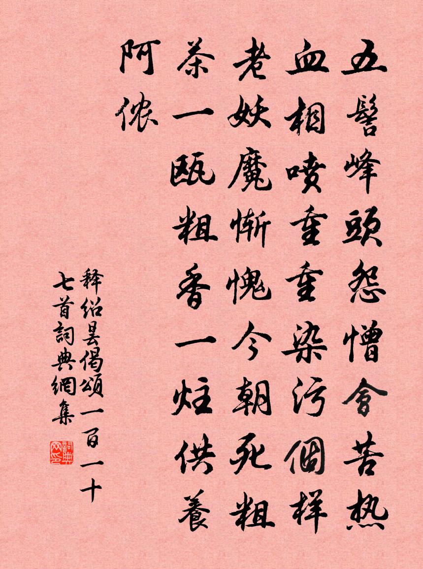 詩詞名句歷史字典書法欣賞書法字典國語詞典說文解字康熙字典古漢語字典標 題 作 者 詩 句 偈頌一百一十七首作者:釋紹曇 朝代:宋代偈頌一百一十七首原文五髻峰頭,怨憎會苦。熱血相噴,重重染污。個樣老妖魔,慚愧今朝死。粗茶一甌,粗香一炷,供養阿儂。詩詞問答問:偈頌一百一十七首的作者是誰?答:釋紹曇問:偈頌一百一十七首寫於哪個朝代?答:宋代釋紹曇偈頌一百一十七首書法欣賞偈頌一百一十七首書法作品詩詞推薦搗衣詩謝惠連〔南北朝〕衡紀無淹度。晷運倏如催。白露滋園菊。秋風落庭槐。肅肅莎雞羽。烈烈寒螿啼。夕陰結空幕。宵月皓中閨。美人秋曉陸游〔宋代〕菅席多年敗見經,布衾木枕伴殘更。嗈嗈天際雁初度,喔喔舍傍雞亂鳴。貸米未回愁灶冷,讀書有課待窗明。一秋正月二十四日送廉使出郊仇遠〔宋代〕閒騎羸馬出,遠餞繡衣行。愛此川原迥,欣然風日晴。隔籬梅半落,斷隴麥初生。每恨微官縛,茅山負夙盟。詠古趙蕃〔宋代〕淵明欲弦歌,為酒利公田。到縣十餘日,歸意已拳然。一稔且莫待,遙遙問歸船。是事可質信,考之歸來篇。北渡陸龜蒙〔唐代〕江客柴門枕浪花,鳴機寒櫓任嘔啞。輕舟過去真堪畫,驚起鸕鶿一陣斜。憶秦娥(木樨)仲並〔宋代〕隈岩側。怪生小院香來別。香來別。嫩黃細細,商量齊發。佳人斂笑貪先折。重新為翦斜斜葉。斜斜葉。釵頭常帶客里書事熊禾〔宋代〕西風涼信入虛檐,絺綌微單已戒嚴。鄉夢不隨秋夜永,客愁偏向雨聲添。清高鳴雁低雲海,漂泊流螢傍竹簾。搔首挽故知容州朝請陶公胡文舉〔宋代〕孤松挺挺凜高風,萬語形容不盡中。獨指平塘塘上水,水之清處儼如公。夏雨應祈呈桂帥二首曾幾〔宋代〕窗前有梧桐,報我以好雨。不眠聽疏滴,佳事想農圃。苗根不須問,蔬甲已如許。小簟六尺床,蕭然睡亭午。贈新羅僧陳允平〔宋代〕便帆才過日東來,淺色伽梨短樣裁。野鶴怨時心共遠,海鯨降處定初回。長年守律因師戒,中土傳經為國災。幾日朝中措(漁父十首)張掄〔宋代〕吳松江影漾清輝。山遠翠光微。楊柳風輕日永,桃花浪暖魚肥。東來西往。隨情任性,本自無機。何事沙邊鷗鷺,老而健貧而詩自志其喜八首方回〔宋代〕老翁處處有,不健復何為。貧戶家家是,能詩始足奇。東坡捐玉帶,白傅放楊枝。新有僧相識,時來說易詩。偶得吟邵雍〔宋代〕皋陶遇舜,伊尹逢湯。武丁得傅,文王獲姜。齊知管種,漢識張良。諸葛開蜀,玄齡啟唐。新羅寺唐有新羅僧咒草愈疾卵塔今在閒來因題李復〔宋代〕斷石傳遺事,唐年刻永徽。庭荒靈草盡,塔壞禮僧稀。古殿含涼氣,空堂照夕暉。獨來人不問,行聽暮鍾歸。金國賀正旦使副到闕紫宸殿宴致語口號周必大〔宋代〕淳熙紀號過千齡,玉曆今開第五春。北極天高乾象正,東郊風暖物華新。漏添化國融和日,律饗熙台鼓舞人。願挹郊廟朝會歌辭建隆乾德朝會樂章二十八首佚名〔宋代〕嘉彼合穎,致貢昇平。異標南畝,瑞應西成。德至於地,皇祗效靈。和同之象,煥發祥經。巫山高孟郊〔唐代〕見盡數萬里,不聞三聲猿。但飛蕭蕭雨,中有亭亭魂。千載楚王恨,遺文宋玉言。至今晴明天,雲結深閨門。感遇二十五首張耒〔宋代〕太冬積嚴殺,布令兆微霜。淒淒中園木,華采欻摧藏。豈無孤芳者,佳菊獨煌煌。後雕雖爾德,曷補蕙蘭傷。春墅崔道融〔唐代〕蛙聲近過社,農事忽已忙。鄰婦餉田歸,不見百花芳。又和子華韓維〔宋代〕沉陰消盡見春和,初放扁舟溯綠波。水際踏青憐日暖,林間舉白為花多。狂從田婦窺籬看,醉任家童喬鼓歌。年少名句推薦庭中有奇樹,綠葉發華滋。佚名《庭中有奇樹》 一身報國有萬死,雙鬢向人無再青。陸游《夜泊水村》 榮螈,蜥蜴。佚名《爾雅·釋魚》 一片閒愁,想丹青難貌柳永《尾犯·夜雨滴空階》 殘燈孤枕夢,輕浪五更風。徐昌圖《臨江仙·飲散離亭西去》 多情卻被無情惱。蘇軾《蝶戀花·春景》 夫妻反目,不能正室也。佚名《易傳·象傳上·小畜》 籬落疏疏一徑深,樹頭花落未成陰。楊萬里《宿新市徐公店》 絡緯秋啼金井闌,微霜淒淒簟色寒。李白《長相思·其一》 禍之所由生也,生自纖纖也。荀子《荀子·大略》