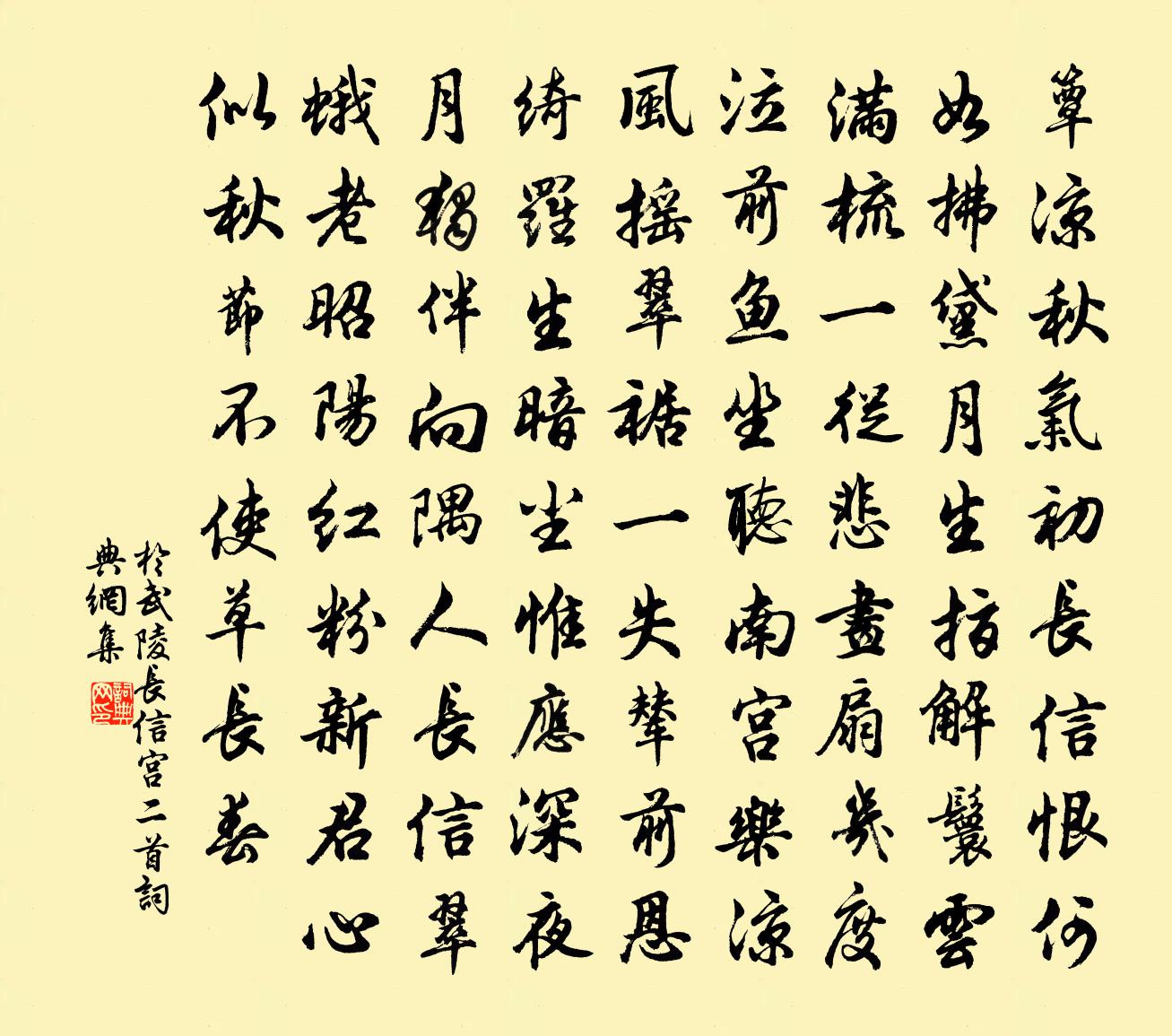 詩詞名句歷史字典書法欣賞書法字典國語詞典說文解字康熙字典古漢語字典標 題 作 者 詩 句 長信宮二首作者:於武陵 朝代:唐代長信宮二首原文簟涼秋氣初,長信恨何如。拂黛月生指,解鬟雲滿梳。一從悲畫扇,幾度泣前魚。坐聽南宮樂,涼風搖翠裾。一失輦前恩,綺羅生暗塵。惟應深夜月,獨伴向隅人。長信翠蛾老,昭陽紅粉新。君心似秋節,不使草長春。詩詞問答問:長信宮二首的作者是誰?答:於武陵問:長信宮二首寫於哪個朝代?答:唐代於武陵長信宮二首書法欣賞長信宮二首書法作品詩詞推薦頌古三十二首釋明辯〔宋代〕高安灘頭百雜碎,象骨峰前眼搭痴。敢道鼓山無鼻孔,藂林千古笑嘻嘻。酬秘閣黃少卿因見所作洞霄宮碑且有題記楊億〔宋代〕譙郡增嚴李母祠,神龜矯首負碑。豆萁已乏不休思,韭臼兼無絕妙辭。翠琰雄文慚內史,黃庭美翰枉羲之。蓬邱麗湘中寒夜徐照〔宋代〕本自家於越,何期滯楚邦。吟多頭易白,歸切思難降。但聽風收竹,誰知雪滿江。叉魚中夜急,燒火照樓窗。思北鄰韓二翁西鄰因庵主南鄰章老秀才陸游〔宋代〕鄉閭耆宿非復前,老章病死今三年。朝來出門為太息,不見此翁催社錢。我比翁雖差識字,向來推擇嘗為吏,事功送通判喻郎中文同〔宋代〕晴霞照西城,漠漠卷宿霧。高空繚危磴,此乃君雲路。吳蜀向萬里,上馬初一步。莫言道途遠,況已嗟久寓。今茲西塍廢圃周密〔宋代〕吟蛩鳴蜩引興長,玉簪花落野塘香。園翁莫把秋荷折,留與游魚蓋夕陽。寄隨州周員外韓愈〔唐代〕陸孟丘楊久作塵,同時存者更誰人。金丹別後知傳得,乞取刀圭救病身。從劉待制游中梁山寺張嵲〔宋代〕樓閣高低跨碧空,鱗鱗群樹亞山風。滄江東去流天外,秦岫西來繞漢中。野曠自然傷遠目,天高聊復送飛鴻。登臨詠史詩江夏胡曾〔唐代〕黃祖才非長者儔,禰衡珠碎此江頭。今來鸚鵡洲邊過,惟有無情碧水流。浣溪沙 春日即事劉辰翁〔宋代〕遠遠遊蜂不記家。數行新柳自啼鴉。尋思舊事即天涯。睡起有情和畫卷,燕歸無語傍人斜。晚風吹落小瓶花。題趙信國墨梅後書宋廣平賦仇遠〔宋代〕素衣喜不污緇塵,貞女江頭見似人。桃李門牆零落盡,江南猶有一枝春。夜臥舟中聞有唱山歌者倚其聲作二首王道父〔宋代〕生來不識大門邊,一片丹心石樣堅。聞道阿郎難得婦,無媒爭得到郎前。竹友為徐南卿作姜夔〔宋代〕世路蒼黃總是愁,暮年須得小優遊。如今漸覺知心少,勝種青青伴白頭。次韻孔常父送張天覺河東提刑蘇軾〔宋代〕送君應典鷫鸘裘,憑仗千鍾洗別愁。脫帽風流余長史,(君喜草書而不工,故以此為戲。)埋輪家世本留侯。(張夜酌丹山陳著〔宋代〕石路深深著梵宮,綠陰截斷出塵紅。春風杖屨閒忙外,明月山林醒醉中。有酒何須白蓮社,無詩可入碧紗籠。歸途至喜鋪陳造〔宋代〕外朝走馬息,險絕欲無路。駔駿蹙萬蹄,勢若敵場赴。崩騰臨空曠,踠足此小駐。蕭然一驛傍,為此數家聚。川城上雲樂李白〔唐代〕金天之西,白日所沒。康老胡雛,生彼月窟。巉岩容儀,戍削風骨。碧玉炅炅雙目瞳,黃金拳拳兩鬢紅。華蓋垂下書樊子南遊西山二記後范成大〔宋代〕仙山草木鎖卿雲,不到花平不離塵。十丈牡丹如錦蓋,人間姚魏卻爭春。瑣窗寒(旅窗孤寂,雨意垂垂,買舟西渡未能也。賦此為錢塘故人韓竹閒問)張炎〔宋代〕亂雨敲春,深煙帶晚,水窗慵憑。空簾謾卷,數日更無花影。怕依然、舊時燕歸,定應未識江南冷。最憐他、樹底隔浦蓮 水檻對雨錢應庚〔元代〕緋榴開滿露井。竹映琅*瑩。幔卷方池雨,微微落飛檐影。荷蓋擎萬柄。明妝靚。浪破魚吹鏡。翠禽並。梅風乍起名句推薦情由憶生,不憶故無情。房玄齡《晉書·列傳·第六十四章》 婦姑相喚浴蠶去,閒看中庭梔子花。王建《雨過山村》 月過十五光明少,人到中年萬事休。佚名《增廣賢文·上集》 好面譽人者,亦好背而毀之。莊子《莊子·雜篇·盜跖》 威加海內兮歸故鄉,安得猛士兮守四方劉邦《大風歌》 遠岫出山催薄暮,細風吹雨弄輕陰。李清照《浣溪沙·小院閒窗春色深》 開軒面場圃,把酒話桑麻。孟浩然《過故人莊》 民力盡於無用,財寶虛於待客。墨子《墨子·05章 七患》 崑山玉碎鳳凰叫,芙蓉泣露香蘭笑。李賀《李憑箜篌引》 水何澹澹,山島竦峙曹操《觀滄海》