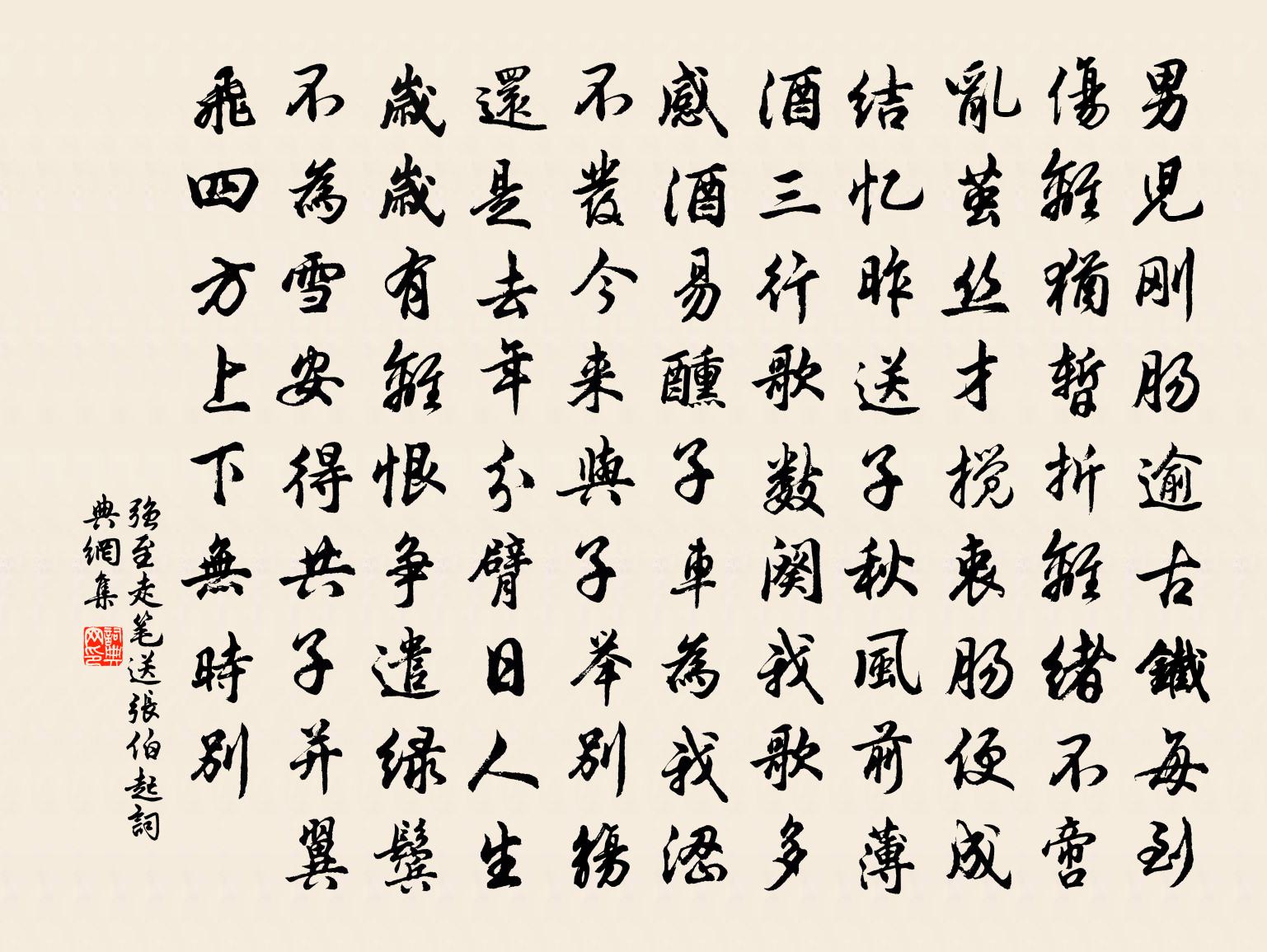 詩詞名句歷史字典書法欣賞書法字典國語詞典說文解字康熙字典古漢語字典標 題 作 者 詩 句 走筆送張伯起作者:強至 朝代:宋代走筆送張伯起原文男兒剛腸逾古鐵,每到傷離猶暫折。離緒不啻亂繭絲,才攪衷腸便成結。憶昨送子秋風前,薄酒三行歌數闋。我歌多感酒易醺,子車為我澀不發。今來與子舉別觴,還是去年分臂日。人生歲歲有離恨,爭遣綠鬢不為雪。安得共子並翼飛,四方上下無時別。詩詞問答問:走筆送張伯起的作者是誰?答:強至問:走筆送張伯起寫於哪個朝代?答:宋代強至走筆送張伯起書法欣賞走筆送張伯起書法作品詩詞推薦丙申元日徐端〔宋代〕丙申正月初一日,巢君野人拈禿筆。塗窗作鴉憶少年,不知老醜光陰疾。退藏未了桑簪南,生涯代以崖蜂蜜。小兒歲晏無聊收叔氏訊吳潛〔宋代〕豢成凋郡力難任,雪上加霜兩鬢侵。四五更頭猿鶴夢,數千里外鶺鴒心。老來倍覺光陰促,休去方知意味深。陶白秀文樓聶致孫〔宋代〕講餘衣袂受風輕,來與闌乾共晚晴。山倚南雲屏迤邐,江迎西月錦鮮明。道心千古飛鳶接,秋意一樓賓雁橫。老柏採蓮(實催)史浩〔宋代〕露華霞液,雲槳椒醑,恣玉斝金罍。交酬成雅會。拚沈醉。中山千日,未為長久,今此陶陶一飲,動經萬祀。陳果齊天樂(閨思)洪瑹〔宋代〕轆轤聲破銀床凍,霜寒又侵鴛被。皓月疏鍾,悲風斷漏,驚起畫樓人睡。銀屏十二。嘆塵滿絲簧,暗消金翠。可恨覽古四十二首 其三十二楊維楨〔元代〕嘗疑王孝子,素履朴且莊。門生服縣役,逕行想不揚。孝子躬饁具,罄折在道旁。門生役已脫,詭道由此行。遣意趙汝鐩〔宋代〕要靜靜不得,風吹竹打檐。欄摧呼匠葺,碑脫遣兒黏。夜短睡常欠,天陰病轉添。扶衰歸密室,更下面前簾。金影軒文同〔宋代〕開軒俯清溪,正在修篁內。霜筠抱冰節,爽氣常四會。主人厭俗客,日與此君對。月上寒影來,滿襟搖瑣碎。冬夜陸游〔宋代〕新醅引睡睡味濃,有如猩唇薦駝峰。屏深氈暖衾裯重,鼻端雷起驁兒童。床頭蘭缸綴玉蟲,雙瓶湯熟爐正紅。夢回題鶴林寺綦毋潛〔唐代〕道林隱形勝,向背臨層霄。松覆山殿冷,花藏谿路遙。珊珊寶幡掛,焰焰明燈燒。遲日半空谷,春風連上潮。少憑同誼夫國才餞季然於普門院取壁間五字詩各探王灼〔宋代〕投分前日歡,愴別古人重。相望一千里,獨許明月共。酬王微之汴中見贈曾鞏〔宋代〕黃流渾渾來沙際,佳氣蔥蔥近日邊。河漢槎雖通遠客,蓬萊風未縱歸船。山城劇飲銷紅燭,水驛高吟襞彩箋。老去惜芳時王哲〔元代〕諸公學,休胡別。且莫放、猿顛馬劣。閒中認得玄機設。無言說、自然歡悅。淨清便把虛空拽。待問你不生不滅。用韻煩蔣延陵寄前詩至章泉劉宰〔宋代〕之子交遊柳與劉,朅來聲聞水東流。縣知此去居三館,可但當年記九丘。滄海狎鷗猶好在,紅塵沒馬肯回不。短篇鏡龍輔〔宋代〕徐淑古銅鏡,背多青綠花。收藏敢輕慢,曾得照秦嘉。提刑勸農使者還嘉州宋祁〔宋代〕案部聊北征,肅舲復東下。江溜澹泱泱,檣烏紛雅雅。離醑不餘杯,征棹亟沿洄。還岫隨時見,幽花無候開。清氛答吳知府仲登見招三絕釋寶曇〔宋代〕未暇雲山聖處行,茲游已復慰平生。故林猿狖吾知識,木落霜枯也不爭。竹窗兄因貓捕雞日囚夜縱有詩自憐因次韻陳著〔宋代〕坎止流行不在人,人生只合任天真。無聊句踐能興越,垂死范雎終相秦。病足不妨登上袞,顰眉休復效工鄰。竹窗和唐山叟所贈三詩王灼〔宋代〕蓑衣芒屨日相逢,仙者誰人識呂鍾。已受丹書存夜氣,定除白髮變春容。情田舊習雖鋤穢,筆陣餘威尚折衝。聞說偈頌八十七首釋慧開〔宋代〕名高不用鐫頑石,路上行人口是碑。大宋正傳天子令,直教諸國豎降旗。名句推薦如欲平治天下,當今之世,捨我其誰也。孟子《孟子·公孫丑章句下·第十三節》 黎明即起,灑掃庭除,要內外整潔;既昏便息,關鎖門戶,必親自檢點。朱柏廬《朱子家訓·全文》 飛花兩岸照船紅,百里榆堤半日風。陳與義《襄邑道中》 牆裡鞦韆牆外道。牆外行人,牆裡佳人笑。蘇軾《蝶戀花·春景》 西陸蟬聲唱,南冠客思深。駱賓王《詠蟬 / 在獄詠蟬》 兩鬢可憐青,只為相思老。晏幾道《生查子·關山魂夢長》 天南地北雙飛客,老翅幾回寒暑。元好問《摸魚兒·雁丘詞 / 邁陂塘》 來說是非者,便是是非人。佚名《增廣賢文·上集》 若言言悅耳,事事快心,便把此生埋在鴆毒中矣。洪應明《菜根譚·概論》 永夜角聲悲自語,客心愁破正思家。汪元量《望江南·幽州九日》