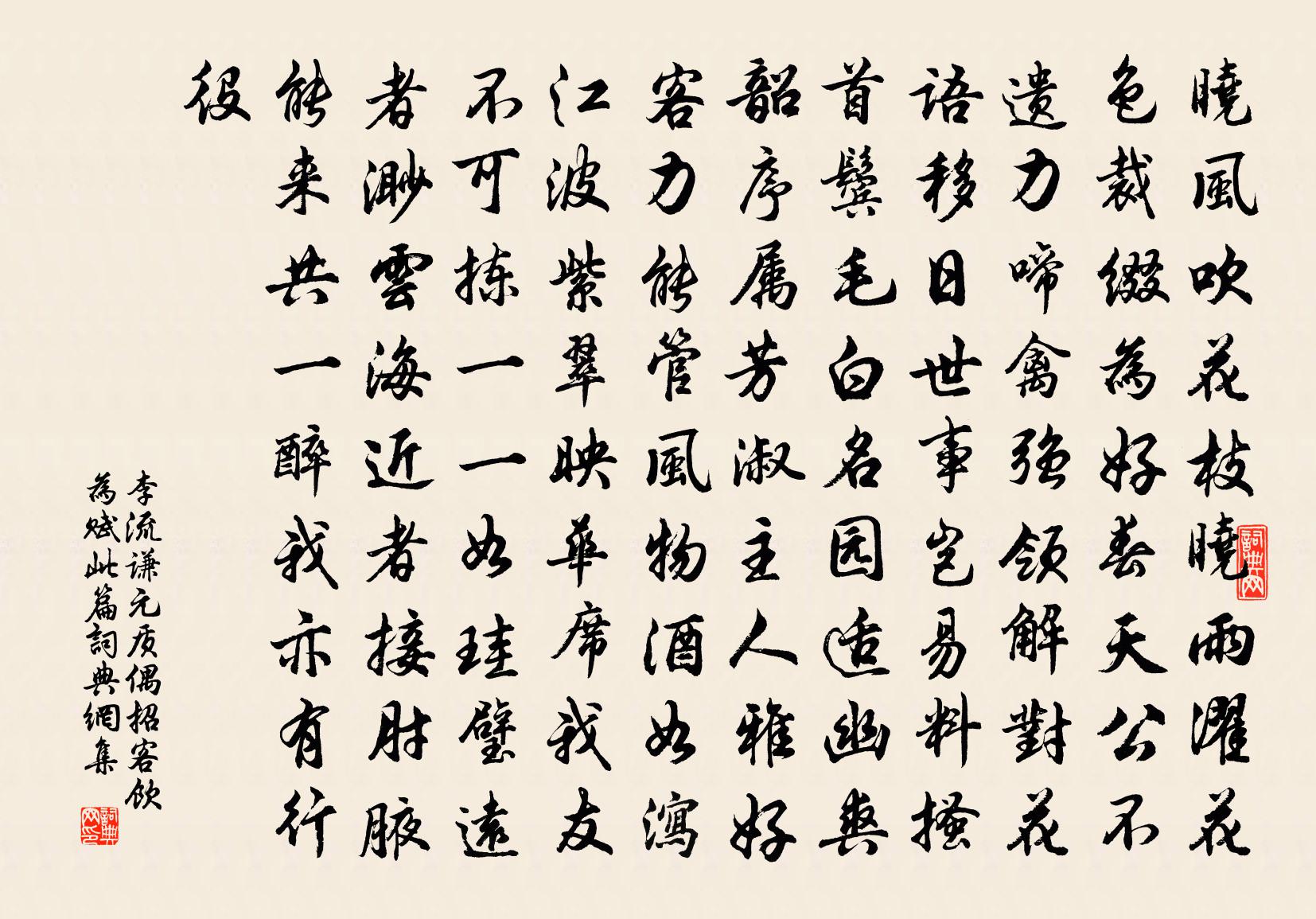 詩詞名句歷史字典書法欣賞書法字典國語詞典說文解字康熙字典古漢語字典標 題 作 者 詩 句 元質偶招客飲為賦此篇作者:李流謙 朝代:宋代元質偶招客飲為賦此篇原文曉風吹花枝,曉雨濯花色。裁綴為好春,天公不遺力。啼禽強領解,對花語移日。世事豈易料,搔首鬢毛白。名園適幽爽,韶序屬芳淑。主人雅好客,力能管風物。酒如瀉江波,紫翠映華席。我友不可揀,一一如珪璧。遠者渺雲海,近者接肘腋。能來共一醉,我亦有行役。詩詞問答問:元質偶招客飲為賦此篇的作者是誰?答:李流謙問:元質偶招客飲為賦此篇寫於哪個朝代?答:宋代李流謙元質偶招客飲為賦此篇書法欣賞元質偶招客飲為賦此篇書法作品詩詞推薦過衢州第二程見麥雪中青陳淳〔宋代〕雪過三衢越厚埋,卻於農事不為災。今朝方爾半融釋,隴麥青青奮出來。清平樂(柬邢宰)黃機〔宋代〕曉窗晴日。一點黃金橘。萬事如毛隨日出。多少人間頭白。未春長恨春遲。春來生怕春歸。辦取揭天簫鼓,莫教孤陝下厲玄侍御宅五題吟詩島姚合〔唐代〕幽島蘚層層,詩人日日登。坐危石是榻,吟冷唾成冰。靜對唯秋水,同來但老僧。竹枝題字處,小篆復誰能。曹魏二首陳造〔宋代〕問卓諸公半虎狼,魏旗四指不留藏。老瞞淯水如先死,不必炎劉果後亡。依韻和晁十七落花二首張耒〔宋代〕投老殷勤向物華,風前猶欲拾余花。更將夢逐殘紅去,遍入長安百萬家。牡丹詩十首宋白〔宋代〕風排香陣拂瑤墀,御苑新晴爛漫時。十五素娥羞水色,三千紅面洗胭脂。宮腰暎酒思輕舞,檀口偎牋欲詠詩。鐵石江神子(賦碧沼小庵)吳文英〔宋代〕長安門外小林丘。碧壺秋。浴輕鷗。不放啼紅,流水通宮溝。時有晴空雲過影,華鏡里,翳魚游。綺羅塵滿九衢頭秋夜病起懷端叔作詩寄之秦觀〔宋代〕寢瘵當老秋,入夜庭軒空。天光脆如洗,月色清無縫。風飆戾戾輕,露氣霏霏重。檐花伴徐步,籠燭窺孤諷。緬惟長相思·其二李白〔唐代〕日 * 盡花含煙,月明欲素愁不眠。趙瑟初停鳳凰柱,蜀琴欲奏鴛鴦弦。此曲有意無人傳,願隨春風寄燕然。憶君和張舍人中書宿直李嘉祐〔唐代〕漢主留才子,春城直紫微。對花閶闔靜,過竹吏人稀。裁詔催添燭,將朝欲更衣。玉堂宜歲久,且莫厭彤闈。和秉國芙蓉五章司馬光〔宋代〕清曉霜華漫自濃,獨憑愛日養殘紅。勸君秉燭須勤賞,閶闔難禁一夜風。灩澦堆杜甫〔唐代〕巨積水中央,江寒出水長。沈牛答雲雨,如馬戒舟航。天意存傾覆,神功接混茫。干戈連解纜,行止憶垂堂。憶齊安郡杜牧〔唐代〕平生睡足處,雲夢澤南州。一夜風欺竹,連江雨送秋。格卑常汩汩,力學強悠悠。終掉塵中手,瀟湘釣漫流。次韻王雄州送侍其涇州蘇軾〔宋代〕威聲又數中興年,二虜行當一矢聯。聞道名城得真將,故應驚羽落空弦。追鋒歸去雄三衛,授鉞重來定十連。別酒清夏堂張鎡〔宋代〕去歲臨池未蓋堂,暑天來看已多涼。穿花鷺立青為繖,放櫂人眠錦作床。今夏好風簾影動,良宵閒坐月華香。低頭蝶戀花(題二喬觀書圖)秦觀〔宋代〕並倚香肩顏斗玉。鬢角參差,分映芭蕉綠。厭見兵戈爭鼎足。尋芳共把遺編躅。閨閣風流誰可續。沈想清標,合貯公莫舞歌李賀〔唐代〕公莫舞歌者,詠項伯翼蔽劉沛公也。會中壯士,灼灼於人,故無復書;且南北樂府率有歌引。賀陋諸家,今重作公次主簿昌英叔鑷白韻楊萬里〔宋代〕滴盡思親淚,猶殘影吊形。眼花渾作黑,頷底更能青。少也投三賦,今焉忽一星。此生成底事,用腳不曾停。聞蛙有感宋庠〔宋代〕燕池昔有金丸戲,蟈氏今無牡菊煙。暗水群鳴聊借問,為官何似為私年。和元少尹新授官白居易〔唐代〕官穩身應泰,春風信馬行。縱忙無苦事,雖病有心情。厚祿兒孫飽,前驅道路榮。花時八入直,無暇賀元兄。名句推薦美人卷珠簾,深坐顰蛾眉。李白《怨情》 水榭風微玉枕涼。牙床角簟藕花香。蘇庠《浣溪沙·書虞元翁書》 九月九日眺山川,歸心歸望積風煙。盧照鄰《九月九日玄武山旅眺》 非學無以廣才,非志無以成學。諸葛亮《誡子書》 台榭空濛煙柳暗,白鳥銜魚欲舞。納蘭性德《摸魚兒·午日雨眺》 人道山長山又斷。蕭蕭微雨聞孤館。李清照《蝶戀花·淚濕羅衣脂粉滿》 渭北春天樹,江東日暮雲。杜甫《春日憶李白》 食之以時,用之以禮。孟子《孟子·盡心章句上·第二十三節》 起舞徘徊風露下,今夕不知何夕。蘇軾《念奴嬌·中秋》 雨後輕寒猶未放。春愁酒病成惆悵。歐陽修《蝶戀花·面旋落花風蕩漾》