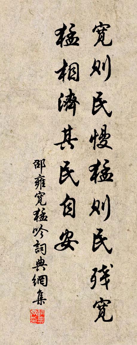 詩詞名句歷史字典書法欣賞書法字典國語詞典說文解字康熙字典古漢語字典標 題 作 者 詩 句 寬猛吟作者:邵雍 朝代:宋代寬猛吟原文寬則1*1民慢,猛則1*1民殘。寬猛相濟,其民自安。詩詞問答問:寬猛吟的作者是誰?答:邵雍問:寬猛吟寫於哪個朝代?答:宋代邵雍寬猛吟書法欣賞寬猛吟書法作品詩詞推薦次韻鄭守舜舉喜雪四首韓元吉〔宋代〕使君仙骨迥無儔,合上瓊樓倒玉舟。雪裡漁蓑詩更好,盛傳僧舍與歌樓。清平樂(檢校山園書所見)辛棄疾〔宋代〕斷崖修竹。竹里藏冰玉。路繞清溪三百曲。香滿黃昏雪屋。行人系馬疏籬。折殘猶有高枝。留得東風數點,只緣嬌次韻尹潛感懷陳與義〔宋代〕胡兒又看繞淮春,嘆息猶為國有人。可使翠華周宇縣,誰持白羽靜風塵。五年天地無窮事,萬里江湖見在身。共說送李司直歸浙東幕兼寄鮑將軍(一作朱灣詩)朱長文〔唐代〕翩翩書記早曾聞,二十年來願見君。今日相逢悲白髮,同時幾許在青雲。人從北固山邊去,水到西陵渡口分。會作毗陵辭滿出舍添倅廳楊萬里〔宋代〕小住氶廳更一旬,客魂先入故鄉春。未離鼓角聲中夢,巳是譙門外面人。入黃溪聞猿(溪在永州)柳宗元〔唐代〕溪路千里曲,哀猿何處鳴。孤臣淚已盡,虛作斷腸聲。將別巫峽,贈南卿兄瀼西果園四十畝杜甫〔唐代〕苔竹素所好,萍蓬無定居。遠遊長兒子,幾地別林廬。雜蕊紅相對,他時錦不如。具舟將出峽,巡圃念攜鋤。正月金縷曲·姜西溟言別賦此贈之納蘭性德〔清代〕誰復留君住。嘆人生、幾翻離合,便成遲暮。最憶西窗同剪燭,卻話家山夜雨。不道只、暫時相聚。袞袞長江蕭蕭暮春陸游〔宋代〕憔悴都門白髮新,歸來一振客衣塵。啼鶯妒夢頻催曉,飛絮鍾情獨殿春。湖上風光猶淡沱,尊前懷抱頗清真。詩成雜劇·昊天塔孟良盜骨朱凱〔元代〕第一折(沖末扮楊景領卒子上,詩云)雄鎮三關幾度秋,番兵不敢犯白溝。父兄為國行忠孝,敕賜清風無佞樓。某觀禊帖有感范成大〔宋代〕古人賦多情,無事輒愁苦。蘭亭一觴詠,感慨乃如許。山居寂寥與世如隔是非不到榮辱兩忘因憶秋崖吳錫疇〔宋代〕我愛山居好,陶然與世忘。細聽泉漱玉,那羨佩鳴孬。乳燕飛閒宇,新篁出矮牆。靜觀機不息,天地為誰忙。偈頌一百零二首釋慧遠〔宋代〕老婆二八少年時,羞向人前舞枯枝。而今要嫁便改嫁,誰管傍人說是非。追和戊寅歲上元蘇軾〔宋代〕賓鴻社燕巧相違,白鶴峰頭白板扉。石建方欣洗牏廁,姜龐不解嘆蕭蝛。一龕京口嗟春夢,萬炬錢塘憶夜歸。合減字木蘭花姚述堯〔宋代〕天寒人靜。嘯倚胡床閒畫永。春信初回。報導南枝昨夜開。沈沈庭院。獨坐黃昏誰是伴。風過南牆。似覺天宮暗遞大道歌張繼先〔宋代〕道不遠,在身中,物則皆空性不空。性若不空和氣住,氣歸元海壽無窮。欲得身中神不出,莫向靈台留一物。物在緱山鶴張仲素〔唐代〕羽客驂仙鶴,將飛駐碧山。映松殘雪在,度嶺片雲還。清唳因風遠,高姿對水閒。笙歌憶天上,城郭嘆人間。幾變阮郎歸(茂叔兄□□生日)魏了翁〔宋代〕雲外群鴻逐稻粱。獨乘下澤少游鄉。赤心片片為人忙。俗事縈纏何日了,自身活計孰為長。閉門書卷聖賢香。將使有詩許移廚雙溪次其韻王炎〔宋代〕艤舟柳岸載清尊,招我花邊一賞春。莫笑看花人已老,白頭曾是少年人。游先主祠堂置酒范祖禹〔宋代〕驅車酒出郊坰,酒涉溪上青酒岑。峰頭野寺不足到,先主祠堂猶可尋。祠堂之前流水長,翠屏重疊搖清光。老松窈名句推薦治生乎君子,亂生乎小人。荀子《荀子·王制》 清明節,雨晴天,得意正當年。薛昭蘊《喜遷鶯·清明節》 願君多採擷,此物最相思。王維《相思》 蕭蕭落木不勝秋,莫回首、斜陽下。納蘭性德《一絡索·過盡遙山如畫》 東君也不愛惜,雪壓霜欺。晁沖之《漢宮春·梅》 盡做舊愁都忘卻,新愁何處著王庭筠《謁金門·雙喜鵲》 無限春風來海上。便與春工。染得桃紅似肉紅。蘇軾《減字木蘭花·立春》 半壁見海日,空中聞天雞。李白《夢遊天姥吟留別 / 別東魯諸公》 江暗雨欲來,浪白風初起。何遜《相送》 君疑臣則臣必死。羅貫中《三國演義·第一百一十九回》