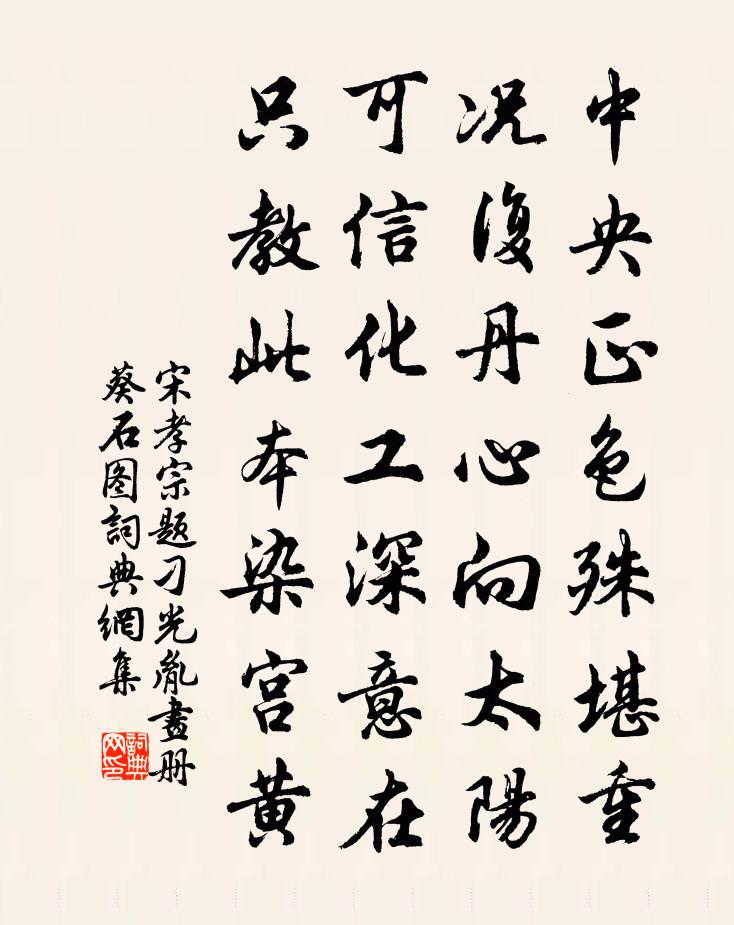 詩詞名句歷史字典書法欣賞書法字典國語詞典說文解字康熙字典古漢語字典標 題 作 者 詩 句 題刁光胤畫冊葵石圖作者:宋孝宗 朝代:宋代題刁光胤畫冊葵石圖原文中央正色殊堪重,況復丹心向太陽。可信化工深意在,只教此本染宮黃。詩詞問答問:題刁光胤畫冊葵石圖的作者是誰?答:宋孝宗問:題刁光胤畫冊葵石圖寫於哪個朝代?答:宋代宋孝宗題刁光胤畫冊葵石圖書法欣賞題刁光胤畫冊葵石圖書法作品詩詞推薦攤破浣溪沙李新〔宋代〕幾度珠簾卷上鉤。折花走馬向揚州。老去不堪尋往事,上心頭。陶令無聊惟喜醉,茂陵多病不勝愁。脈脈春情長不賀新郎(次孫花翁乙酉)趙以夫〔宋代〕春事渾如客。趁新晴、花驄驕俊,紵衫輕窄。臘瓮初傾光欲動,笑把黃甘旋擘。更喜得、酒朋詩敵。陶寫襟懷觴詠和鞏興宗題回峰寺贈明山主王之道〔宋代〕江共煙雲遠,山連藪擇長。日從三伏烈,風借九秋涼。休作桃花觀,聊同柏子香。相逢無一事,不必下禪床。和林簿二詩杜范〔宋代〕宦途元自險於山,我輩孤寒分外難。蕭寺羨君成勝概,新詩為我解愁端。知嘆落落無三語,底事區區為一官。初夏呈恩主戶部郎中李新〔宋代〕玉翰飛出漢江東,蜀道三年興已窮。城郭宛然人未老,笑談終昌座生風。汴雲歸去觚稜近,珠佩收來漢月空。衰草侍趙開府夜宴陳允平〔宋代〕剩陪華佩醉蟠桃,楊柳飄飄拂午橋。夜月樓台行錦障,春風簾幕卷紅綃。歌傳杏苑黃金縷,樂奏梨園紫玉簫。銀漏襄陽蹋蹄歌 三蕭衍〔南北朝〕龍馬紫金鞍。翠眊白玉覊。照耀雙闕下。知是襄陽兒。用強甫蒙仲韻十首劉克莊〔宋代〕病著經旬臥小齋,一窗螢雪與誰偕。季宣易尚資到溉,茂叔書曾取壽涯。志苦白頭寧退惰,論孤黃吻競攻排。兔園減字木蘭花晏幾道〔宋代〕長楊輦路。綠滿當年攜手處。試逐春風。重到宮花花樹中。芳菲繞遍。今日不如前日健。酒罷淒涼。新恨猶添舊恨滿庭芳去非〔宋代〕龍角輝春,蛾春驚曉,夢闌金翠屏開。異芬薰室,風送蕊仙來。玉女擎香沐浴,人間世、洗徹凡埃。梅開後,留花象祠記王守仁〔明代〕靈、博之山,有象祠焉。其下諸苗夷之居者,鹹神而祠之。宣慰安君,因諸苗夷之請,新其祠屋,而請記於予。予題永福寺臨淮亭(亭即司馬復明府所置)顧非熊〔唐代〕淮上前朝寺,因公始建亭。雖無山可望,多有鶴堪聽。引客閒垂釣,看僧靜灌瓶。帶潮秋見月,隔竹曉聞經。水氣鷓鴣天·惜別嚴仁〔宋代〕一曲危弦斷客腸。津橋捩柂轉牙檣。江心雲帶蒲帆重,樓上風吹粉淚香。瑤草碧,柳芽黃。載將離恨過瀟湘。請君贈別竹西王彥升居士李彌遜〔宋代〕參軍四壁生秋草,鬢毛不似心先老。終隨煙霞學巢由,一室安能事除掃。竹西舊說青雲客,詩思長留意無極。塵埃詠史詩長沙胡曾〔唐代〕江上南風起白蘋,長沙城郭異鹹秦。故鄉猶自嫌卑濕,何況當時賦鵩人。自桃川至辰州絕句四十有二趙蕃〔宋代〕上得磯來勢已危,忽然纜斷不能支。驚心釣渚河邊石,值爾應當應手糜。留題洞岩劉述〔宋代〕英英洞口雲,觸石才一縷。須叟遍空山,霈然作靈雨。萬物一以澤,孤蹤無處所。我心良所珍,作詩以自矩。燈詞姜夔〔宋代〕燈已闌珊月色寒,舞兒往往夜深還。只因不盡婆娑意,更向街心弄影看。和樂天重題別東樓元稹〔唐代〕山容水態使君知,樓上從容萬狀移。日映文章霞細麗,風驅鱗甲浪參差。鼓催潮戶凌晨擊,笛賽婆官徹夜吹。喚客雜感陸游〔宋代〕孔欲居九夷,老亦適流沙。忠信之所覃,豈間夷與華。況我州閭間,相視等一家。老稚各自力,勉蹈思無邪。名句推薦君子處小人,必平其氣以待之,不可稍形激切也。王永彬《圍爐夜話·第三三則》 萬物並育而不相害。道並行而不相悖。子思《中庸·第三十章》 花氣襲人知驟暖,鵲聲穿樹喜新晴。陸游《村居書喜》 不虛美,不隱惡司馬光《資治通鑑·唐紀·唐紀十三》 半床落月蛩聲病,萬里寒雲雁陣遲。曹雪芹《殘菊》 夜雨做成秋,恰上心頭。納蘭性德《浪淘沙·夜雨做成秋》 柳柔搖不定,草短綠應難。張惠言《風流子·出關見桃花》 啼號升斗抵千金,凍雀飢鴉共一音。范成大《雪中聞牆外鬻魚菜者求售之聲甚苦有感》 江山易改,稟性難移。馮夢龍《醒世恆言·卷三十五》 善在身,介然必以自好也;不善在身,菑然必以自惡也。荀子《荀子·修身》