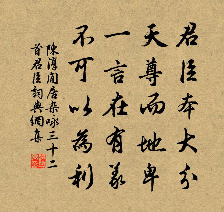 詩詞名句歷史字典書法欣賞書法字典國語詞典說文解字康熙字典古漢語字典標 題 作 者 詩 句 閒居雜詠三十二首君臣作者:陳淳 朝代:宋代閒居雜詠三十二首君臣原文君臣本大分,天尊而地卑。一言在有義,不可以為利。詩詞問答問:閒居雜詠三十二首君臣的作者是誰?答:陳淳問:閒居雜詠三十二首君臣寫於哪個朝代?答:宋代陳淳閒居雜詠三十二首君臣書法欣賞閒居雜詠三十二首君臣書法作品詩詞推薦一寸金(小石調)柳永〔宋代〕井絡天開,劍嶺雲橫控西夏。地勝異、錦里風流,蠶市繁華,簇簇歌台舞榭。雅俗多游賞,輕裘俊、靚妝艷冶。當兩木范成大〔宋代〕綠橘生西山,得自髯翁家。雲此接活根,是歲當著花。俛仰乃十霜,垂蠹紛相遮。芳意竟寂莫,枯枝謾槎牙。風土夜讀傳燈雜書六言八首劉克莊〔宋代〕曾為魔女攝入,亦被罔明喚回。錦覆陷阱可畏,鐵鑄門關勿開。二鵲救友佚名〔〕某氏園中,有古木,鵲巢其上,孵雛將出。一日,鵲徊翔其上,悲鳴不已。頃之,有群鵲鳴漸近,集古木上,忽有重到城七絕句。高相宅白居易〔唐代〕青苔故里懷恩地,白髮新生抱病身。涕淚雖多無哭處,永寧門館屬他人。鷓鴣天張思濟〔宋代〕衣潤紅綃梅欲黃。幾年歡意屬華堂。紅顏阿母逢占虺,班鬢兒童盡舉觴。麟作脯,玉為漿。從今三萬六千場。桑麻菩薩蠻趙師俠〔宋代〕嬌花媚柳新妝靚。裙邊微露雙鴛並。笑靨最多情。春從兩臉生。香羅縈皓腕。翠袖籠歌扇。餘韻遏雲低。梁塵簌簌秋閨鄭愔〔唐代〕征客向輪台,幽閨寂不開。音書秋雁斷,機杼夜蛩催。虛幌風吹葉,閒階露濕苔。自憐愁思影,常共月裴回。會昌丙寅豐歲歌(雜言)溫庭筠〔唐代〕丙寅歲,休牛馬,風如吹煙,日如渥赭。九重天子調天下,春綠將年到西野。西野翁,生兒童,門前好樹青艹丰茸奉和三日祓禊渭濱李乂〔唐代〕上林花鳥暮春時,上巳陪遊樂在茲。此日欣逢臨渭賞,昔年空道濟汾詞。得山中道友書寄苗錢二員外李端〔唐代〕有謀皆轗軻,非病亦遲回。壯志年年減,馳暉日日催。還山不及伴,到闕又無媒。高臥成長策,微官稱下才。詩人和之美舟行雜詩八首舟中夜坐司馬光〔宋代〕風柳動蕭疏,寒星浸寥落。中宵四寂然,時有游魚躍。江沙落席帆,岸柳縈單舸。小市遠微茫,簇水初燈火。南軒獨坐余芑舒〔宋代〕往來都是由天造,妙處何須更我為。但向物初看老子,恍然身外有嬰兒。中夜聞啼禽吳融〔唐代〕漠漠蒼蒼未五更,宿禽何處兩三聲。若非西澗回波觸,即是南塘急雨驚。金屋獨眠堪寄恨,商陵永訣更牽情。此時補樂歌十首。九淵元結〔唐代〕(《九淵》,少昊氏之樂歌也,其義蓋稱少昊之德,淵然深遠。凡一章,章四句)聖德至深兮,奫奫如淵;生類娭酹江月譚處端〔元代〕自然之道,稟根元、真正精神圓聚。一點靈光無內外,明徹輝通玄戶。寂淡偏宜,貧閒最好,物外逍遙處。長長不閱世戴復古〔宋代〕積鏹多金生怨尤,一溫飽外更何求。自甘韜遁陶元亮,不愛贏餘馬少游。何取累累兼若若,終成莫莫與休休。花前回先生過湖州東林沈氏,飲醉,以石榴皮書其蘇軾〔宋代〕世俗何知貧是病,神仙可學道之餘。但知白酒留佳客,不問黃公覓素書。【雙調】水仙子 日邊孫周卿〔元代〕曉開閭闔慶天申,九五龍飛第一春。星圍電繞天威近,肅朝班對紫宸,嵩呼舞蹈揚塵。和氣融三島,歡聲沸五雲,謝王立之送花陳師道〔宋代〕過雨生泥風作塵,馬蹄聲里度芳辰。城南居士風流在,時送名花與報春。名句推薦審其名實,慎其所謂。公孫龍《公孫龍子·名實論》 凡百事之成也,必在敬之;其敗也,必在慢之。荀子《荀子·議兵》 遙看孟津河,楊柳郁婆娑。佚名《折楊柳歌辭五首》 中庭月色正清明,無數楊花過無影。張先《木蘭花·乙卯吳興寒食》 落梅庭榭香,芳草池塘綠。晏幾道《生查子·落梅庭榭香》 獨立揚新令,千營共一呼。盧綸《和張僕射塞下曲·其一》 北風其涼,雨雪其雱。佚名《北風》 父兄教子弟,必正其身以率子,無庸徒事言詞也。王永彬《圍爐夜話·第三三則》 烽火照西京,心中自不平。楊炯《從軍行》 泛樓船兮濟汾河,橫中流兮揚素波。劉徹《秋風辭》