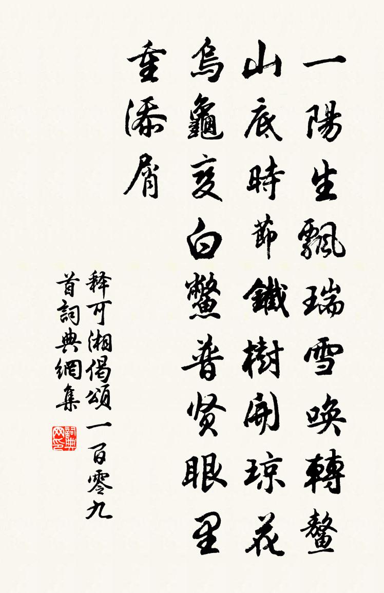 詩詞名句歷史字典書法欣賞書法字典國語詞典說文解字康熙字典古漢語字典標 題 作 者 詩 句 偈頌一百零九首作者:釋可湘 朝代:宋代偈頌一百零九首原文一陽生,飄瑞雪,喚轉鰲山底時節。鐵樹開瓊花,烏龜變白鱉,普賢眼裡重添屑。詩詞問答問:偈頌一百零九首的作者是誰?答:釋可湘問:偈頌一百零九首寫於哪個朝代?答:宋代釋可湘偈頌一百零九首書法欣賞偈頌一百零九首書法作品詩詞推薦詠梅五十首呈史尚書釋紹嵩〔宋代〕粲粲江南萬玉妃,隨宜領覽到斜暉。一枝縞色分明好,自是行人折贈稀。舟中作王令〔宋代〕杳杳波濤去莫窮,要須流合海天東。長帆百尺嗟無用,醉絕重湖笑逆風。虞美人·疏籬曲徑田家小周邦彥〔宋代〕疏籬曲徑田家小。雲樹開清曉。天寒山色有無中。野外一聲鍾起、送孤蓬。添衣策馬尋亭堠。愁抱惟宜酒。菰蒲睡游石城山呂聲之〔宋代〕祗因尋勝到林泉,四抱回峰萬景連。僧過不知山隱寺,客來方見洞開天。浮圖照水光相映,古木依崖影倒倒。風露和李用夫栽小松項斯〔唐代〕移來未換葉,已勝在空山。靜對心標直,遙吟境助閒。影侵殘雪際,聲透小窗間。即聳凌空乾,翛翛豈易攀。春晴懷故園海棠二首楊萬里〔宋代〕故園今日海棠開,夢入江西錦繡堆。萬物皆春人獨老,一年過社燕方回。似青似白天濃淡,欲墮還飛絮往來。無那送寺丞韓君守新安方岳〔宋代〕君家集有陸參序,老筆誇張歙大州。三百年來非昔比,二千石喜得今侯。早田已槁曾關念,舊石雖奇不到收。沃沃瑞鶴仙盧祖皋〔宋代〕眉青。炯如微月澹疏星。”故末章及之。江南秋欲遍。正蓴際鱸分,酒邊螯薦。青林雁霜淺。問風流何事,試華偏小重山(同前)李彌遜〔宋代〕星斗心胸錦繡腸。厭隨塵士客,逐炎涼。江山風月伴行藏。無人識,高臥水雲鄉。肘後有仙方。假饒丹未就,壽須二絕句張耒〔宋代〕茅檐斜日曉雞號,水滿陂塘薺麥高。回首故園空悵望,東門歸路綠迢迢。戰掉醜奴兒 贈萊州平等會首馬鈺〔元代〕世傳斑竹佳人淚。語話皆非。因擊三屍。血染斑斑事最奇。馬風知。專投正直無私杖,休笑輕微。最好閒攜。屏盡綠萼梅趙師睪〔宋代〕南枝飛影到橫窗,點點凌寒學弄妝。玉色不親紅粉鏡,冰肌宜褪綠羅裳。向人驕小春先動,越樣尖新夜更香。不為虞使君示春日喜雨六絕和韻程公許〔宋代〕相思一日似三秋,況是三年急景流。一笑玉華池上路,春風為我湯牢愁。喻叔厚總乾寄詩甚富徐僑〔宋代〕從君把酒爐峰下,去踏黃塵三見秋。別後便教詩社冷,夢中尤憶草堂幽。忽承珠玉聯佳什,賸喜亭池添勝游。最想自江華之衡陽途中作呂溫〔唐代〕孤棹遲遲悵有違,沿湘數日逗晴暉。人生隨分為憂喜,回雁峰南是北歸。江城晚望劉滄〔唐代〕一望江城思有餘,遙分野逕入樵漁。青山經雨菊花盡,白鳥下灘蘆葉疏。靜聽潮聲寒木杪,遠看風色暮帆舒。秋期登武昌南樓黃簡〔宋代〕十萬鱗鱗俯繡甍,拂雲自舊侈崢嶸。江趨座右雙流合,山入屏閒八字橫。禰史醉魂荒樹遠,庾郎塵骨古苔生。興來已亥雜詩 29龔自珍〔清代〕觥觥益陽風骨奇,壯年自定千首詩。勇於自信故英絕,勝彼優孟俯仰為。寄朋介石釋善珍〔宋代〕詩卷前年手自攜,秋風客路易東西。游淮戰士看飛錫,渡海神魚驚照犀。故國身歸疑化鶴,深山睡穩厭聞雞。一生頌古四十四首釋法泰〔宋代〕朱沙鏡里開顏笑,白玉盤中展腳眠。大抵人生難得共,得團圓處且團圓。名句推薦朕以天下為憂,豈直一 方耶?脫脫《宋史·本紀·卷六》 紅旗捲起農奴戟,黑手高懸霸主鞭。 * 《七律·到韶山》 況是清明好天氣,不妨游衍莫忘歸。程顥《郊行即事》 暖雨晴風初破凍,柳眼梅腮,已覺春心動。李清照《蝶戀花·暖雨晴風初破凍》 人有賢愚,任人勿求過己。來俊臣《羅織經·固榮卷第六》 黃蘆掩映清江下,斜纜著釣魚艖。關漢卿《大德歌·冬景》 人無剛骨,安身不牢。施耐庵《水滸傳·第二十四回》 千羊之皮不如一狐之腋。司馬遷《史記·趙世家》 刻薄成家,理無久享;倫常乖舛,立見消亡。朱柏廬《朱子家訓·全文》 我也不登天子船,我也不上長安眠。唐寅《把酒對月歌》