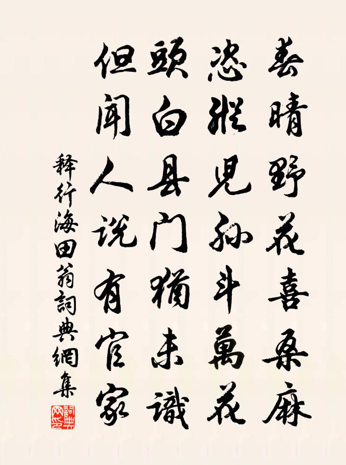 詩詞名句歷史字典書法欣賞書法字典國語詞典說文解字康熙字典古漢語字典標 題 作 者 詩 句 田翁作者:釋行海 朝代:宋代田翁原文春晴野花喜桑麻,恣縱兒孫斗萬花。頭白縣門猶未識,但聞人說有官家。詩詞問答問:田翁的作者是誰?答:釋行海問:田翁寫於哪個朝代?答:宋代釋行海田翁書法欣賞田翁書法作品詩詞推薦次韻楊立之見別蘇頌〔宋代〕梁苑昔傾蓋,膺門嘗贈鞭。幾回留客舍,四紀度星躔。染翰頻穿硯,翻書屢絕編。文章傳累世,功業慕當年。懷寶紹興十年發皇太后冊寶八首佚名〔宋代〕景祚有開,符三婚昊。誕毓聖神,是崇位號。星拱天隋,祗嚴冊寶。還御慈寧,增光舜道。山簡習池陳長方〔宋代〕夷甫清言百不知,山公日醉習家池。晉朝將相元如此,石勒劉淵自奮飛。霅上宴別許渾〔唐代〕山斷水茫茫,洛人西路長。笙歌留遠棹,風雨寄華堂。紅壁耿秋燭,翠簾凝曉香。誰堪從此去,雲樹滿陵陽。驀山溪(元夕詞)毛滂〔宋代〕梅花初謝,雪後寒微峭。誰送一城春,綺羅香、風光窈窕。插花走馬,天近寶鞭寒,金波上,玉輪邊,不是紅塵道轉調定風波(和答海南統領陳康時)胡銓〔宋代〕從古將軍自有真。引杯看劍坐生春。擾擾介鱗何足掃。談笑。綸巾羽扇典刑新。試問天山何日定。佇聽。雅歌長嘯憶秦娥汪元量〔宋代〕雪霏霏。薊門冷落人行稀。人行稀。秦娥漸老,著破宮衣。強將纖指按金徽。未成曲調心先悲。心先悲。更無言語田漏林之奇〔宋代〕古星昏曉中,寒暑已不疑。田家更置漏,寸晷亦欲知。汗與水俱滴,身隨陰屢移。誰當哀此勞,往往奪其時。頌古三十一首釋如本〔宋代〕家世拄杖,佛祖付囑。溈山寄來,香嚴發哭。父子投機,陽春雪曲。不是知音,大難相續。寄姚諫議劉得仁〔唐代〕鳴鞭靜路塵,籍籍諫垣臣。函疏封還密,爐香侍立親。篋多臨水作,窗宿臥雲人。危坐開寒紙,燈前起草頻。休日登千峰榭遇大風雨氣象甚偉陸游〔宋代〕今日逢休沐,憑高且暫閒。風聲初卷野,雨氣已吞山。疾病臨觴嬾,塵埃得句慳。西征忽在眼,河勢抱函關。次韻徐庭珍春日雜言十首陳棣〔宋代〕溪風裊裊素濤翻,兀坐書帷怯悄寒。老去見春如夢寐,此心底用倩人安。句晏殊〔宋代〕一紙短書無寄處,數行征雁入南雲。詠史下慕容恪陳普〔宋代〕霜雹風沙雜亂飛,段龕地下見春歸。時來但處周公位,歷舉華人百世希。游陽府寺金君卿〔宋代〕山肋盤紆一徑斜,水煙深處梵王家。聞雷已薦雞鳴筍,未火先嘗雀舌茶。吟客披雲題石壁,藥僧和露掃松花。縱游次韻廉夫登沮微亭二首傅察〔宋代〕大火枕氣方熾,枕新金伏未枕興。茅屋苦卑陋,蘊毒空自憎。流汗常被體,枕煩屢飲冰。那堪青蠅輩,鼓翅作威稜八聲甘州 次錢思復懷錢唐舊遊韻邵亨貞〔元代〕嘆前朝、勝地正離離,荒草不勝春。縱湖山尚好,泉乾虎跡,井*龍鱗。多少王侯第宅,游賞太平身。車馬經行處和慎思未試即事雜書率用秋日同文館為首句蔡肇〔宋代〕翳翳雲生樹,翻翻風動闈。高秋忽如此,吾黨苦思歸。極目愁關塞,侵寒寄褚衣。少狂真喜事,回首壯心違。次韻謝范黃中運管二絕劉宰〔宋代〕刁塢春回花滿枝,沈溪夢斷水盈池。遙知弔古經行處,落紙雲煙總是詩。春晴書事歐陽修〔宋代〕莫笑青州太守頑,三齊人物舊安閒。晴明風日家家柳,高下樓台處處山。嘉客但當傾美酒,青春終不換頹顏。惟◇名句推薦事窮勢蹙之人,當原其初心;功成行滿之士,要觀其末路。洪應明《菜根譚·概論》 世業事黃老,妙年孤隱淪宋之問《始安秋日》 脫鞍暫入酒家壚,送君萬里西擊胡岑參《送李副使赴磧西官軍》 一聲已動物皆靜,四座無言星欲稀。李頎《琴歌》 隔座送鉤春酒暖,分曹射覆蠟燈紅。李商隱《無題·昨夜星辰昨夜風》 久住令人賤,頻來親也疏。佚名《增廣賢文·上集》 子胥既棄吳江上,屈原終投湘水濱。李白《行路難三首》 止戈為武。左丘明《左傳·宣公·宣公十二年》 可憐白骨攢孤冢,盡為將軍覓戰功。張蠙《吊萬人冢》 松樹千年終是朽,槿花一日自為榮。白居易《放言五首·其五》
