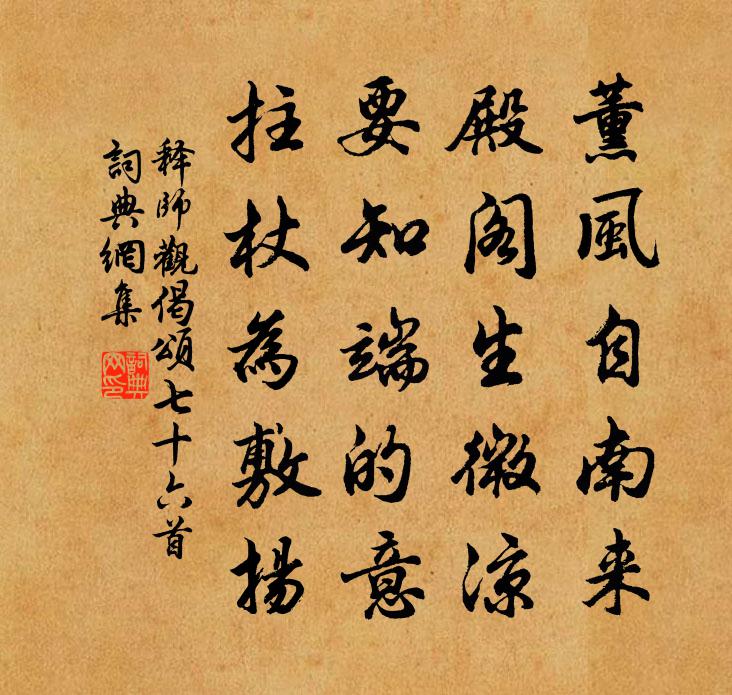 詩詞名句歷史字典書法欣賞書法字典國語詞典說文解字康熙字典古漢語字典標 題 作 者 詩 句 偈頌七十六首作者:釋師觀 朝代:宋代偈頌七十六首原文薰風自南來,殿閣生微涼。要知端的意,拄杖為敷揚。詩詞問答問:偈頌七十六首的作者是誰?答:釋師觀問:偈頌七十六首寫於哪個朝代?答:宋代釋師觀偈頌七十六首書法欣賞偈頌七十六首書法作品詩詞推薦送崔子淵秘丞出守小益二首李流謙〔宋代〕晉安幕府總豪英,末至非才愧長卿。已去化爐金尚躍,更分客袂涕空橫。早催劍棧迎千騎,更借湖山勸一觥。水自海棠陸游〔宋代〕十里迢迢望碧雞,一城晴雨不曾齊。今朝未得平安報,便恐飛紅已作泥。庾樓新歲白居易〔唐代〕歲時銷旅貌,風景觸鄉愁。牢落江湖意,新年上庾樓。頌古一百首釋智愚〔宋代〕夜半三更來討火,我罵你兮你罵我。相喚相呼歸未歸,也有無衣草里坐。新艷白居易〔唐代〕雲環獨揰{右為乖}細蜻蜓,雪手輕柔玳瑁箏。飛鴈一行挑玉柱,十三弦上語嚶嚶。勝勝慢(草詞)趙長卿〔宋代〕濃芳滿地,秀色連天,和煙帶雨萋萋。幾許芳心,還解報得春暉。當時謝郎夢裡,似殷勤、傳與新詩。卻為甚、動如夢令劉望之〔宋代〕休絮。休絮。我自明朝歸去。吏隱宜春郡詩十首祖無擇〔宋代〕吏隱宜春郡,素飱誠有餘。政聲慙遂霸,文藻謝嚴徐。使節分銅虎,仙廬秘石渠。君恩殊未報,不敢賦歸歟。餘杭形勝白居易〔唐代〕餘杭形勝四方無,州傍青山縣枕湖。繞郭荷花三十里,拂城松樹一千株。夢兒亭古傳名謝,教妓樓新道姓蘇。獨有薛廷范從事自宣城至因贈趙嘏〔唐代〕少年從事霍嫖姚,來自楓林度柳橋。金管別筵花灼灼,玉溪回首馬蕭蕭。清風氣調真君輩,知己風流滿聖朝。獨有題許尚書石刻二首姜特立〔宋代〕烏絲玉軸陀尼表,鬥草搴花錦不如。不是向來元佑腳,唐人文字晉人書。聞楊謹仲得車輅院又聞其哭妻有寄趙蕃〔宋代〕得酒不孤酌,有詩仍寄看。親舂聞失伴,執戟報除官。浩蕩皆鷗鷺,翱翔豈鳳鸞。嘗評峽江上,山水似嚴湍。雜曲歌辭羽林行孟郊〔唐代〕朔雪寒斷指,朔風勁裂冰。胡中射鵰者,此日猶不能。翩翩羽林兒,錦臂飛蒼鷹。揮鞭決白馬,走出黃河凌。寄滿粹翁王令〔宋代〕滿子吾逢久,皇皇未見閒。老成終到孔,窮死亦為顏。學術思無際,誠明去一間。吾雖有心者,力苦未能攀。句姚嗣宗〔宋代〕井邑倦炎酷,西岩境獨清。溪路釋文珦〔宋代〕溪路六七里,茅茨三兩家。斷崖懸石髓,古樹有松花。絕壑無人處,看雲到日斜。過山幽更甚,時復見樵車。浪淘沙晏幾道〔宋代〕小綠間長紅。露蕊煙叢。花開花落昔年同。惟恨花前攜手處,往事成空。山遠水重重。一笑難逢。已拼長在別離中句呂午〔宋代〕四時鷗鷺窺圖畫,千古魚龍聽管弦。良辰吳則禮〔宋代〕良辰入奇懷,端欲挽我行。幽花迎人笑,欣然媚柴荊。春醪處處佳,姑瀉濁與清。好鳥何許來,日暮獨一鳴。江山六月二十一日早行十六首吳芾〔宋代〕東望吾廬百裡間,二年別去一朝還。雖然未遂歸休意,且對湖山一解顏。名句推薦出入君懷袖,動搖微風發。班婕妤《怨歌行》 我亦飄零久!顧貞觀《金縷曲二首》 念天地之悠悠,獨愴然而涕下。陳子昂《登幽州台歌》 天下皆知取之為取,而莫知與之為取。范曄《後漢書·列傳·桓譚馮衍列傳上》 霖雨泥我塗,流潦浩縱橫。曹植《贈白馬王彪·並序》 投宿駸駸征騎,飛雪滿孤村。孔夷《南浦·旅懷》 夜發清溪向三峽,思君不見下渝州。李白《峨眉山月歌》 大漠孤煙直,長河落日圓。王維《使至塞上》 萬事莫貴於義。墨子《墨子·47章 貴義》 鄉夢不曾休,惹甚閒愁?忠州過了又涪州。左輔《浪淘沙·曹溪驛折桃花一枝數日零落裹花片投之涪江歌此送之》