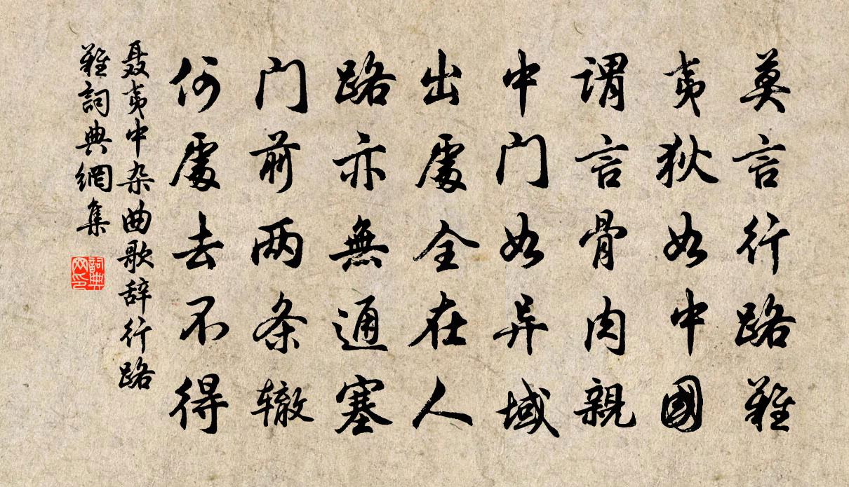 詩詞名句歷史字典書法欣賞書法字典國語詞典說文解字康熙字典古漢語字典標 題 作 者 詩 句 雜曲歌辭。行路難作者:聶夷中 朝代:唐代雜曲歌辭。行路難原文莫言行路難,夷狄如中國。謂言骨肉親,中門如異域。出處全在人,路亦無通塞。門前兩條轍,何處去不得。詩詞問答問:雜曲歌辭。行路難的作者是誰?答:聶夷中問:雜曲歌辭。行路難寫於哪個朝代?答:唐代問:雜曲歌辭。行路難是什麼體裁?答:樂府聶夷中雜曲歌辭。行路難書法欣賞雜曲歌辭。行路難書法作品注釋全唐詩:卷25_58詩詞推薦閒居即事王建〔唐代〕老病貪光景,尋常不下簾。妻愁耽酒僻,人怪考詩嚴。小婢偷紅紙,嬌兒弄白髯。有時看舊卷,未免意中嫌。秋胡行陸機〔魏晉〕道雖一致。塗有萬端。吉凶紛藹。休咎之源。人鮮知命。命未易觀。生亦何惜。功名所勤。 金陵袁說友〔宋代〕青衫往事幾經秋,白首重來憶舊遊。今夜台城無限月,更憑樽酒豁羇愁。聞南軒張先生下世感忱有作孫應時〔宋代〕中原天意定何發,豈謂人才不素儲。前輩老成今殄瘁,丁年豪雋重蕭疏。武侯歲晚出師表,賈誼平生流涕書。社稷答李侍郎嘉定庚長冬這官成都至城外驛侍郎亦崔與之〔宋代〕柏竹老歲寒,梅礬澹春風。邂後萬里橋,相對雙鬢蓬。論心豈無酒,舉盞不忍空。恐渠道旁嗤,咄咄醉頰紅。送以送陳戶曹之官襄陽二首劉克莊〔宋代〕丞相曾多督府謀,郎君今復贊邊籌。彼哉金谷飲長夜,去矣玉關防盛秋。尺度豈能拘快士,功名斷不在中州。習池送張直公歸南鄭拜省岑參〔唐代〕夫子思何速,世人皆嘆奇。萬言不加點,七步猶嫌遲。對酒落日後,還家飛雪時。北堂應久待,鄉夢促征期。展敬文孝廟喻良能〔宋代〕才昔高南國,名今播八紘。英姿留此地,餘澤及編氓。仙去江山在,恩來日月明。經從千載後,款謁薦微誠。和孔教授武仲濟南四詠其一環波亭蘇轍〔宋代〕南山迤邐入南塘,北渚迢嶢枕北牆。過盡綠荷橋斷處,忽逢朱檻水中央。鳧鷖聚散湖光淨,魚鱉浮沉瓦影涼。清境錢君倚學士日本刀梅堯臣〔宋代〕日本大刀色青熒,魚皮帖檽沙點星。東胡腰鞘過滄海,舶帆落越棲灣汀。賣珠入市盡明月,解絛換酒琉璃缾。當壚借虛谷太博狂吟十詩韻書懷並呈太博楊公遠〔宋代〕頭顱搭颯一山翁,萬事隨宜敢諱窮。不結東華塵土夢,何乾北海馬扣風。半生蹤跡從容里,一片襟期冷淡中。兀坐入講論語二首徐元傑〔宋代〕溫溫中旨肅傳宣,魯語書陳誦說專。聖意聿宗伊洛訓,愚臣謹繹考亭編。寸心普物根源地,百拜承顏咫尺天。堯舜天竺冬夜釋行海〔宋代〕白雲寂寂樹蒼蒼,夜靜泉聲到石房。淡月照窗寒夢醒,枕邊聞得野梅香。和韓無咎使君吊李謫仙章甫〔宋代〕力士能令妃子嗔,長安無復謫仙人。宮袍卻換江東酒,野乳終為帝外臣。孤冢道旁空怨結,兩峰煙際自愁顰。騎鯨和此陽先生感興詩二十首劉黻〔宋代〕交遊重金石,里巷毋泛尋。胸中抱明鏡,妍醜不相侵。熱交但以貌,冷交惟其心。勢利易苟合,道義難力任。詠春傾杯樂(寵慶主人壽,代作)林季仲〔宋代〕璧月初圓,彩雲輕護,散雪疊冰涼館。張眉競巧,趙瑟新成,整頓戲衫歌扇。壽酒殷勤,嬌語溫柔,只愁杯淺。正哭龐京兆(少年有俊氣,常擢制科之首)劉禹錫〔唐代〕俊骨英才氣褎然,策名飛步冠群賢。逢時已自致高位。得疾還因倚少年。天上別歸京兆府,人間空數茂陵阡。今朝偈頌九十三首釋梵琮〔宋代〕一切即一,一即一切。者也之乎,雞豚狗彘。驀忽擘破麵皮,喝退德山臨濟。黃檗施財,甘贄密契。財法二施,等避暑江瀆祠池宋祁〔宋代〕溪淺容篙短,舟移覺岸長。煙稠芰荷葉,霞熱荔支房。技疊參撾鼓,杯寒十饋漿。便成逃暑醉,官事底相妨。題錢可則芡雪庵高斯得〔宋代〕我家雪山下,結茅幾度秋。一朝劫火燎,身墮江南州。相逢芡雪君,感慨不能休。我今如喪狗,狂走長包羞。子幸名句推薦喪雖有禮,而哀為本焉。墨子《墨子·02章 修身》 愁顏與衰鬢,明日又逢春。戴叔倫《除夜宿石頭驛》 蕭蕭落木不勝秋,莫回首、斜陽下。納蘭性德《一絡索·過盡遙山如畫》 重五山村好,榴花忽已繁。陸游《乙卯重五詩》 共眠一舸聽秋雨,小簟輕衾各自寒。朱彝尊《桂殿秋·思往事》 晚妝初了明肌雪,春殿嬪娥魚貫列。李煜《木蘭花·晚妝初了明肌雪》 寵辱不驚,肝木自寧陳繼儒《小窗幽記·集靈篇》 鞠躬盡瘁,死而後已。諸葛亮《後出師表》 惟天下至誠,為能盡其性。宋祁、歐陽修、范鎮、呂夏卿等《新唐書·列傳·卷八十二》 枕前淚共階前雨,隔個窗兒滴到明。聶勝瓊《鷓鴣天·別情》
