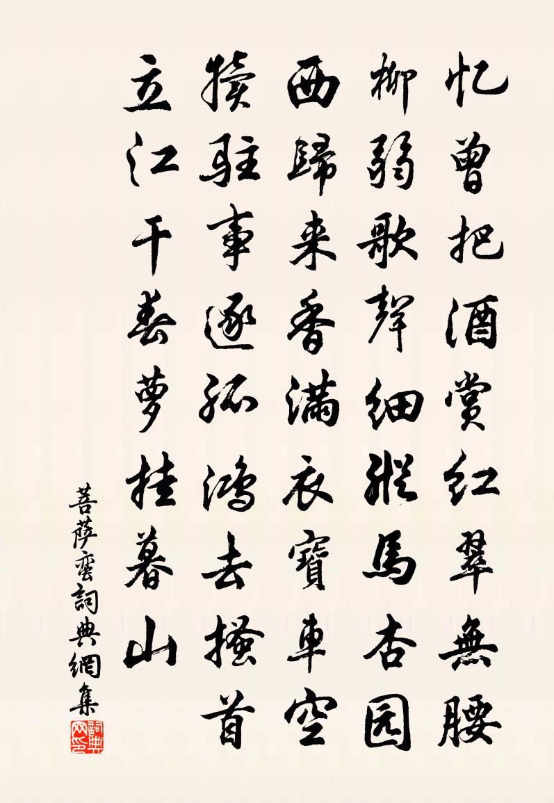 詩詞名句歷史字典書法欣賞書法字典國語詞典說文解字康熙字典古漢語字典標 題 作 者 詩 句 菩薩蠻作者:佚名 朝代:宋代菩薩蠻原文憶曾把酒賞紅翠。無腰柳弱歌聲細。縱馬杏園西。歸來香滿衣。寶車空犢駐。事逐孤鴻去。搔首立江乾。春蘿掛暮山。詩詞問答問:菩薩蠻的作者是誰?答:佚名問:菩薩蠻寫於哪個朝代?答:宋代問:佚名的名句有哪些?答:佚名名句大全佚名菩薩蠻書法欣賞菩薩蠻書法作品詩詞推薦詠水精韋應物〔唐代〕映物隨顏色,含空無表里。持來向明月,的皪愁成水。端午貼子詞皇后閣五首周麟之〔宋代〕甘霔令年慶禱祈,屏除葷茹與君齊。化行自是恩波遠,何止春郊雨一犁。運庵先師贊釋智遇〔宋代〕行腳祗參松源,早是信卜賣屋。更說東山正傳,大似老馬嚼粟。近人情,無面目,引得兒孫阿轆轆。報恩盡力讚揚句容縣東青陽館作李嘉祐〔唐代〕句曲千峰暮,歸人向遠煙。風搖近水葉,雲護欲晴天。夕照留山館,秋光落草田。征途傍斜日,一騎獨翩翩。感皇恩 述懷舒遜〔元代〕疏雨滴清秋,洗殘流火,爽動涼飆透簾幕。寒蛩吟徹,誰道小□蕭索。青鐙相伴,我情依約。螢照更殘,鳥啼月落江樓趙希逢〔宋代〕一帶江流接太虛,危樓特地幻荒蕪。移來瀛丈三山勝,畫出瀟湘八景圖。何處歸帆隨倦鳥,滿汀落日照晴鳧。須臾【中呂】粉蝶兒北貫雲石〔元代〕描不上小扇輕羅,你便是真蓬萊賽他不過,雖然是比不的百二山河。一壁廂嵌平堤,連綠野,端的有亭台百座。暗詠李(一作太宗詩)董思恭〔唐代〕盤根植瀛渚,交乾橫倚天。舒華光四海,卷葉蔭山川。木蘭花慢 秋詞張雨〔元代〕看秋容漸好,一番雨,一番涼。試點檢吾家,小山叢桂,金粟都黃。濤江限他吳越,便胥魂、不似向時狂。眼底龍策杖陸游〔宋代〕山翁老病入腰膂,坐覺諸兒行步奔。暫出衡門須策杖,千回上樹更堪論!柄生日鄒浩〔宋代〕 * 中見老人,禪光垂照喜生春。身如龜鶴心如石,進德功夫常日新。梅花喜神譜大開一十四枝宋伯仁〔宋代〕西施無限愁,後人何必佼。只好笑呵呵,不損紅妝貌。送僧游五台貫休〔唐代〕羨師游五頂,乞食值年豐。去去誰為侶,棲棲力已充。濁河高岸拆,衰草古城空。必到華嚴寺,憑師問辨公。喜遷鶯(自池陽泛舟)李綱〔宋代〕江天霜曉。對萬頃雪浪,雲濤氵彌渺遠岫參差,煙樹微茫,閱盡往來人老。淺沙別浦極望,滿目餘霞殘照。暮雲斂和南湖史君煙景墨梅圖陳深〔宋代〕依約羅浮翠嶺前,美人玉立破蒼煙。盡圖未許分明見,一枝春風入夢先。次韻陳德用明府贈別之什張元乾〔宋代〕人欺季子幣貂裘,誰信班生萬里侯。小隱故山今去好,中原遺恨幾時休。春爭殘臘寒梅早,雨澀晴冬宿麥憂。老眼孔子誦佚名〔先秦〕麛裘面鞞。投之無戾。鞞之麛裘。投之無郵。袞衣章甫。實獲我所。章甫袞衣。惠我無私。重慶閫治十詠集思堂李曾伯〔宋代〕先以一誠格,斯能眾正招。要來堂下蔑,勿狥帳中超。程子云欲還鄉阻雨聊戲之陳文蔚〔宋代〕霏霏小雨釀梅黃,結束琴收底用忙。已幸一春鄰絳帳,祗今十日是端陽。榴花照眼新篁翠,盧橘盈盤煮酒香。天識春日郊行釋紹嵩〔宋代〕稠花亂蕊裹江濱,小雨疏疏向晚晴。逋客未能忘野興,春來無處不閒行。名句推薦君不見管鮑貧時交,此道今人棄如土。杜甫《貧交行》 木葉紛紛下,東南日煙霜。劉昚虛《暮秋揚子江寄孟浩然》 一叫一迴腸一斷,三春三月憶三巴。李白《宣城見杜鵑花 / 子規》 吹到一片秋香,清輝了如雪。納蘭性德《琵琶仙·中秋》 聽元宵,今歲嗟呀,愁也千家,怨也千家。王磐《古蟾宮·元宵》 置酒望白雲,商飆起寒梧。李白《登單父陶少府半月台》 不辭山路遠,踏雪也相過。張九齡《答陸澧》 有熊有羆,有貓有虎,慶既令居,韓姞燕譽。佚名《韓奕》 四百年來成一夢,堪愁。王安石《南鄉子·自古帝王州》 東風兮東風,為我吹行雲使西來。李白《久別離》