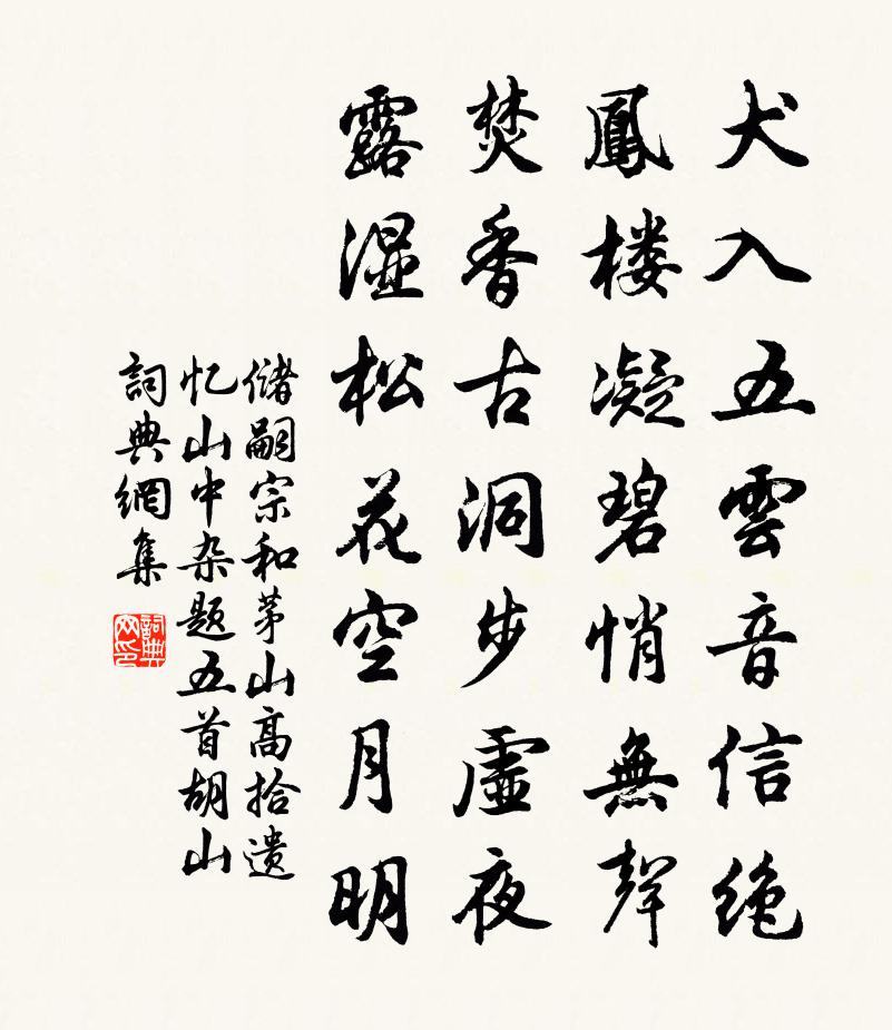 詩詞名句歷史字典書法欣賞書法字典國語詞典說文解字康熙字典古漢語字典標 題 作 者 詩 句 和茅山高拾遺憶山中雜題五首。胡山作者:儲嗣宗 朝代:唐代原文犬入五雲音信絕,鳳樓凝碧悄無聲。焚香古洞步虛夜,露濕松花空月明。詩詞問答問:《和茅山高拾遺憶山中雜題五首。胡山》的作者是誰?答:儲嗣宗問:該詩寫於哪個朝代?答:唐代書法欣賞和茅山高拾遺憶山中雜題五首。胡山書法作品注釋全唐詩:卷594-10詩詞推薦將之匡岳過尋陽齊己〔唐代〕帆過尋陽晚霽開,西風北雁似相催。大都浪後青堆沒,五老雲中翠疊來。此路便堪歸水石,何門更合向塵埃。遠公途中偶成寄幕下諸公張嵲〔宋代〕曠朗高天淨,蟬鳴江漢秋。川晴山歷歷,身遠意悠悠。落日慘行子,長風欺弊裘。郡樓今夜月,應從庾公游。秋送夏郢歸錢塘貫休〔唐代〕歸客指吳國,風帆幾日程。新詩陶雪字,玄發有霜莖。微月生滄海,殘濤傍石城。從茲江島意,應續子陵名。再用前韻各賦三解吳潛〔宋代〕九天膏澤沛群方,盡掃螟蝗蝥蟘殃。即刻焦煩成爽塏,何時繁富換荒涼。滌場定是多遺秉,棲畝爰知有剩糧。卻笑吟社遞至詩卷足十四韻以答之為梅水村發也趙必象〔宋代〕蕭艾穢群芳,草木紛零落。梅花我輩人,例合束高閣。雷塘晚歸王珪〔唐代〕塘梢黯黯夕雲低,蒼莽荒原望四迷。海日光寒銜島樹,江潮聲暴壓城鼙。喬林風勁橫鵰眼,淺草霜乾快馬蹄。戰血用從軍古雲樂為韻賀楊覺甫乾李曾伯〔宋代〕求士近取材,論人遠稽古。鄭公得杜陵,晉公有韓愈。上思利社稷,下不愧賓主。斯言宜服膺,餘子未足數。喜雪二首曾鞏〔宋代〕欲休還舞任風吹,斷續繁雲作陣隨。已塞茅蹊人起晚,更迷沙渚鳥飛遲。混同天地歸無跡,潤色山川入有為。太守走答明略適堯民來相約奉謁故篇未及之黃庭堅〔宋代〕君不見生不願為牛後,寧為雞口。吾聞向來得道人,終古不忒如維斗。希價鹹陽諸少年,可推令往挽令還。俗學風小絕句張埴〔宋代〕解貂換美酒,半與美人醉。留半伴山翁,夜深談世事。次韻贈趙豈卿吟嘯公之孫乃父亦能詩方回〔宋代〕大門祖父昔聞聲,交臂差池恨晚生。欲與萬山修郡志,誰能三世擅詩名。故知龍頷無魚目,更覺松心異舜英。字穩春晚陸游〔宋代〕雨足人家插稻秧,蠶生鄰女採桑黃。萬花掃跡春將暮,百草吹香日正長。閒覓啼鶯穿北崦,戲隨飛蝶過東岡。飄然水龍吟丘處機〔元代〕春興昊天空闊初晴,氣回萬物欣欣茂。亭台俯仰,山川高下,妝成錦繡。碧洞清泉,響聞迢遞,一聲長溜。更時時夜意陸游〔宋代〕孤夢初回夜氣清,世塵掃盡覺心平。月沉洲渚漁歌遠,人語比鄰績火明。獨汲寒泉鳴細綆,靜聽漏鼓下高城。悠然雪聲王銍〔宋代〕飛滿前村夜不知,憑風聲與靜相宜。銀釭志士詩成後,玉枕佳人夢覺詩。乍聽打窗投米急,想同糝徑落梅遲。孤舟雙檜堂為魯聖可行可賦林景熙〔宋代〕魚頭公子冰雪姿,根柢忠信華文辭。乃翁手植豈無意,貞固已作層霄期。氣含芝術體松柏,容成山下神仙宅。清陰送薛蔓應舉王建〔唐代〕四海重貢獻,珠贐稱至珍。聖朝開禮闈,所貴集嘉賓。若生在世間,此路出常倫。一士登甲科,九族光彩新。憧憧長相思 秋夜汪斌〔元代〕海蟾升。砌蛩鳴。別院俄聞裂帛聲。憑軒與細聽。竹風生。桂香清。問道小山來未曾。還應尋舊盟。破屋頌示眾釋印肅〔宋代〕一個閒身穿破屋,風吹雨滴轉光明。燈籠露柱時時舉,只道以平報不平。琉璃殿上鞭金馬,追風不及三腳驢。山水圖王冕〔元代〕雲氣籠陰隔荔蘿,吾家曾住石南坡。秋風繞屋樹聲雜,夜雨落山溪水多。每有漁樵共談笑,且無車馬得經過。京師名句推薦更落盡梨花,飛盡楊花,春也成憔悴。汪元量《鶯啼序·重過金陵》 燕歸花謝,早因循、又過清明。納蘭性德《紅窗月·燕歸花謝》 不知香積寺,數里入雲峰王維《過香積寺》 只願君心似我心,定不負相思意。李之儀《卜運算元·我住長江頭》 梁園日暮亂飛鴉,極目蕭條三兩家。岑參《山房春事二首》 驚風飄白日,忽然歸西山曹植《贈徐幹詩》 寒禽與衰草,處處伴愁顏。司空曙《賊平後送人北歸》 浮雲不系名居易,造化無為字樂天李忱《吊白居易》 楚鄉飛鳥沒,獨與碧雲還。錢起《送夏侯審校書東歸》 春山煙欲收,天淡星稀小牛希濟《生查子·春山煙欲收》