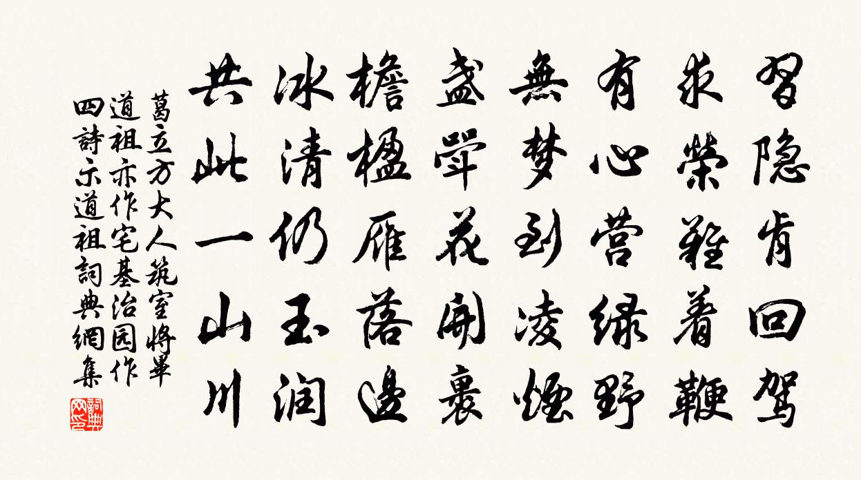 詩詞名句歷史字典書法欣賞書法字典國語詞典說文解字康熙字典古漢語字典標 題 作 者 詩 句 大人築室將畢道祖亦作宅基治園作四詩示道祖作者:葛立方 朝代:宋代原文習隱肯回駕,求榮難著鞭。有心營綠野,無夢到凌煙。盞斝花開裹,檐楹雁落邊。冰清仍玉潤,共此一山川。詩詞問答問:《大人築室將畢道祖亦作宅基治園作四詩示道祖》的作者是誰?答:葛立方問:該詩寫於哪個朝代?答:宋代書法欣賞大人築室將畢道祖亦作宅基治園作四詩示道祖書法作品詩詞推薦壽楊廣文六十解組南還時署邑篆事孫銳〔宋代〕五載琴堂奏未央,烏紗紫綬鬢蒼蒼。三鱣已集弘農兆,五柳仍分彭澤芳。廉石一車歸吏部,清風兩袖付中郎。山間奉送賈侍御使江外岑參〔唐代〕新騎驄馬復承恩,使出金陵過海門。荊南渭北難相見,莫惜衫襟著酒痕。題麗句亭葛紹體〔宋代〕玉謝風流盟未寒,枝藤杯酒翠微間。松花半落春山暮,雲滿一溪春水閒。春日即事四絕王炎〔宋代〕年少逢春喜欲狂,長年心事易淒涼。胸中不可無今古,坐閱陳編自炷香。杜山自遣戴復古〔宋代〕世事茫茫心事灰,眾人爭處我驚回。閉門不管花開落,避俗唯通燕往來。富貴在天求不得,光陰轉地老相催。平生孤山寺林逋〔宋代〕雲峰水樹南朝寺,祇隔叢篁作並鄰。破殿靜披虀臼古,齋房閒試酷奴春。白公睡閣幽如畫,張祜詩牌妙入神。乘興聞鄰寺粥陳起〔宋代〕寒釭旋擿動冥搜,泓玉摩研萬象愁。鐵版響廊催早粥,銅壺添水易新籌。一聲雞唱驚殘夢,再聽鴉群過小樓。可惜汀沙王安石〔宋代〕汀沙雪漫水溶溶,睡鴨殘蘆晻靄中。歸去北人多憶此,每家圖畫有屏風。再游卞氏園亭韓維〔宋代〕多謝春風意,殘芳得我游。綠陰人去遠,翠竹鳥啼幽。醉舞紛無次,狂歌漫不收。林間簇車馬,欲去尚遲留。桃源憶故人史達祖〔宋代〕雙鴛蹙月天津近。歸後嫩情常剩。燈市一年愁凝。心共梅花冷。網塵洞戶春沈靜。衰盡冶遊情性。羞見素娥嬌影。無衣一首招黃任道歸王令〔宋代〕豈曰無衣,不能素裳。縫齊有鏘,直韍以方。豈曰無衣,不能素履。絇以為戒,夙夜以無怠。素裳戔戔,誰涉不褰送矩上人董嗣杲〔宋代〕單懸淮楚寺,裓染歲時塵。踏雪歸何處,看雲悟此身。三乘新見性,一缽晚隨人。江北蕭條甚,還期莫待春。上丹霄 答隴州防禦裴滿鎮國丘處機〔元代〕厭塵勞,拋家計,慕清閒。向物外、觀照人間。須臾變滅,蜃樓歌側海濤翻。暫時光景,轉身休、百歲如彈。掀天句司馬光〔宋代〕雨濕蓼花千穗紅。寄劉汝一陳天予吳芾〔宋代〕昔年言路記同游,回首那知歲月流。已嘆數公隨物化,卻欣二老與餘留。去天不謂逾三歲,補外那知尚一州。想得阮郎歸張掄〔宋代〕寒來暑往幾時休。光陰逐水流。浮雲身世兩悠悠。何勞身外求。天上月,水邊樓。須將一醉酬。陶然無喜亦無憂。子瞻去歲春侍立邇英子由秋冬間相繼入侍作詩黃庭堅〔宋代〕胸蟠萬卷夜光寒,筆倒三江硯滴乾。大似不蒙稽古力,只今猶著侍臣冠。白下徐照〔宋代〕白下嚴州近,崎嶇昔未經。年豐山米賤,溪涸石苔腥。一月無新句,千岑役瘦形。人家今畏虎,未晚戶先扃。聽月樓冷應澂〔宋代〕聽月樓高接泰清,樓高聽月最分明。轉空軋軏冰輪響,搗藥叮噹玉杵鳴。樂奏廣寒音細細,斧侵丹桂韻丁丁。更須關中言懷黃滔〔唐代〕三秦五嶺意,不得不依然。跡寓枯槐曲,業蕪芳草川。花當落第眼,雨暗出城天。層閣浮雲外,何人動管弦。名句推薦文章本天成,妙手偶得之。陸游《文章》 今施人薄而望人厚,則人唯恐其有賜於己也。墨子《墨子·49章 魯問》 天外鳳凰誰得髓?無人解合續弦膠。杜牧《讀韓杜集》 資之深,則取之左右逢其原。孟子《孟子·離婁章句下·第十四節》 增冰峨峨,飛雪千里些。屈原《招魂》 黃花本是無情物,也共先生晚節香。于謙《過菊江亭》 畫樓春早,一樹桃花笑。凌廷堪《點絳唇·春眺》 白雪卻嫌春色晚,故穿庭樹作飛花。韓愈《春雪》 搖盪春風媚春日,念爾零落逐風飈,徒有霜華無霜質。鮑照《梅花落·中庭多雜樹》 是無貓邪,是不會蓄貓也。樂鈞《世無良貓》