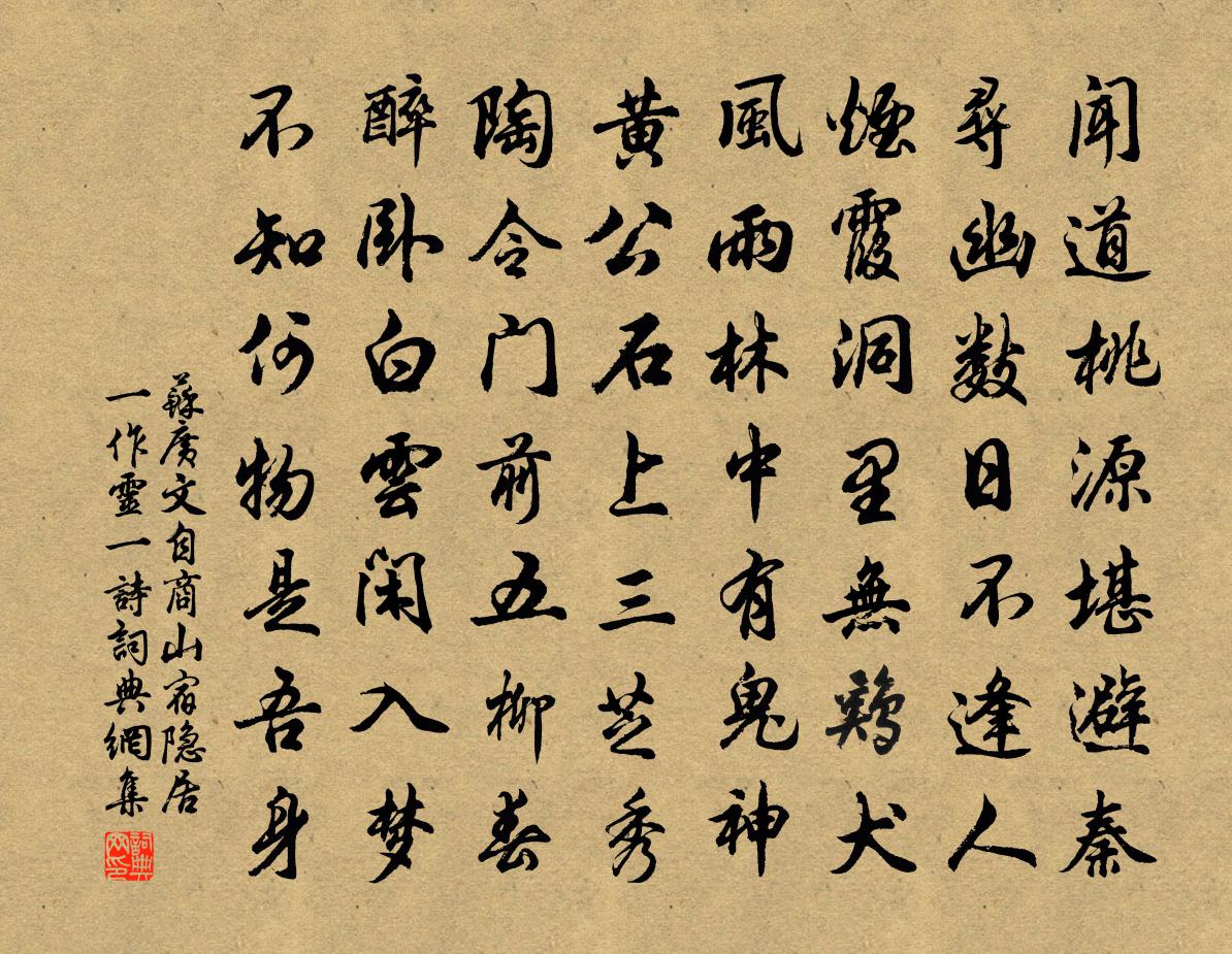 詩詞名句歷史字典書法欣賞書法字典國語詞典說文解字康熙字典古漢語字典標 題 作 者 詩 句 自商山宿隱居(一作靈一詩)作者:蘇廣文 朝代:唐代原文聞道桃源堪避秦,尋幽數日不逢人。煙霞洞裡無雞犬,風雨林中有鬼神。黃公石上三芝秀,陶令門前五柳春。醉臥白雲閒入夢,不知何物是吾身。詩詞問答問:《自商山宿隱居(一作靈一詩)》的作者是誰?答:蘇廣文問:該詩寫於哪個朝代?答:唐代書法欣賞自商山宿隱居(一作靈一詩)書法作品注釋全唐詩:卷783-11詩詞推薦贈李道士蘇軾〔宋代〕世人只數曹將軍,誰知虎頭非痴人。腰間大羽何足道,頰上三毛自有神。平生狎侮諸公子,戲著幼輿岩石里。故教初過白溝北望燕山蘇頌〔宋代〕青山如壁地如盤,千里耕桑一望寬。虞帝肇州疆域廣,漢家封國冊書完。因循天寶興戎易,痛惜雍熙出將難。今日哨遍·高祖還鄉睢景臣〔元代〕社長排門告示,但有的差使無推故,這差使不尋俗。一壁廂納草也根,一邊又要差夫,索應付。又是言車駕,都說題崔逸人山亭錢起〔唐代〕藥徑深紅蘚,山窗滿翠微。羨君花下酒,蝴蝶夢中飛。呈住山介石葉林〔宋代〕造物有青眼,名山無赧容。聲名動猿鶴,道法伏菟龍。望氣從關尹,瞻雲自華封。懸知仙隱地,可以不迎逢。至揚州文天祥〔宋代〕吾戴吾頭向廣陵,仰天無告可憐生。爭如負命投東海,猶會乘風近玉京。用餘子畏韻其詩有警句雲若知瓦礫真成道便覺陳藻〔宋代〕少長城闉老一村,平生好語不曾聞。百年馬鬣空埋我,三載鰲頭更祝君。幸有鄰僧分隙地,豈無座主識雄文。須臾示丁都院釋崇岳〔宋代〕鑊湯爐炭三禪樂,劍樹刀出大覺場。此日撥開心地印,了無佛法可商量。比以補陀刻寄少馮有詩復答之並楊吉老釋介然吳則禮〔宋代〕吾以無作語,刊彼月面背。遣似呂南山,未要餘子會。平生太玄雄,猶有一語在。只憐粥飯和,已復不驚怪。和陶飲酒二十首蘇軾〔宋代〕我夢入國小,自謂總角時。不記有白髮,猶誦論語辭。人間本兒戲,顛倒略似茲。惟有醉時真,空洞了無疑。墜車之南豐道上寄介甫曾鞏〔宋代〕應逮冒煩暑,驅馳山水間。泥泉沃渴肺,沙風吹汗顏。疲驂喘沫白,殆仆負肩殷。仰嗟旱雲高,俯愛芳陂潺。空郵浮梁范成大〔宋代〕大灘石如林,小灘石如櫱。微生拋擲過,兩槳砉將割。一灘復一灘,食頃經七八。崎嶇幸脫免,已足凋鬢髮。我家廟宇傍河彷佛家居施樞〔宋代〕合是清溪近處居,在官卻與在家如。柳風拂岸時鳴櫓,梅月橫窗夜讀書。休問舟閒無喚渡,須知水到自成渠。俸錢偈頌七十六首釋師範〔宋代〕萬籟沉沉,孤月團團。葉零零兮山瘦,風蕭蕭兮夜寒,不知誰共倚欄乾。蔣侯神歌溫庭筠〔唐代〕楚神鐵馬金鳴珂,夜動蛟潭生素波。商風颳水報西帝,廟前古樹蟠白蛇。吳王赤斧斫雲陣,畫堂列壁叢霜刃。巫娥送靈澈上人還越中劉長卿〔唐代〕禪客無心杖錫還,沃洲深處草堂閒。身隨敝屨經殘雪,手綻寒衣入舊山。獨向青溪依樹下,空留白日在人間。那堪初春幽居陸游〔宋代〕滿榼芳醪手自攜,陂湖南北埭東西。茂林處處見松鼠,幽圃時時聞竹雞。零落斷雲斜鄣日,霏微過雨未成泥。老民答葛公綽蔡襄〔宋代〕山堂爭似草堂清,俗事隨人百種名。賴有四窗春茗在,甌中時看白雲生。偈釋梵卿〔宋代〕春已暮,落花紛紛下紅雨。南北行人歸不歸,千林萬林鳴杜宇。我無受獎兮何處歸,十方剎土奚相依。老夫有個真三用韻酬諸丈方岳〔宋代〕家在江南黃葉村,歸來重葺柳邊門。溪雲振闥硯猶濕,山溜通池水自喧。但得梅花容著語,無煩桃葉為開尊。逢迎名句推薦我居北海君南海,寄雁傳書謝不能。黃庭堅《寄黃幾復》 蒼旻霽涼雨,石路無飛塵。岑參《暮秋山行》 知人者智,自知者明。勝人者有力,自勝者強。老子《老子·道經·第三十三章》 欲寄書如天遠,難銷夜似年長。賀鑄《西江月·攜手看花深徑》 事非宜,勿輕諾。苟輕諾,進退錯。李毓秀《弟子規·信》 不可以身相得見如來。鳩摩羅什譯《金剛經·如理實見》 閒雲潭影日悠悠,物換星移幾度秋。王勃《滕王閣序》 權衡損益,斟酌濃淡。芟繁剪穢,弛於負擔。劉勰《文心雕龍·熔裁》 曉戰隨金鼓,宵眠抱玉鞍。李白《塞下曲六首·其一》 草秀故春色,梅艷昔年妝。李世民《元日》