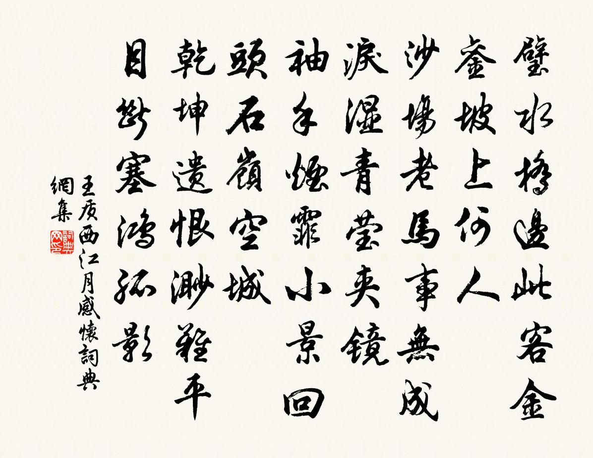 詩詞名句歷史字典書法欣賞書法字典國語詞典說文解字康熙字典古漢語字典標 題 作 者 詩 句 西江月(感懷)作者:王質 朝代:宋代西江月(感懷)原文璧水橋邊此客,金鑾坡上何人。沙場老馬事無成。淚濕青瑩夾鏡。袖手煙霏小景,回頭石嶺空城。乾坤遺恨渺難平。目斷塞鴻孤影。詩詞問答問:西江月(感懷)的作者是誰?答:王質問:西江月(感懷)寫於哪個朝代?答:宋代問:西江月(感懷)是什麼體裁?答:詞王質西江月(感懷)書法欣賞西江月(感懷)書法作品詩詞推薦獨坐朱淑真〔宋代〕捲簾待明月,拂檻對西風。夜氣涵秋色,瑤河浸碧空。草根鳴蟋蟀,天外叫冥鴻。幾許舊時事,今宵誰與同?詠鳳夏竦〔宋代〕千仞翱翔覽德輝,成湯解網四靈歸。梧桐欲下還驚去,悄悄飢鷹掠樹飛。題西湖山岩二首林票〔宋代〕咫尺移文喚即應,此亭便可配韓亭。溪流橫過一灣碧,山色平分兩岸青。落日鐘聲鳴遠樹,半空塔影倒寒汀。雲煙登紫翠樓陸游〔宋代〕水落溪聲壯,天寒山色奇。殘雲宿虛閣,馴鷺下清池。簿領消豪氣,功名負聖時。憑高不勝嘆,神武迫歸期。和人雜詠六首衛宗武〔宋代〕幾年抱渴襟,既見名副實。擬為嵇阮交,愧匪秦晉匹。風翮翔空冥,遠避弋與畢。污世待澄清,其可事一室。送趙紫芝入金陵幕薛師石〔宋代〕為官亦僦居,官況定何如。昨夜交遊散,滿湖秋雨疎。此邦佳麗久,舊事拜參初。喜是賢侯幕,新年有薦書。獨坐絕句二首陸游〔宋代〕輕雷不成雨,闕月卻穿雲。獨倚南齋柱,長吟到夜分。逸再為婺女之行既別出郭矣夜不能寐成六絕句趙蕃〔宋代〕茲行為謝時衡岳,並與傳聲呂法曹。汝解事賢其自勉,我因求友不妨高。洛岸春行二首張耒〔宋代〕南山晴翠入波光,一派溪聲繞郭長。最愛早春沙岸暖,袞風輕浪拍鴛鴦。侄安節遠來夜坐三首蘇軾〔宋代〕心衰面改瘦崢嶸,相見惟應識舊聲。永夜思家在何處,殘年知汝遠來情。畏人默坐成痴鈍,問舊驚呼半死生。夢斷仲明留少城未還予將歸矣留詩別之李流謙〔宋代〕判袂四十日,望君君不來。過門先問訊,立馬屢徘徊。正坐牽歸夢,無緣把別杯。鶴山果西去,會面更悠哉。讀本朝史有感十首項安世〔宋代〕非獨蘇仙念老窮,古靈亦復豐孤跨。白頭不得諸公力,惟有西塘八十翁。江際鄭谷〔唐代〕杳杳漁舟破暝煙,疏疏蘆葦舊江天。那堪流落逢搖落,可得潸然是偶然。萬頃白波迷宿鷺,一林黃葉送殘蟬。兵車丁元珍輓詞二首曾鞏〔宋代〕翰墨金聲遠,神情玉氣溫。節廉貧愈見,風義老彌惇。舊學資詳正,新儀屬討論。誰憐一麾出,終不反修門。寄何崇丘員外齊己〔唐代〕門底桃源水,涵空復映山。高吟煙雨霽,殘日郡樓間。變俗真無事,分題是不閒。尋思章岸見,全未有年顏。朝歸生日女洸有詩因次韻陳著〔宋代〕老爺不記汝生辰,一見杯盤便是春。兄姊味言兒記取,同胞皆是讀書身。紹興朝會十三首佚名〔宋代〕八音克諧,萬舞有奕。上公奉觴,率茲百辟。聲效呼嵩,祝聖人壽。億截萬年,天長地久。江南旅情祖詠〔唐代〕楚山不可極,歸路但蕭條。海色晴看雨,江聲夜聽潮。劍留南斗近,書寄北風遙。為報空潭橘,無媒寄洛橋。頌古五首洗缽盂釋文準〔宋代〕之乎者也,衲僧鼻孔,大頭向下。若也不會,問取東林王大姐。戲效屏山書齋十詠劉克莊〔宋代〕雪螢貧士眼,珠翠貴人身。自從牆角棄,無復案頭親。名句推薦柔情似水,佳期如夢,忍顧鵲橋歸路。秦觀《鵲橋仙·纖雲弄巧》 終罷斯結廬,慕陶直可庶。韋應物《東郊》 佯愛人,不得復憎也;佯憎人,不得復愛也。韓非及後人《韓非子·外儲說右下》 雨雪自飛千嶂外,榆林只隔數峰西。朱彝尊《出居庸關》 花紅易衰似郎意,水流無限似儂愁。劉禹錫《竹枝詞·山桃紅花滿上頭》 何處征帆木末去,有時野鳥沙邊落。吳潛《滿江紅·豫章滕王閣》 敗荷零落,衰楊掩映,岸邊兩兩三三,浣沙游女。柳永《夜半樂·凍雲黯淡天氣》 日光寒兮草短,月色苦兮霜白。李華《弔古戰場文》 永憶江湖歸白髮,欲回天地入扁舟。李商隱《安定城樓》 夫兩貴之不能相事,兩賤之不能相使,是天數也。荀子《荀子·王制》